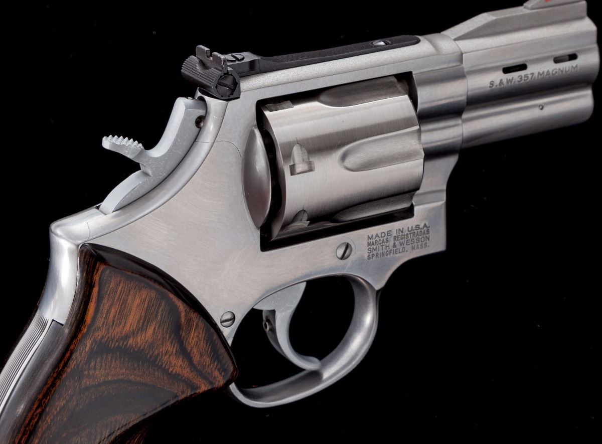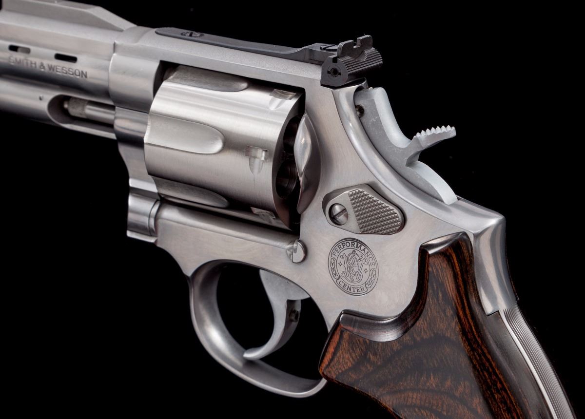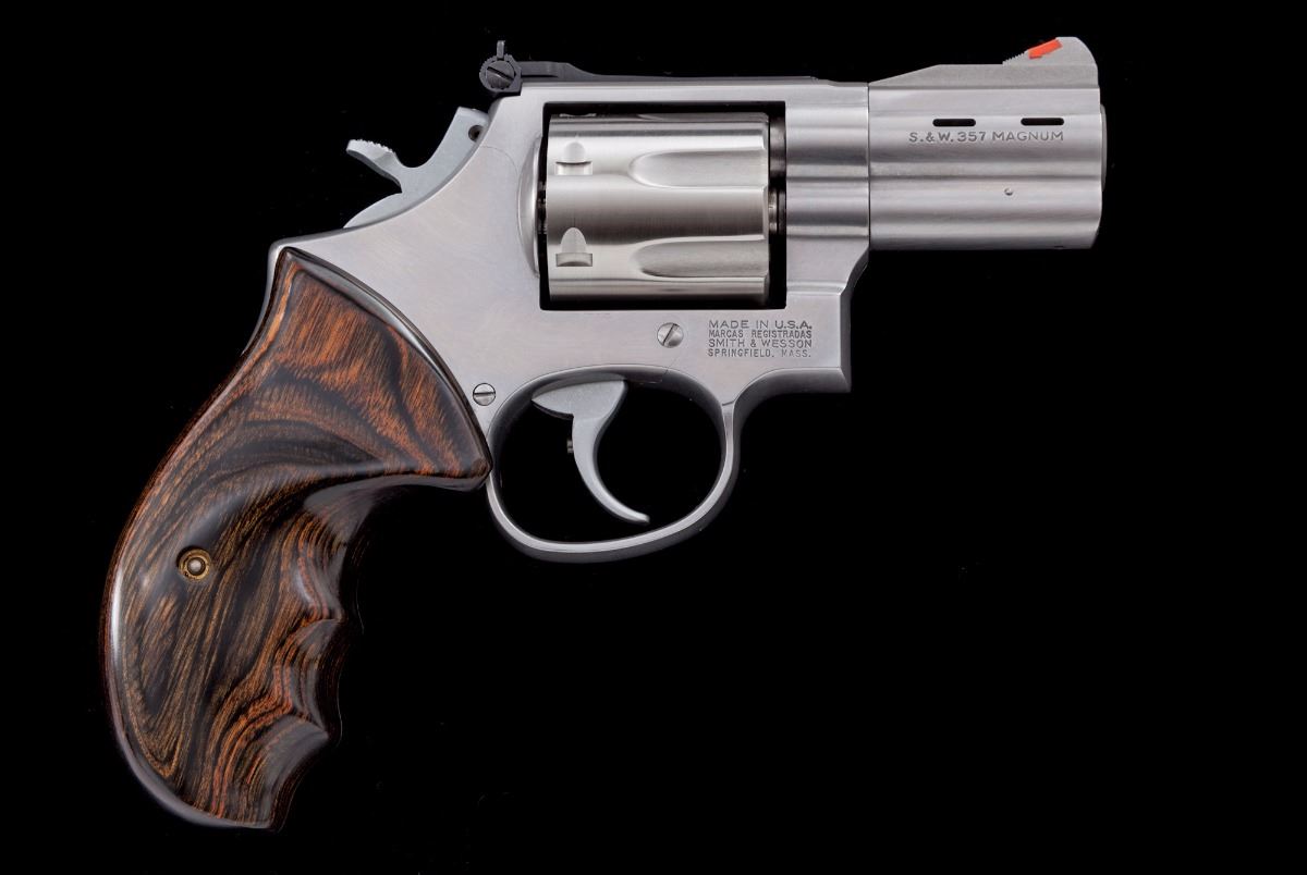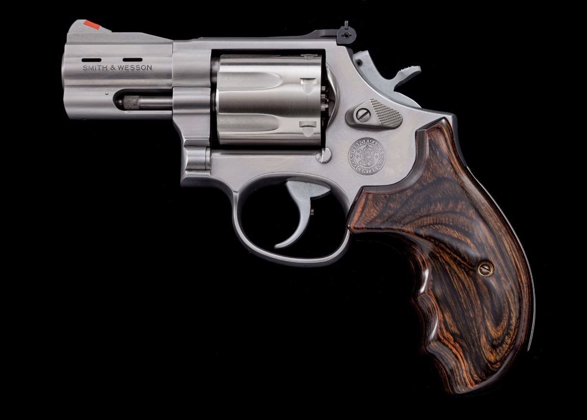 Smith & Wesson Performance Center Model 686-4 Double Action Revolver, #SDL0276, .357 mag. cal., 2-1/2'' ported barrel, stainless steel, laminate wood grips, checkered hammer, red ramp front sight and adjustable notched rear sight. Condition is excellent. Metal surfaces with general fine micro-scratching. Grips are like. Action is crisp, bore is bright. Est.: $600-$800. (Modern/PPT)