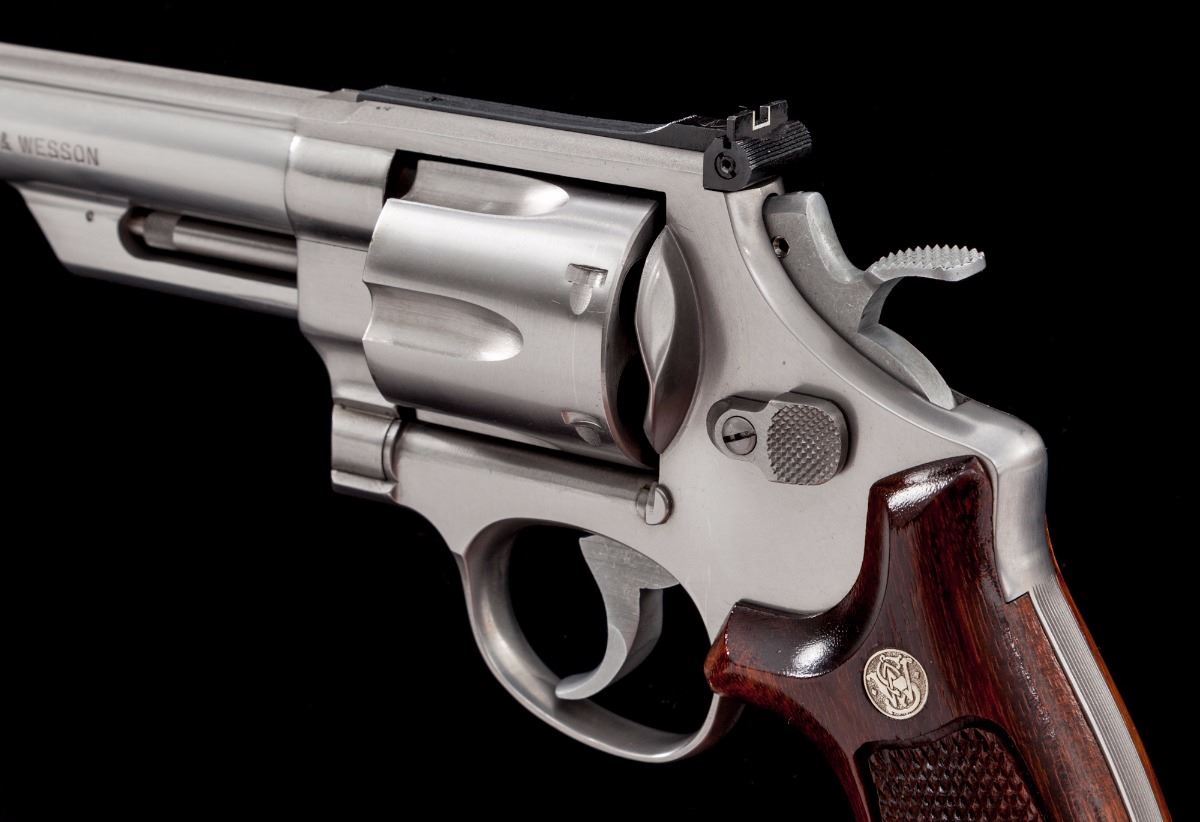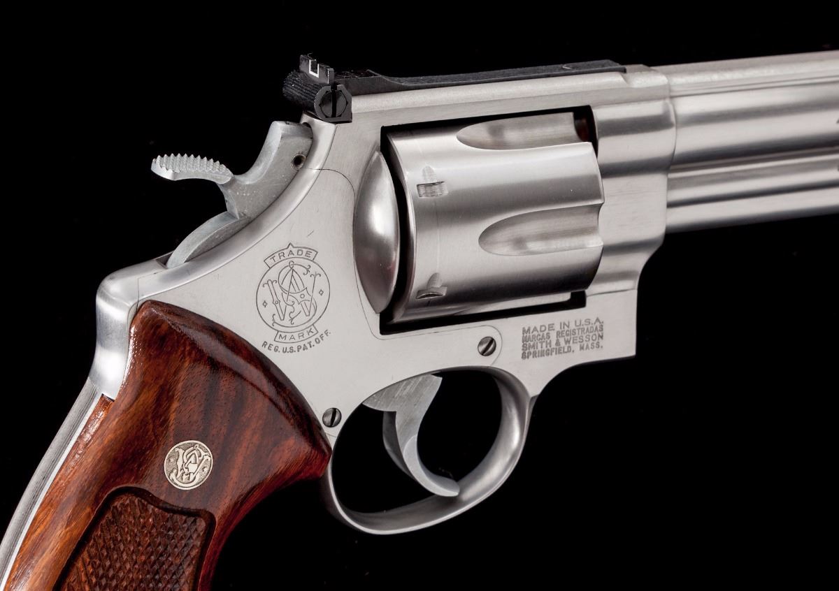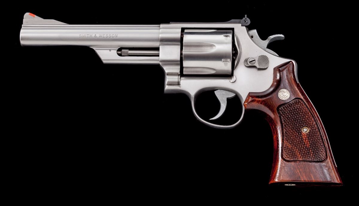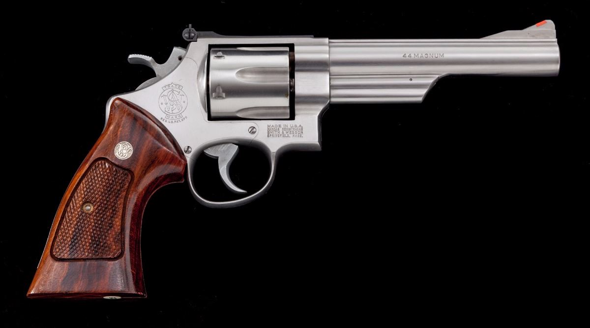 Smith & Wesson Model 629-1 Double Action Revolver, #AVA0192, .44 mag. cal., 6'' barrel, stainless steel, smooth trigger, target hammer, factory checkered cocobolo grips with S&W medallions, red ramp and white outline sights. Condition is excellent showing light scuffs from range use. Grips are crisp. Action is good, bore is bright. In its original box with matching end label. Est.: $650-$850. (Modern/PPT)