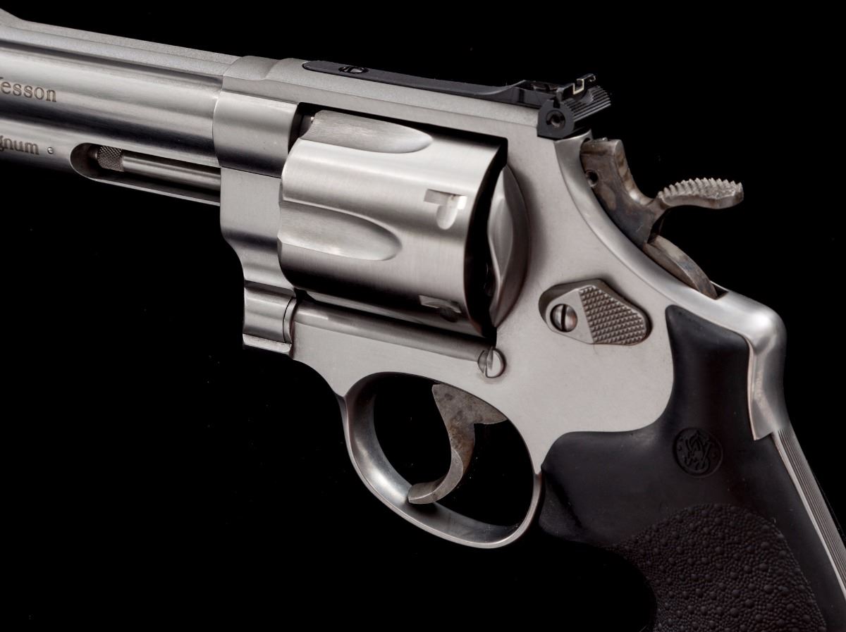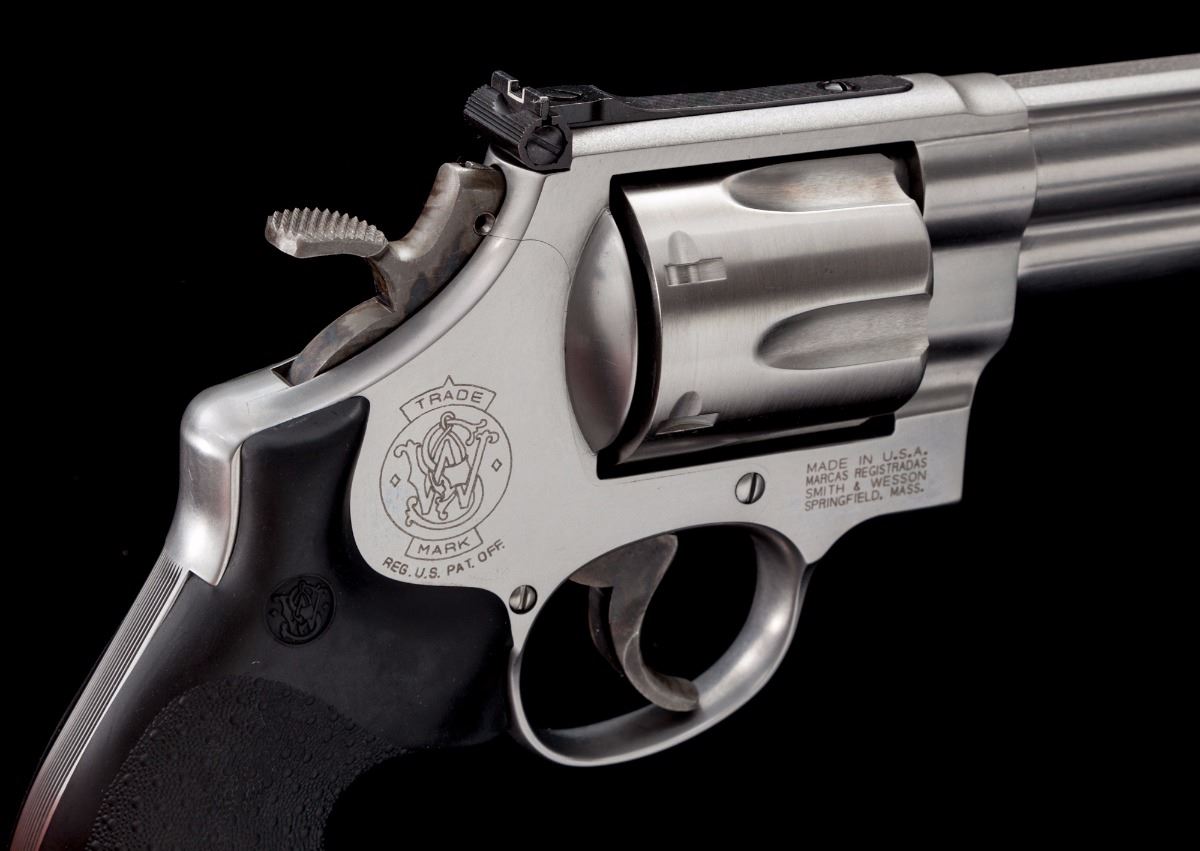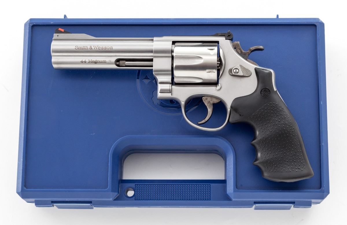 Smith & Wesson Model 629-4 Double Action Revolver, #CBT3469, .44 mag. cal., 5'' barrel, satin stainless steel, case colored trigger, checkered and case colored hammer, black hard rubber S&W grips, red ramp front sight, adjustable notched rear sight, in blue plastic S&W case with matching end label and owner's manual. Condition is excellent. Metal surfaces with general fine micro-scratching. Left side of trigger with fading to case coloring. Grips with only light marks from handling. Action is tight, bore is bright. Est.: $600-$800. (Modern/PPT)
