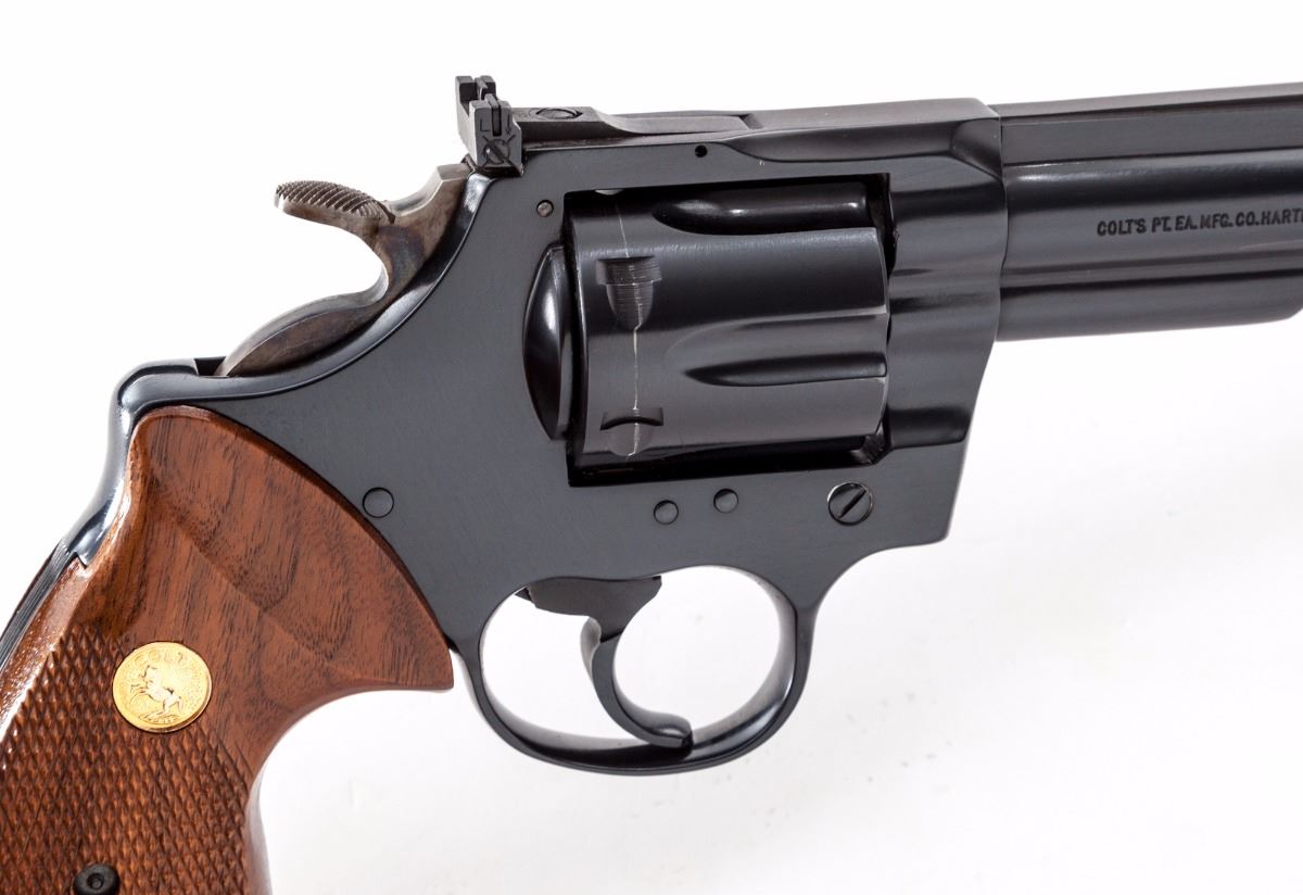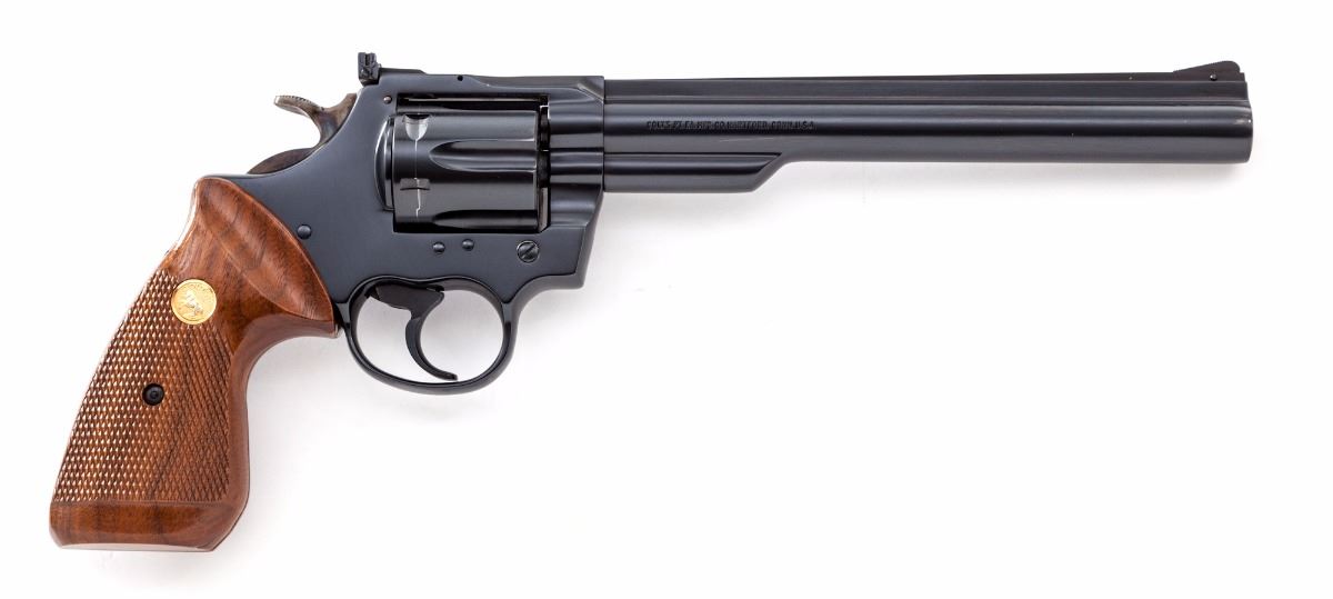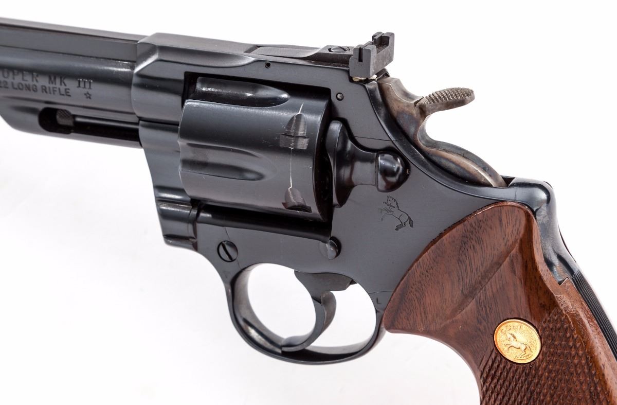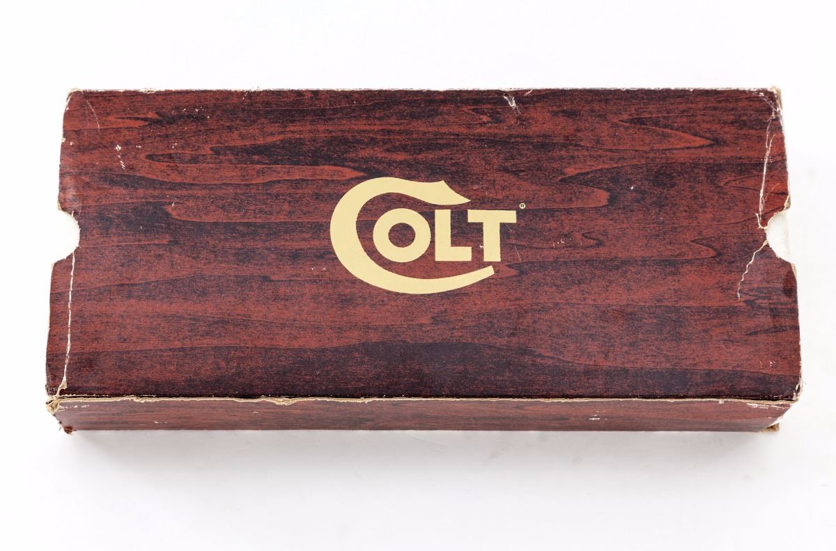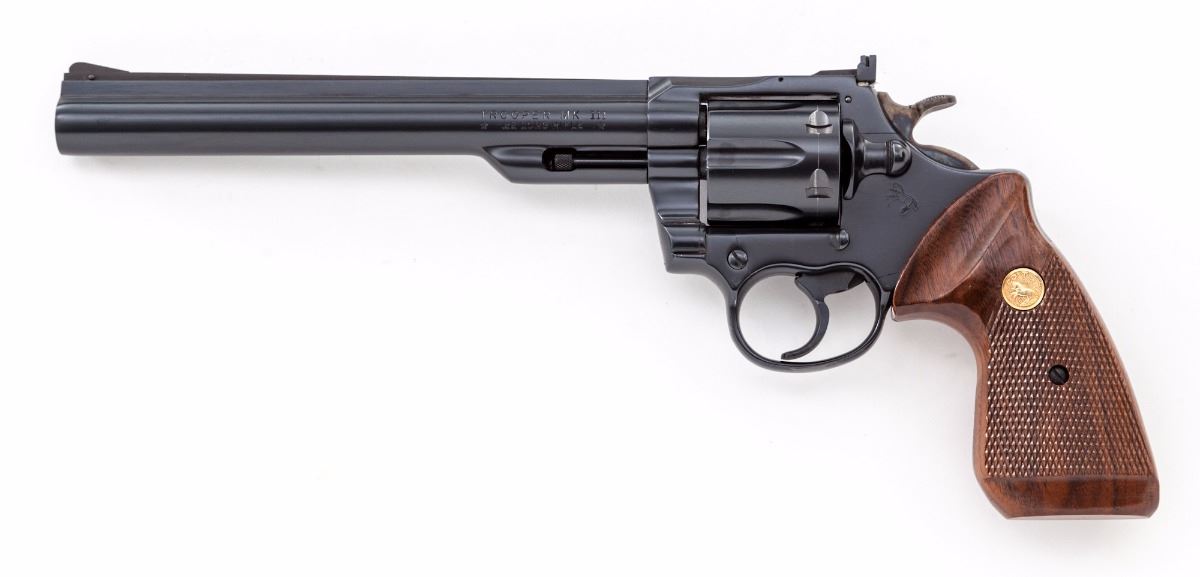 Colt Trooper MK III Double Action Revolver, #Y22707, .22 LR cal., 8'' solid rib barrel, blue finish, factory checkered walnut grips with inlaid gold Colt medallions, serrated back grip strap, checkered and case hardened hammer, pinned blade front sight and adjustable rear sight. In Colt woodgrain box, missing both end labels, and includes the original Styrofoam insert, owner's manual, and original warning label hang tag. Condition is excellent retaining approx. 99% blue, with only light marks from handling and dragline. Grips are like new. Action is crisp, bore is excellent. Est.: $600-$800. (Modern) (Not available to Calif. residents.)