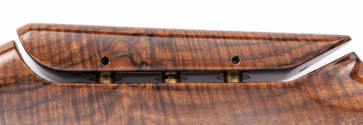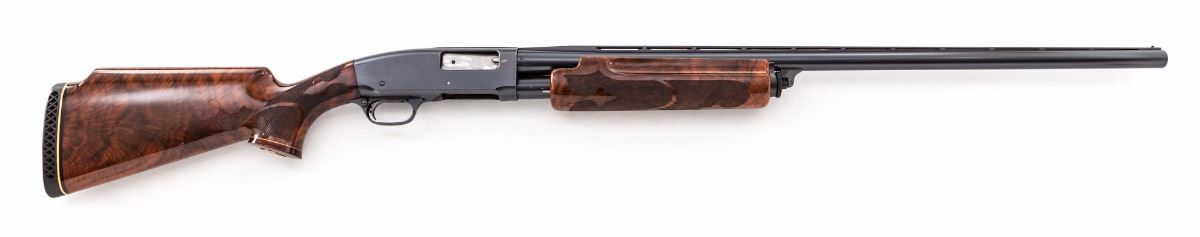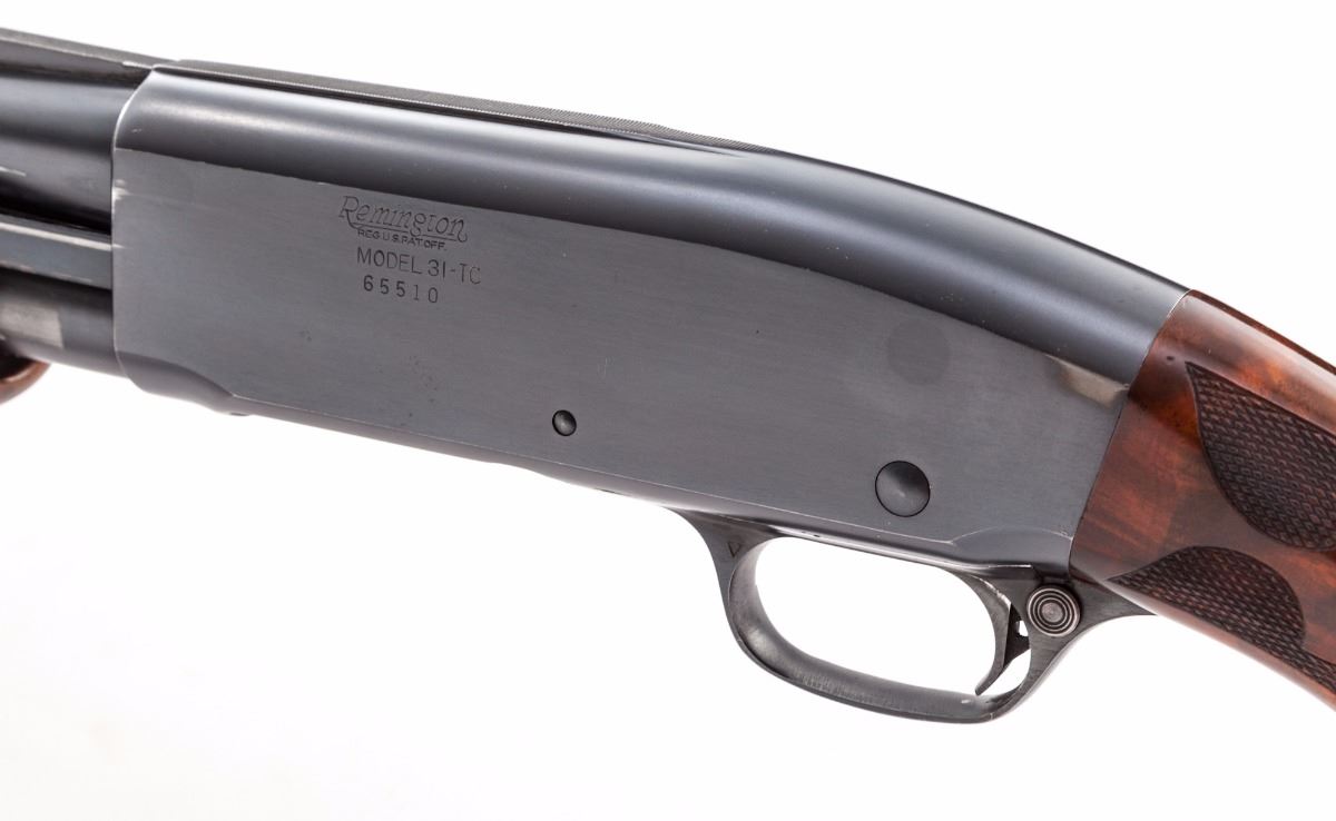 Custom Stocked Remington Model 31-TC Slide Action Trap Shotgun, #65510, 12 ga., 2-3/4'' ch., satin blue finish, 30'' barrel with matted 5/16'' ventilated rib, Bradley type front white bead and middle steel bead, with a Full choke; receiver with triggerguard mounted push button safety; Monte Carlo stock and fingergroove target forend are Deluxe flame figure walnut with a striking grain pattern and a high-gloss finish with flared rosewood grip cap and an inset high-relief gold Labrador profile. Length of pull is 14-1/4'' over a 1'' black Pachmayr recoil pad, drop at comb is 1'', drop at MC is 1-1/8'' and drop at heel is 1-3/4''; weight is 9-1/8 lbs. Overall condition is very good as restocked. Bolt and firing pin have moderate wear; blue and wood finish are 98% with cycling and handling marks. Recoil pad is decomposing. Action is tight, bore is bright with light fouling. Est.: $800-$1,200. (C&R)