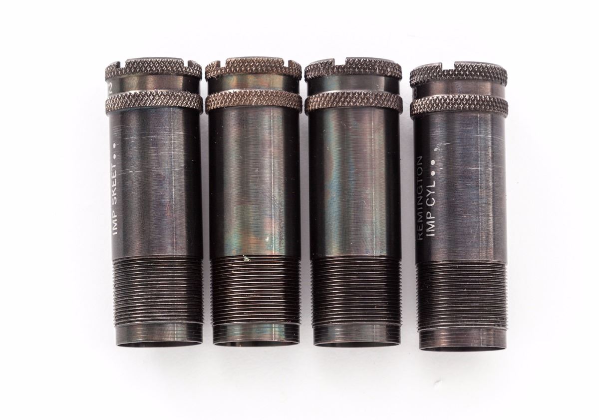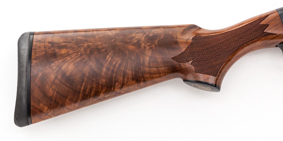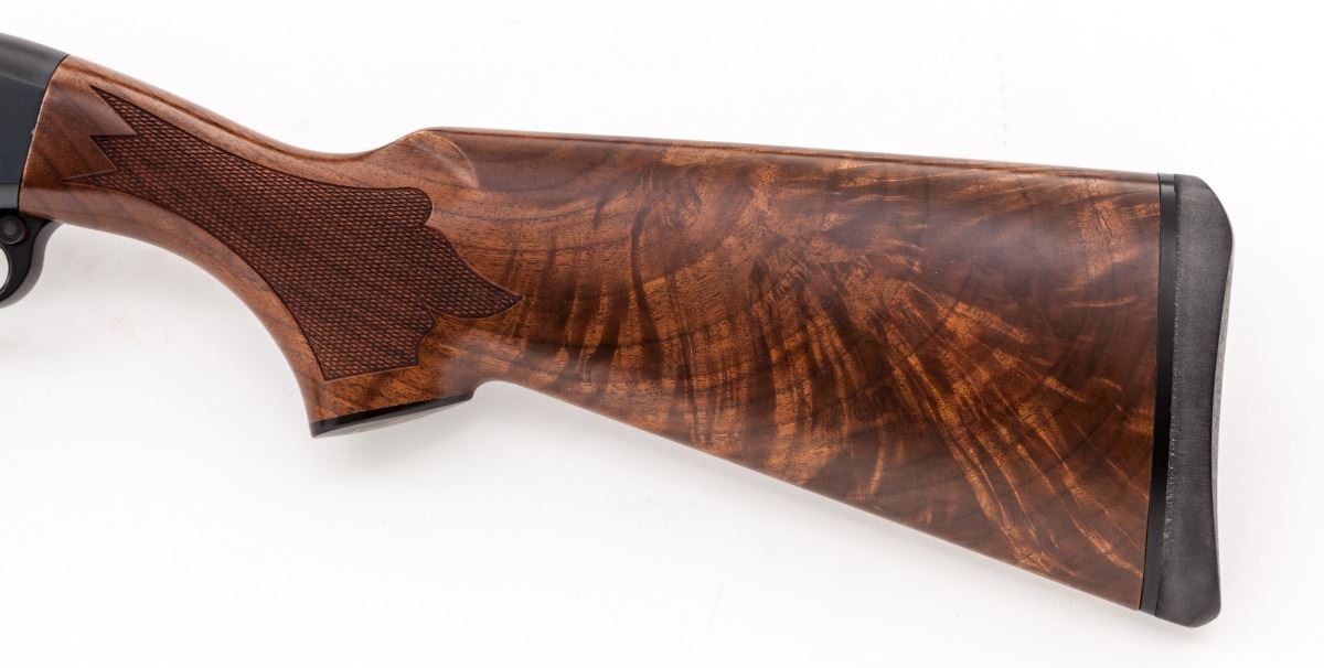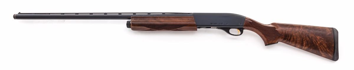 Remington Model 11-87 Sporting Clays Semi-Automatic Shotgun, #PC443056, 12 ga., 2-3/4'' target ch., 28'' matte blue finish barrel with 5/16'' ventilated rib, front white Bradley type and middle steel sights, with five (5) interchangeable Rem Choke tubes (F, M, IC, IS, S); receiver has a polished blue finish with a gold anodized trigger and triggerguard mounted push-button safety; checkered pistol-grip stock and forend are satin finished deluxe walnut with contrasting flame figure and ebony pistol grip cap. Length of pull is 14-1/8'' over a solid black 3/4'' Remington recoil pad; weight is 7-7/8 lbs. Condition is excellent, appearing near new, possibly test fired, in its original Remington plastic case, with choke wrench and instruction manual. Est.: $600-$800. (Modern)