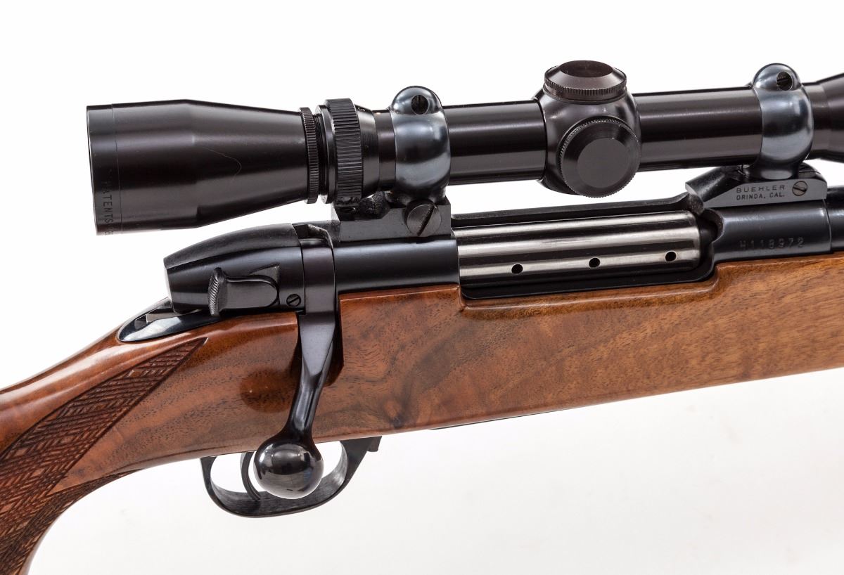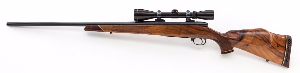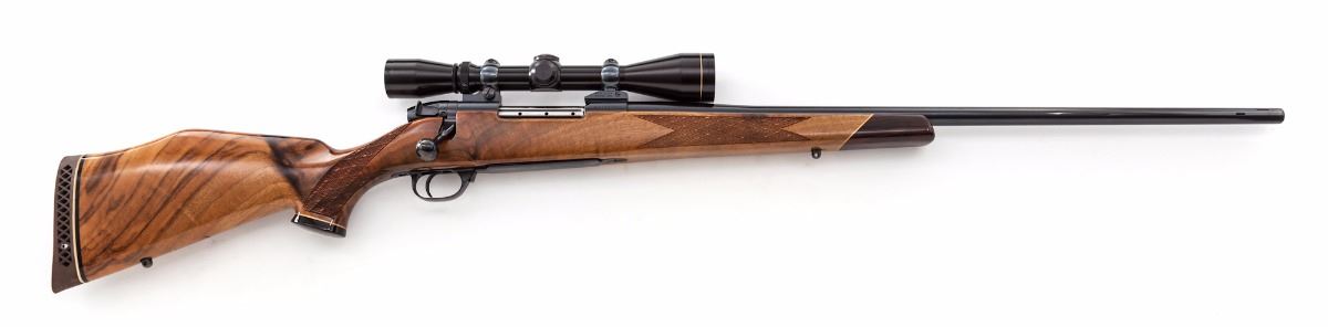 Weatherby MK V Deluxe Bolt Action Rifle, #H118972, .378 Wea. mag. cal., 26'' ported barrel, blue finish, high-gloss walnut Monte Carlo stock with skipline checkering, rosewood forend and grip cap with decorative inlaid white diamond; factory hard rubber Weatherby recoil pad with black & white spacers, and sling swivel studs. Topped with a Leupold Vari-X II 3x9 scope on Buehler two-piece base. Made in Japan. Condition is excellent retaining approx. 99% blue. Metal surfaces with only a few minor marks from handling, including scratches to the floorplate. Stock with sharp checkering, a few scattered fine impressions, as well as two moderate impressions to bottom edge of buttstock, and one impression or damage near front sling swivel stud (stud is slightly askew). Action is crisp, bore is bright, scope optics are clear. With the exception of the marks to bottom edge of stock, rifle is in near new condition. Est.: $1,400-$1,800. (Modern)