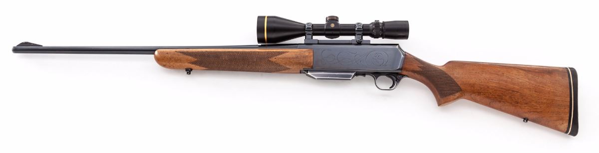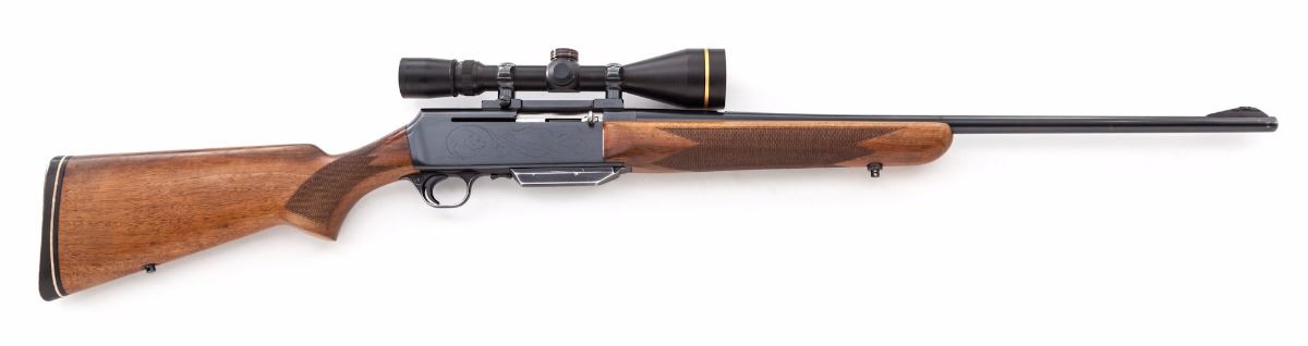 Belgian Browning BAR Grade II Semi-Automatic Rifle, #63265M70, 7mm. Rem. mag. cal., 24'' barrel, blue finish, lightly engraved big game scene to both sides of receiver, checkered pistol-grip walnut stock and forend, factory Browning basketweave pattern black hard rubber recoil pad, ramped front sight has been filled with a dovetailed block, rear sight has been removed, with sling swivel studs. Topped with a Leupold Vari-X III 3.5x10-50mm scope on one-piece Leupold base. Condition is very good retaining approx. 95% blue with light marks from handling, the majority of the wear being to the high edges of frame and muzzle. Stock and forend show normal wear from field use, including dings and mars to handling areas, as well as some oil darkening and thinning to the finish. Rear sling swivel stud appears to be a replacement and shows some damage to the wood that would have been covered by the previous sling swivel stud. Action is crisp, bore is fine, scope optics are clear. Est.: $700-$900. (Modern)