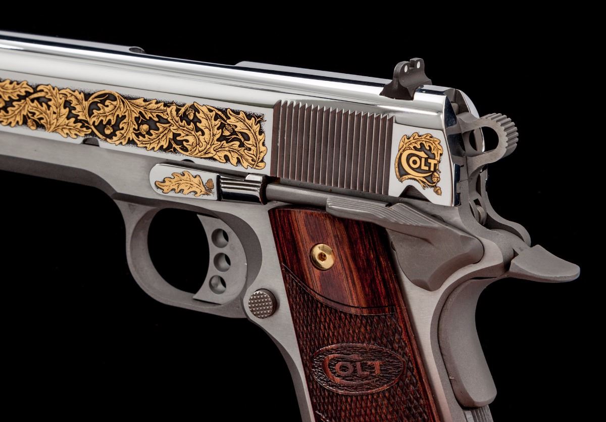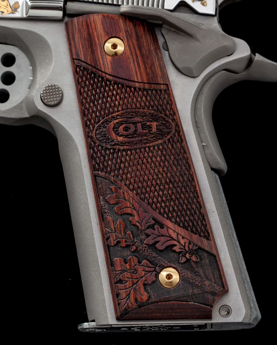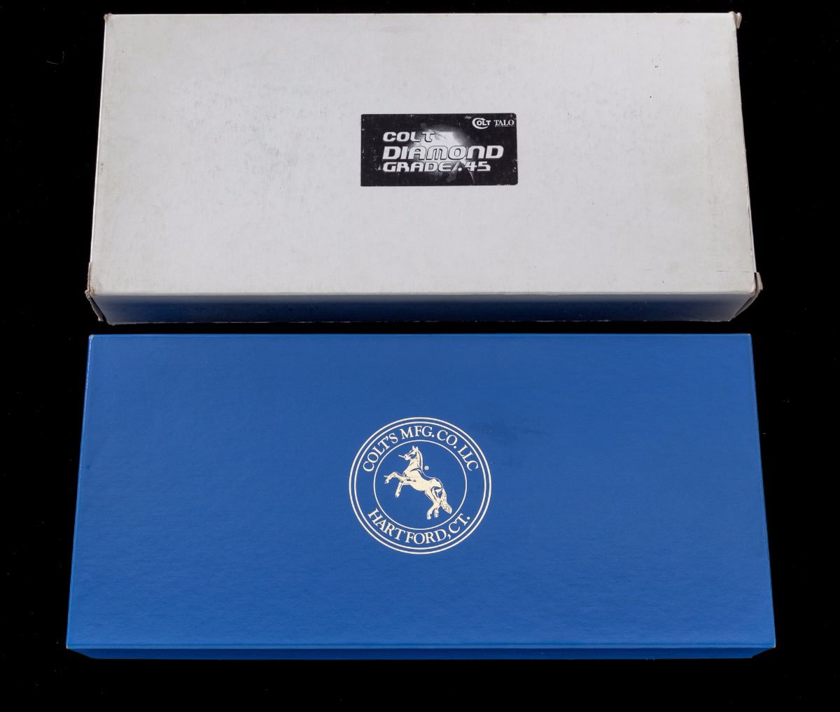 Limited Edition Colt Gov't Model Diamond Grade Model 1911 Semi-Automatic Pistol, #DMG0185, .45 Auto cal., 5'' barrel, mirror polished stainless steel slide, decorated with 24k gold oakleaf pattern, as well as Colt logo to left side of slide and Rampant Colt to right; exotic rosewood grips with checkered and oakleaf pattern and Colt logo; standard white three-dot sights, with two (2) factory Colt magazines, in blue two-piece Colt Custom Shop box with gold Rampant Colt logo to lid, plain white shipping box with matching end label, gun lock, owner's manual and other misc. paperwork. Limited to a production of only 350 and offered by Talo Distributors. Condition is excellent, appearing as new, showing a small amount of light micro-scratching from handling. A nicely done collector's quality limited edition Colt pistol. Est.: $1,800-$2,400. (Modern) (Not available to Calif. residents.)