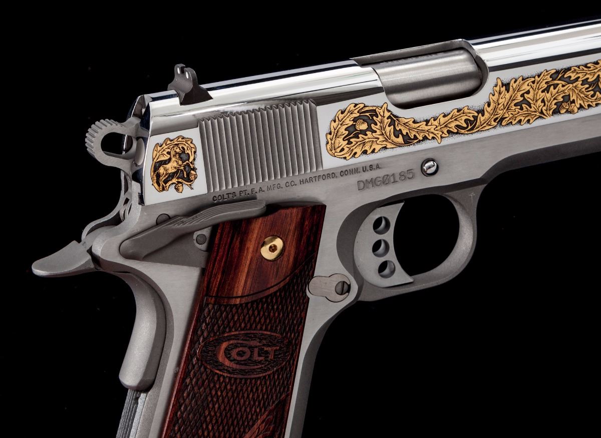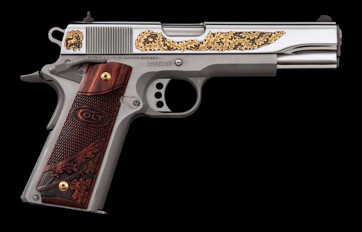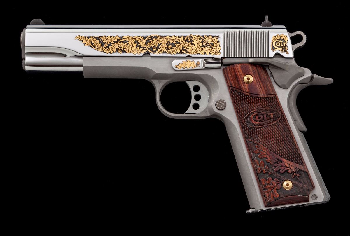 Limited Edition Colt Gov't Model Diamond Grade Model 1911 Semi-Automatic Pistol, #DMG0185, .45 Auto cal., 5'' barrel, mirror polished stainless steel slide, decorated with 24k gold oakleaf pattern, as well as Colt logo to left side of slide and Rampant Colt to right; exotic rosewood grips with checkered and oakleaf pattern and Colt logo; standard white three-dot sights, with two (2) factory Colt magazines, in blue two-piece Colt Custom Shop box with gold Rampant Colt logo to lid, plain white shipping box with matching end label, gun lock, owner's manual and other misc. paperwork. Limited to a production of only 350 and offered by Talo Distributors. Condition is excellent, appearing as new, showing a small amount of light micro-scratching from handling. A nicely done collector's quality limited edition Colt pistol. Est.: $1,800-$2,400. (Modern) (Not available to Calif. residents.)