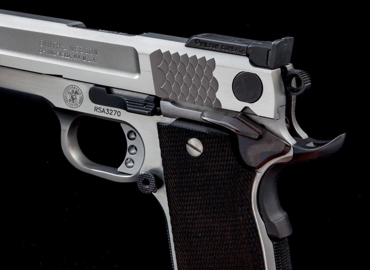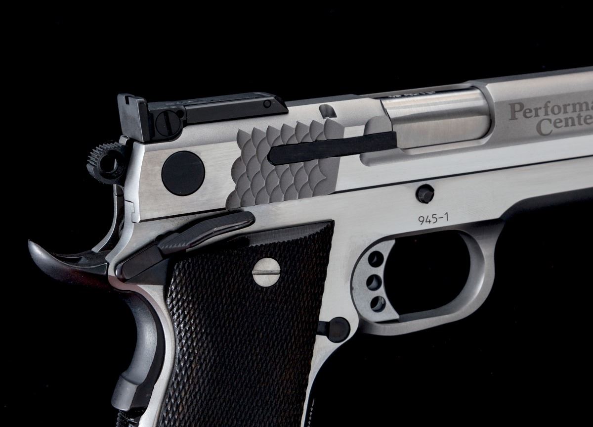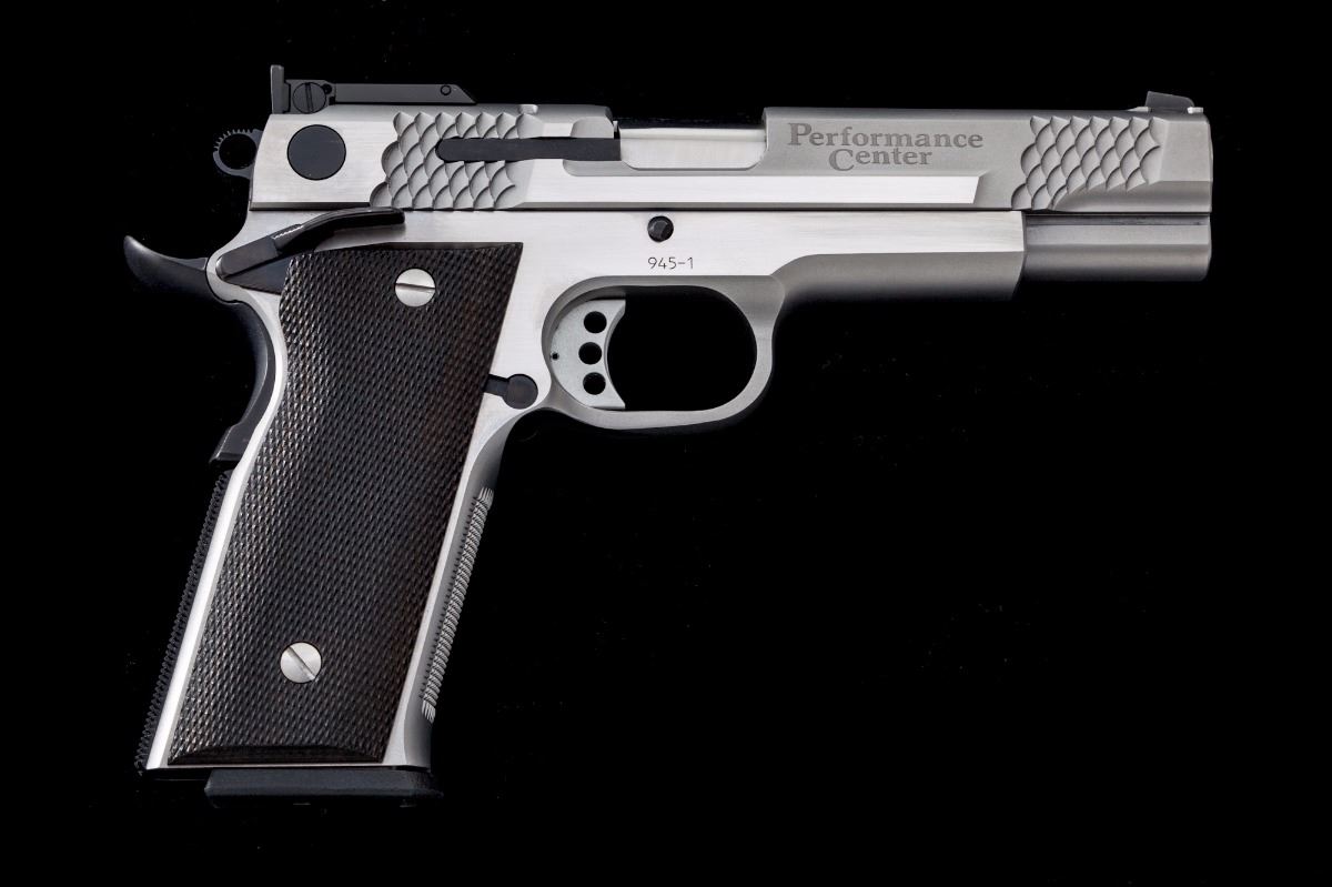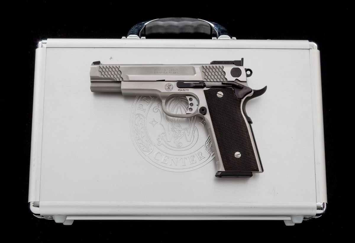 Smith & Wesson Performance Center Model 945-1 Semi-Automatic Pistol, #RSA3270, .45 ACP cal., 5'' barrel, satin and polished stainless finish, slide with fishscale serrations to both front and rear, dark checkered laminate grips, ambidextrous thumb safety, beavertail grip safety, dovetailed front sight, adjustable Wilson Combat rear sight, with two (2) factory 8-round magazines and owner's manual, in S&W aluminum Performance Center case. Condition is excellent. Exterior metal surfaces show just light marks from handling. Grips are like new. Action is tight, bore is bright. Est.: $1,500-$2,000. (Modern) (Not available to Calif. residents.)