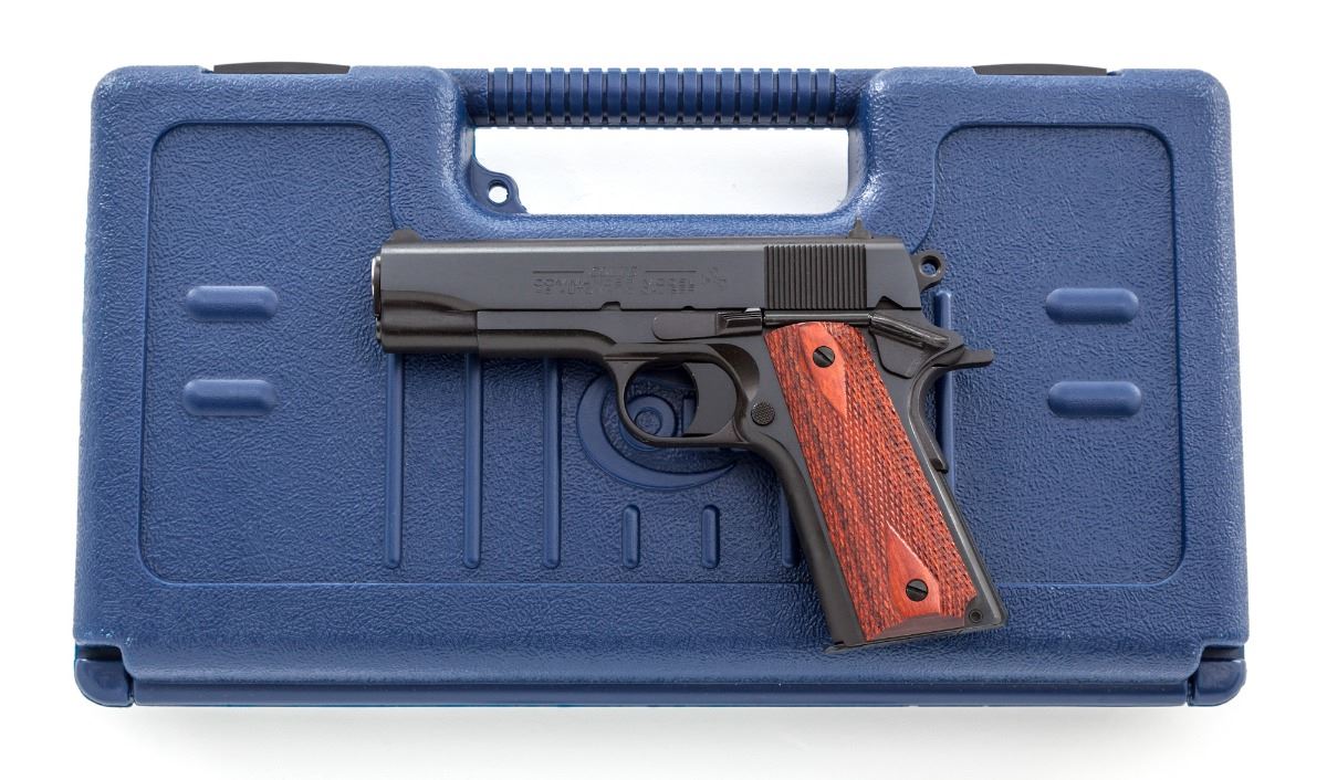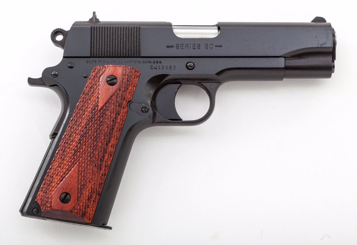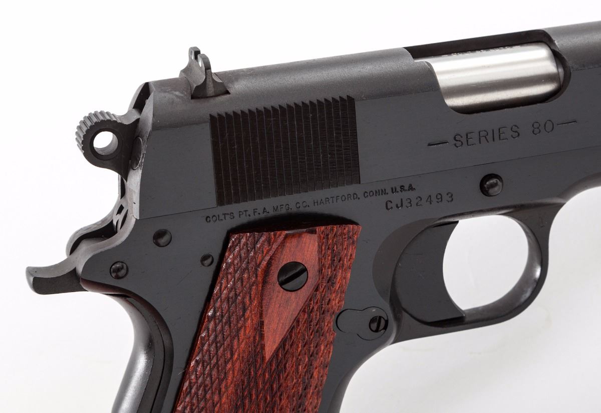 Colt MK IV Series 80 Commander Model Semi-Automatic Pistol, #CJ32493, .45 ACP cal., 4-1/4'' barrel, blue finish, checkered diamond pattern wood grips, with white 3-dot sight system. In original Colt blue plastic hard case with matching end label, Colt hang tag, owner's manual and associated paperwork. Includes two factory 8-round magazines. Dating from the mid-1990s. Condition is excellent, appearing as new, showing very little, if any, use. Est.: $1,000-$1,500. (Modern/PPT) (Consecutive to below lot.)