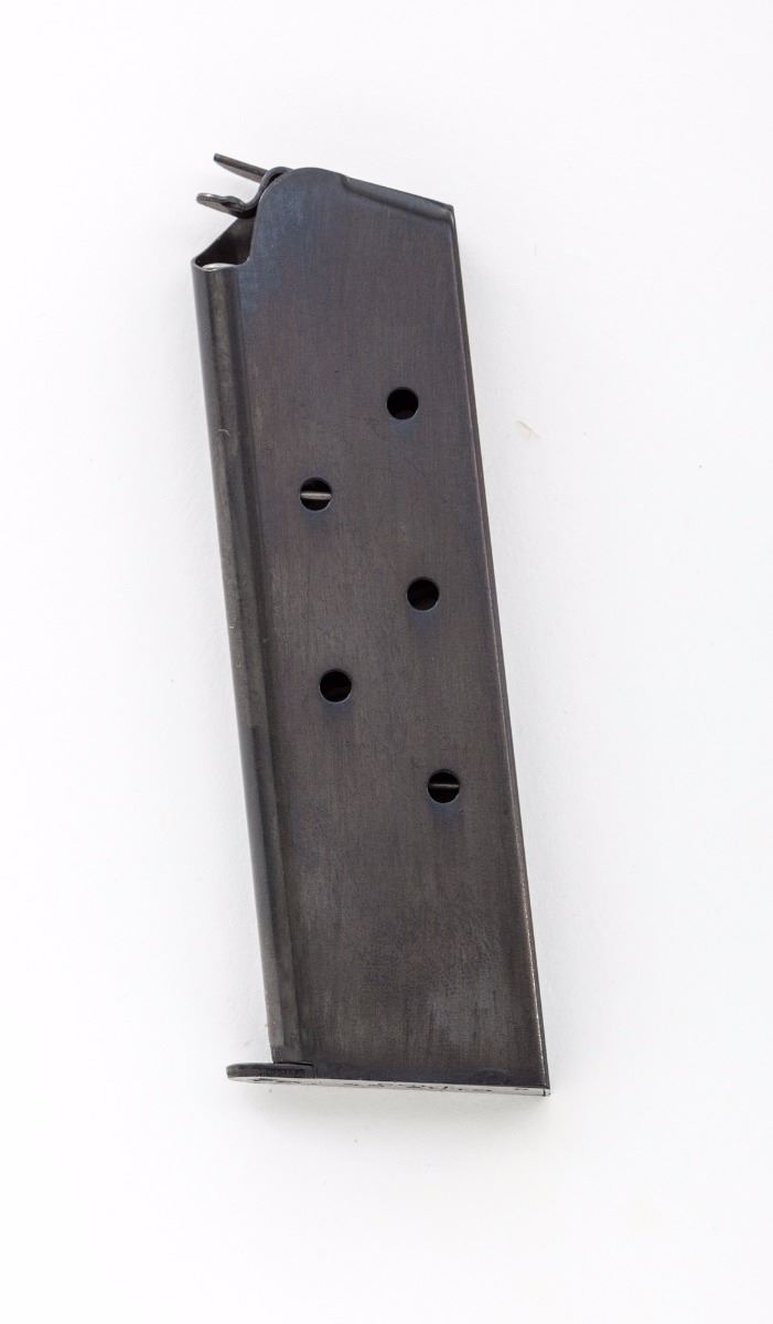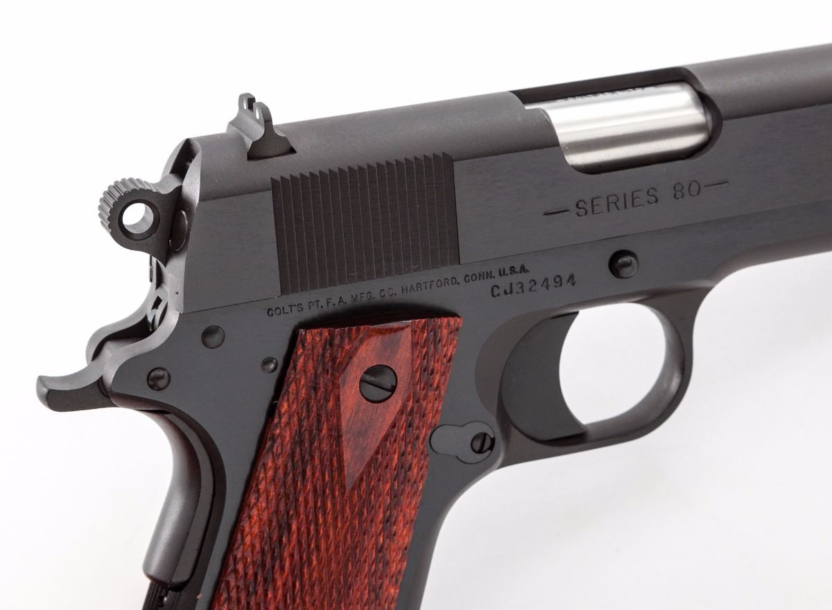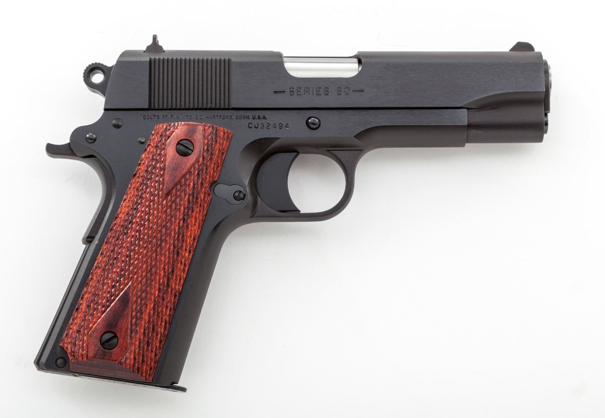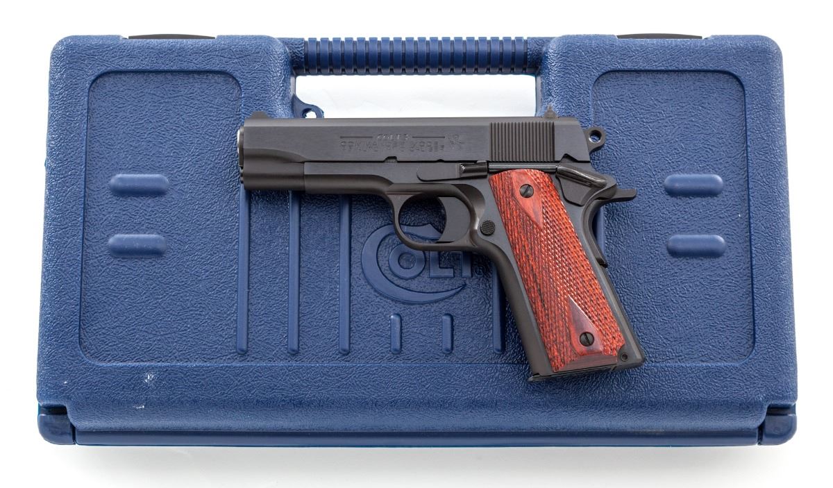Colt MK IV Series 80 Commander Model Semi-Automatic Pistol, #CJ32494, .45 ACP cal., 4-1/4'' barrel, blue finish, checkered diamond pattern wood grips, with white 3-dot sight system. In original blue plastic hard case with matching end label, Colt hang tag, owner's manual and associated paperwork. Includes two factory 8-round magazines. Dating from the mid-1990s. Condition is excellent, appearing as new, showing very little, if any, use, with some dried original preservative on the surface. Est.: $1,000-$1,500. (Modern/PPT) (Consecutive to above lot.)