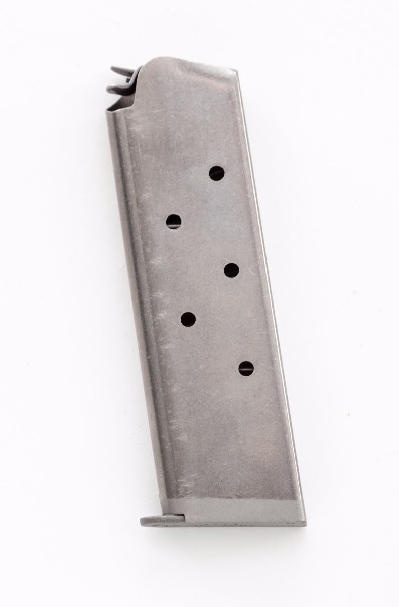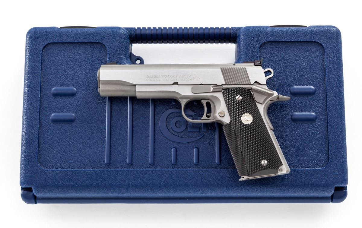 Colt MK IV Series 80 Gold Cup Nat'l Match Semi-Automatic Pistol, #SN26142E, .45 ACP cal., 5'' barrel, stainless steel, factory checkered black hard rubber grips with inlaid Colt medallions, serrated back grip strap, beavertail grip safety, lightweight skeletonized trigger and hammer, fixed blade front sight, adjustable Elliason rear sight, with two (2) factory magazines, in original Colt blue hard plastic case with matching end label, owner's manual, Colt tool, and other misc. paperwork. Condition is excellent, appearing near new, showing minimal signs of use, including a few scattered light surface scratches. Action is tight, bore is bright. Est.: $800-$1,200. (Modern/PPT)
