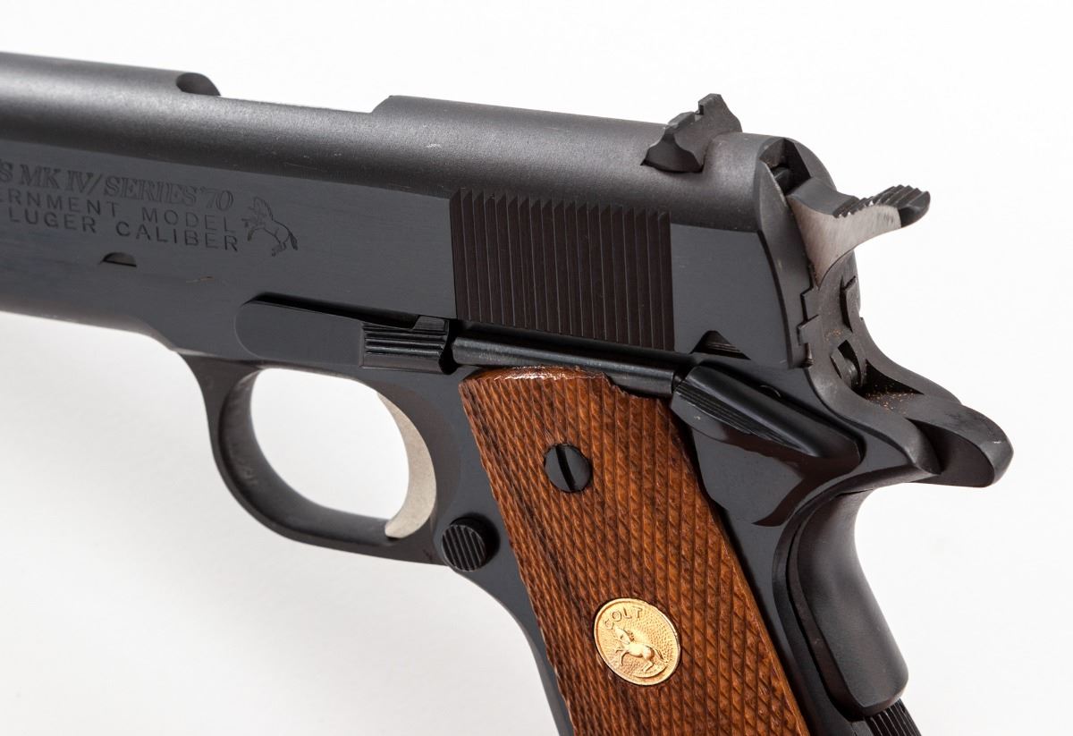 Colt MK IV Series 70 Gov't Model Semi-Automatic Pistol, #70L14800, 9mm Luger cal., 5'' barrel, blue finish, factory checkered walnut grips with inlaid Colt medallions, standard fixed sights, with one factory magazine. This pistol was originally shipped to Europe for commercial sales. Condition is excellent with small scratch on left side of frame approx. 2'' ahead of triggerguard, as well as a similar scratch to bottom edge of slide, with additional light handling marks. Bottom edge of frame just forward of triggerguard with very light importation marks. Grips are like new. Action is tight, bore is excellent. Est.: $1,000-$1,500. (Modern) (Not available to Calif. residents.)