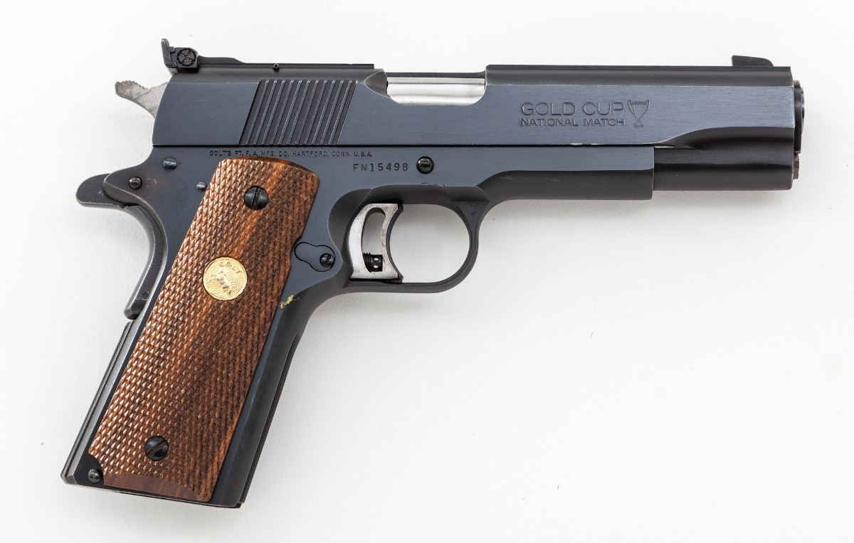 Colt MK IV Series 80 Gold Cup National Match Semi-Automatic Pistol, #FN15498, .45 ACP cal., 5'' barrel, blue finish, factory checkered walnut grips with inlaid gold Colt medallions, with fixed front sight and adjustable white outline rear sight. No magazine. Condition is fine showing some range use, including scattered fine micro-scratching, minor marks from handling, and one noticeable surface scratch to rear left side of slide. Grips with mostly crisp checkering. Action is tight, bore is fine. Est.: $750-$1,000. (Modern) (Not available to Calif. residents.)