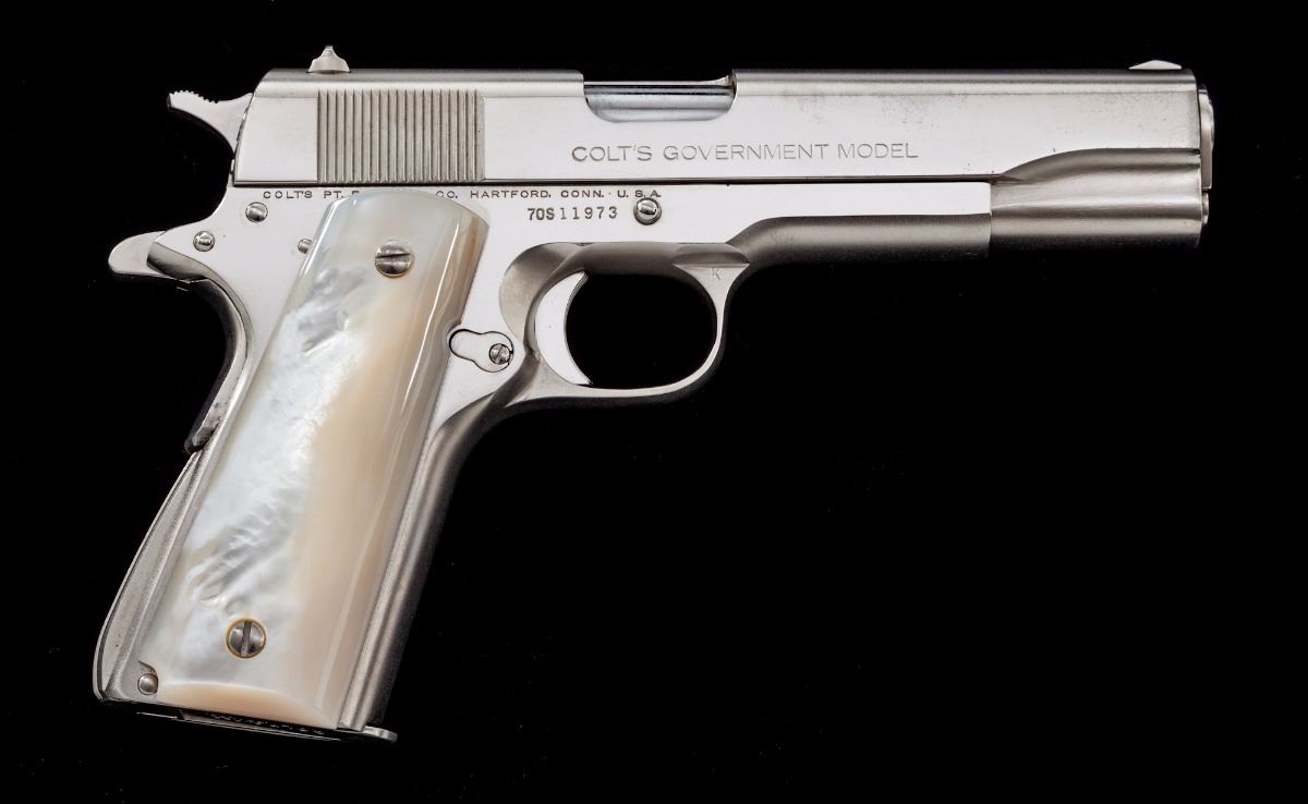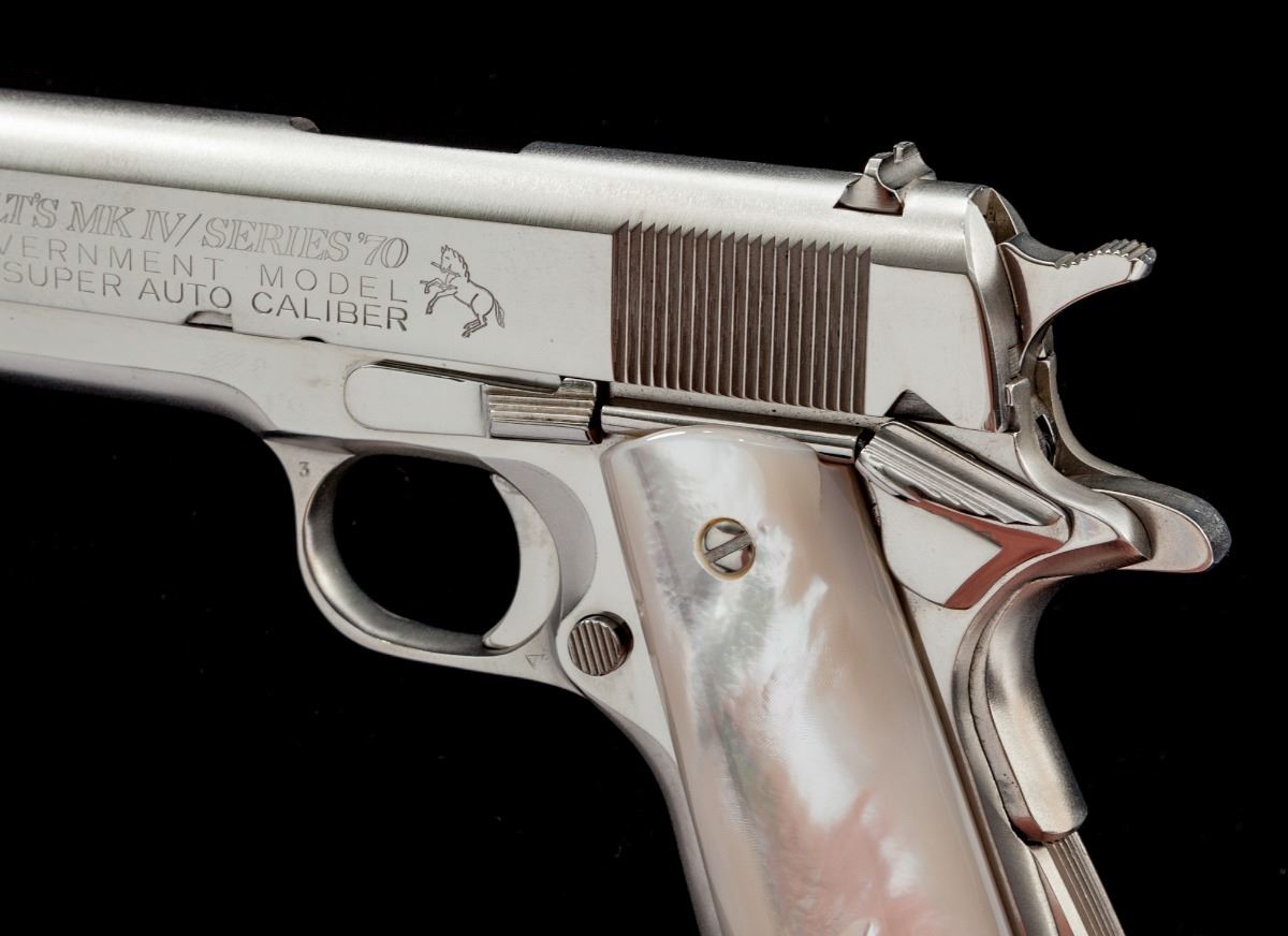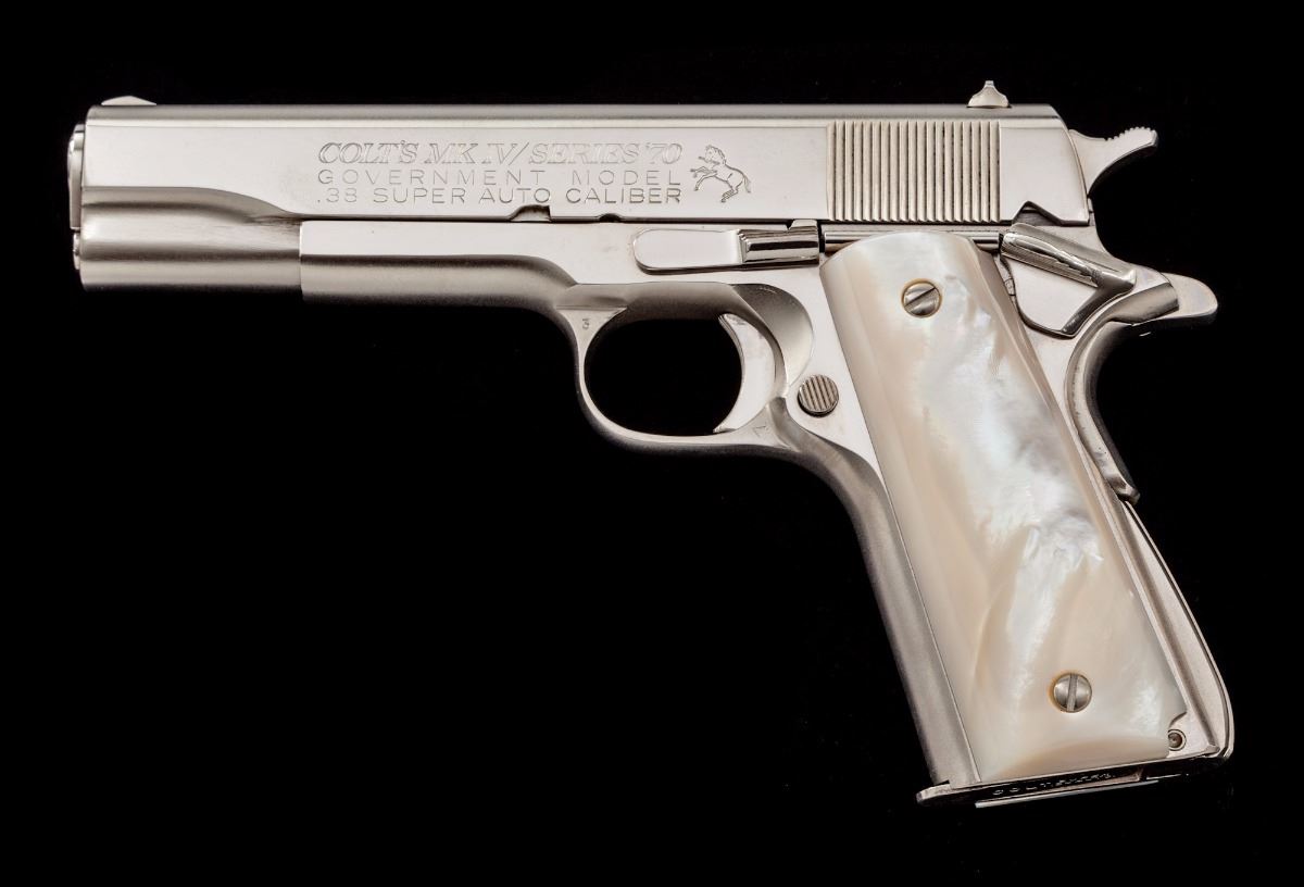 Colt MK IV Gov't Model Series 70 Semi-Automatic Pistol, #70S11973, .38 Super cal., 5'' barrel, factory nickel finish, pearl grips, standard sights, with one factory magazine, in mismatched Colt box. Condition is fine. Nickel surfaces with fine micro-scratching and some pinprick oxidation to front end of slide. Pearl grips with bright coloring and left grip panel with a few natural fissures along the back edge, and one approx. 1/4'' hairline crack near thumb safety from notching to fit the contour of the plunger tube. Action and bore are excellent. Est.: $1,200-$1,800. (Modern) (Not available to Calif. residents.)