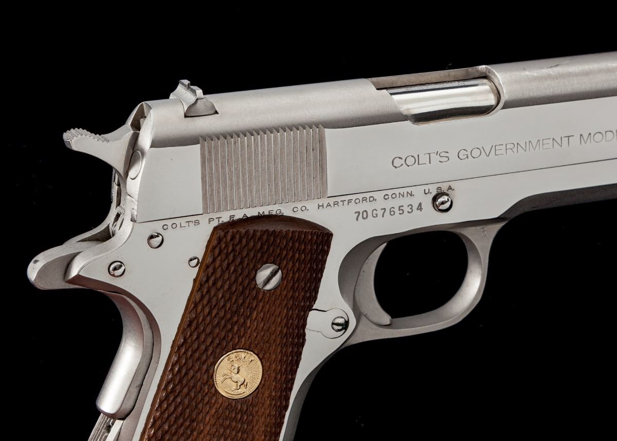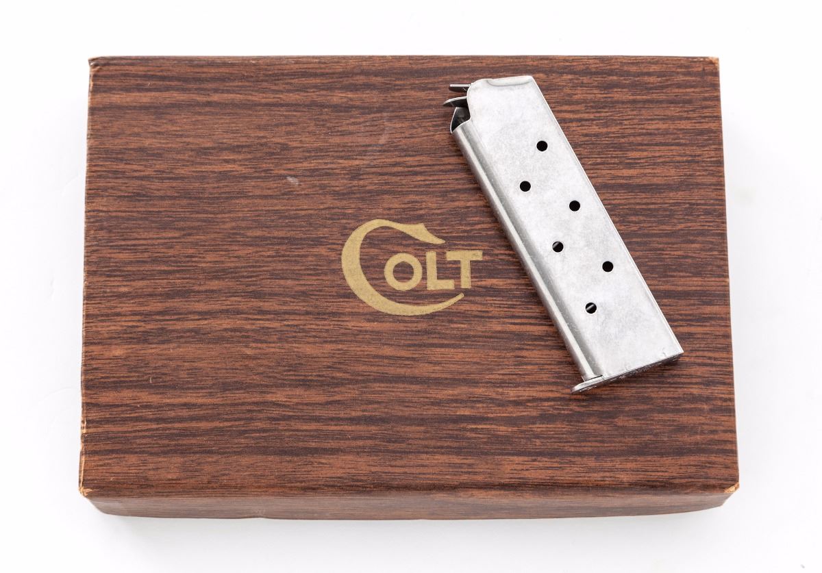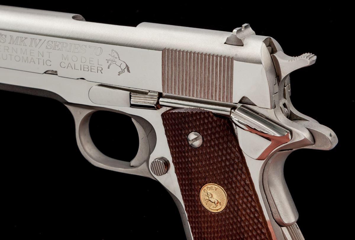 Colt MK IV Series 70 Semi-Automatic Pistol, #70G76534, .45 ACP cal., 5'' barrel, two-tone bright nickel finish, checkered gold medallion walnut grips, fixed combat sights, with two magazines, one factory nickel and one nickel Colt 8-round magazine. In non-original Colt marked box with packing paper and owner's manual. Condition is excellent, appearing near new, retaining approx.99%+ original nickel finish with two rub marks on top of slide, a couple of ring marks to the front grip strap, and a very slight assembly mark on left side of frame. Grips are near new. Acton is tight, bore is bright. Grips are near new. Est.: $900-$1,200. (Modern) (Not available to Calif. residents.)