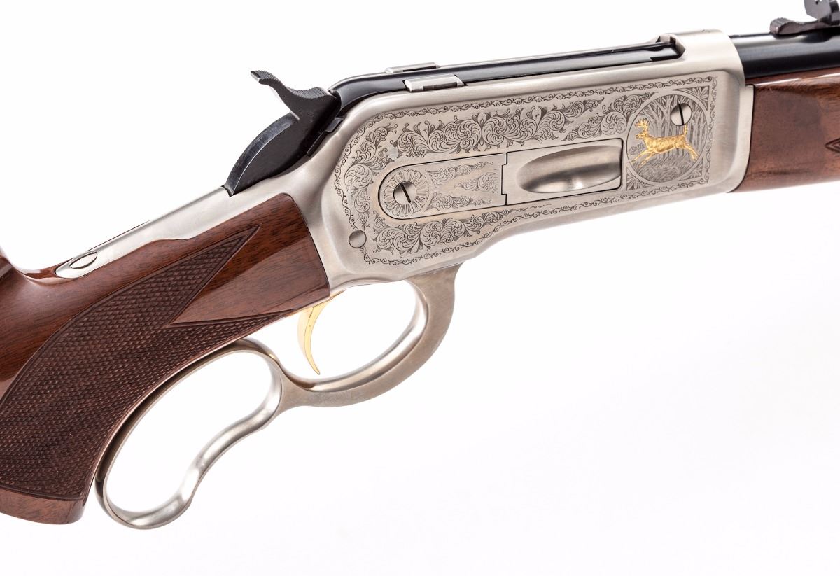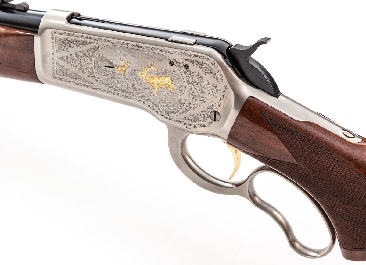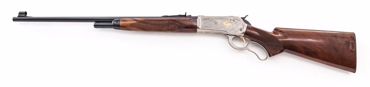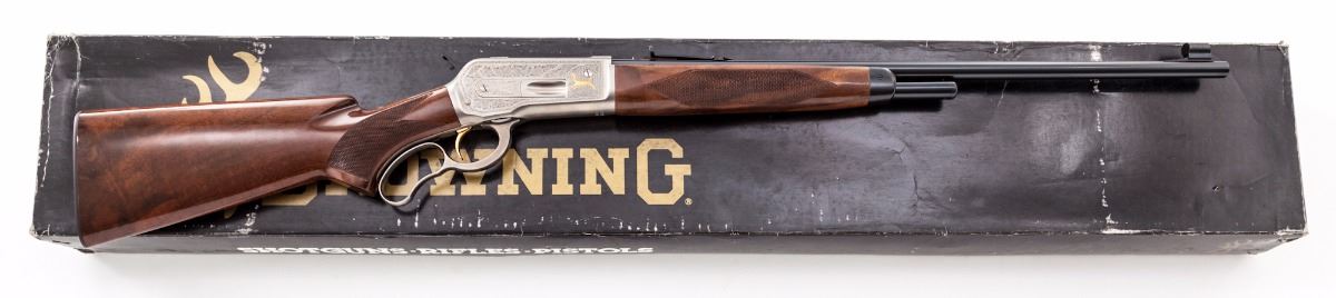 Browning Model 71 High Grade Lever Action Rifle, #00790PR6R7, .348 Win. cal., 24'' barrel, roll engraved coil-finished frame finely scroll engraved and decorated with gold inlaid elk and deer to both sides, signed by the engraver T. Naka; high gloss deluxe factory checkered pistol-grip stock with globe front sight and buckhorn rear sight. In original factory box with matching end label. Condition is excellent, appearing as new and unfired. Stock with a few light marks from handling. Est.: $1,500-$2,000. (Modern)