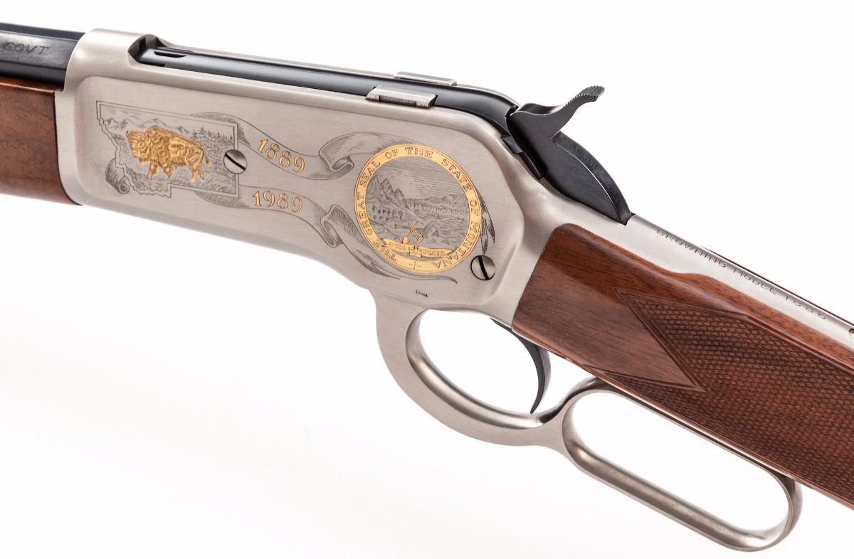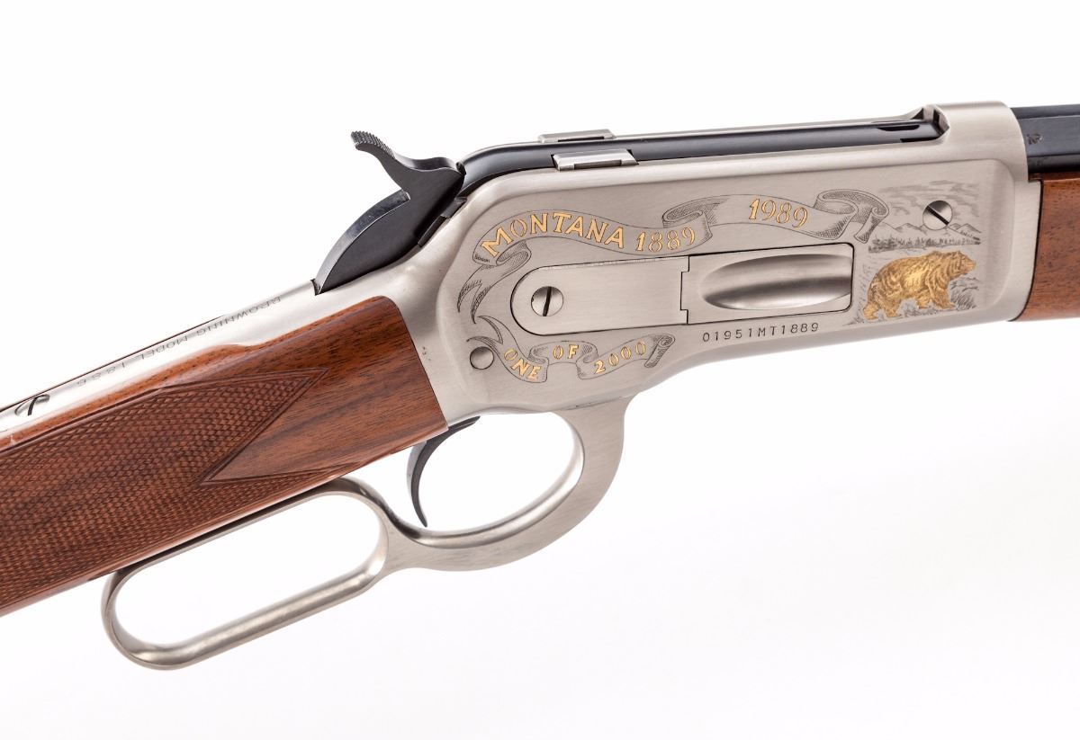 Browning Montana Centennial Model 1886 Lever Action Rifle, #01951MT1889, .45-70 cal., 26'' blue octagon barrel, coin-finished frame and lever, roll-engraved Montana Centennial scenes with applied gold bear and bison, signed by engraver T. Naka, as well as the Great Seal of Montana, with high gloss checkered walnut stock and forend. One of 2000 mfg'd. Condition is excellent, as new, in its original box with owner's manual. Stock with a few scuffs and small impressions near upper tang. Exterior of box with scuffs and tape repairs. Est.: $1,500-$2,000. (Modern)