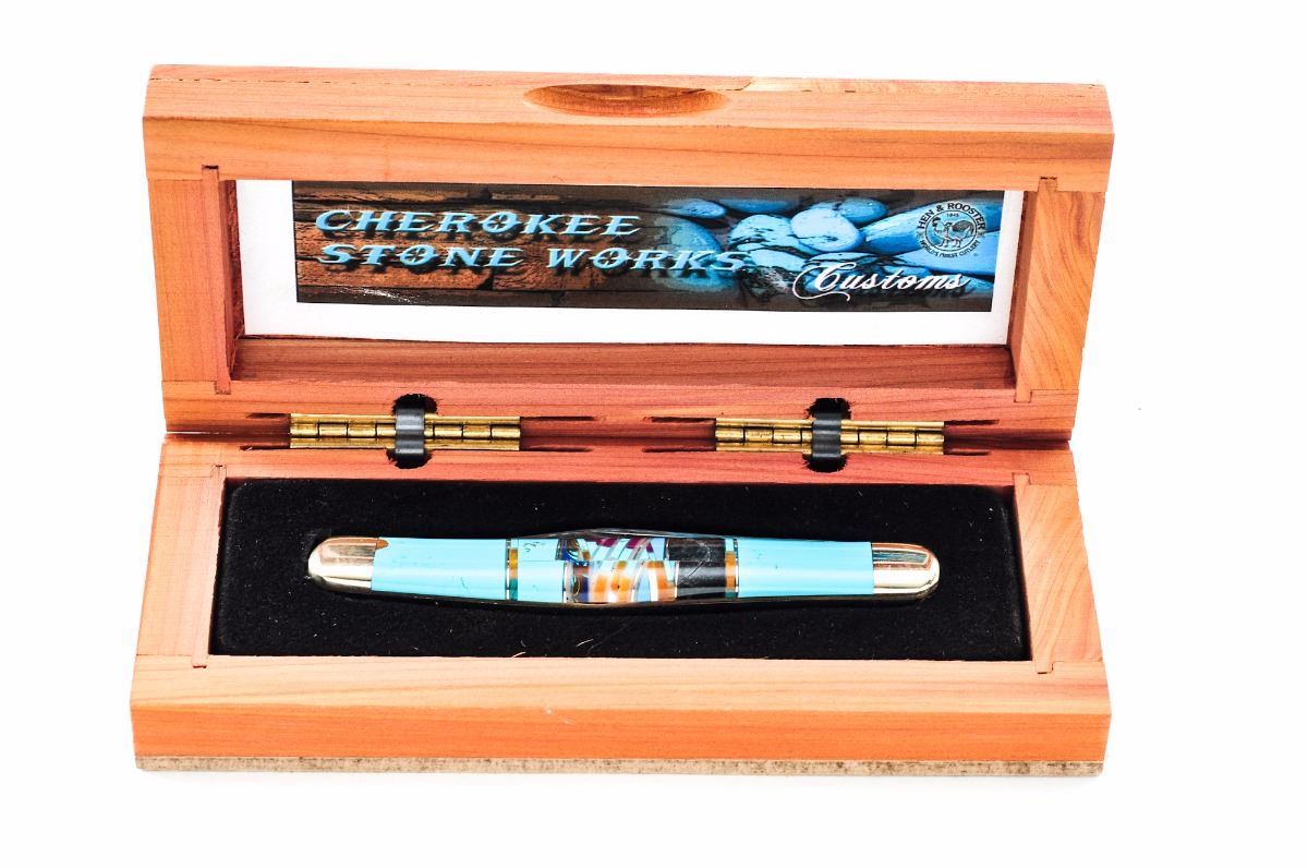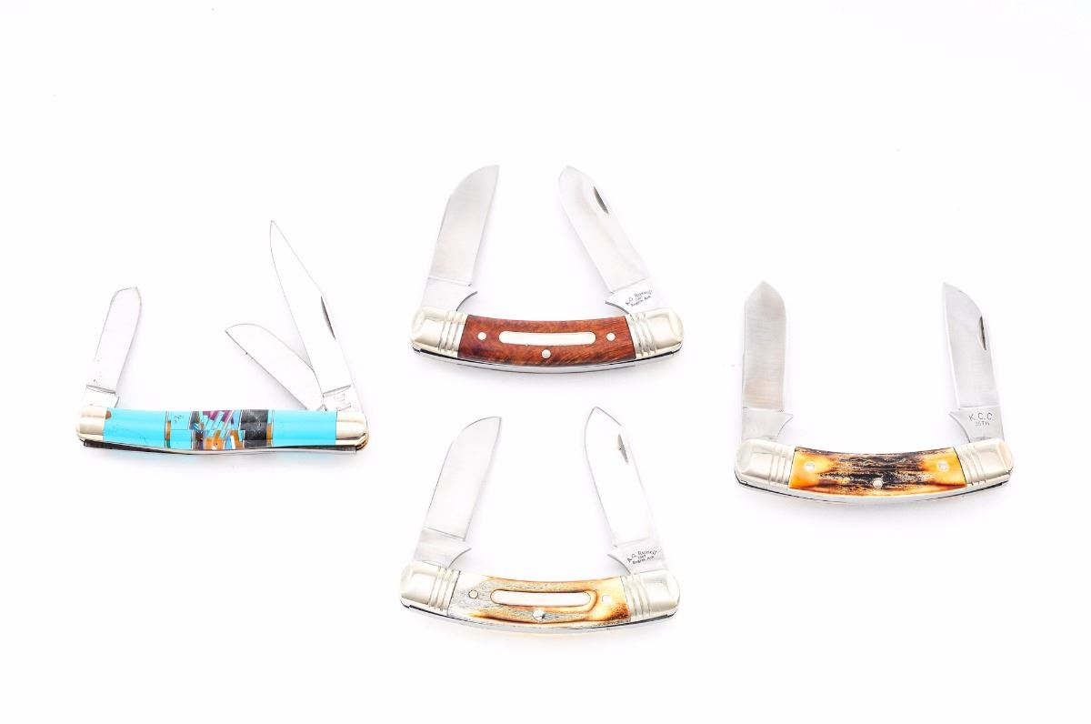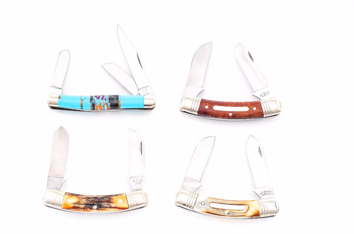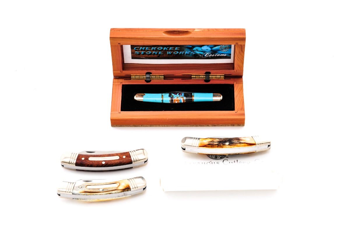 Lot of Four (4) Folding Knives, by A.G. Russell, Cattaraugus, and Hen & Rooster: (1) Hen & Rooster, Cherokee Stoneworks, custom folding knife, with turquoise, black jet, and other small misc. polished stone inserts, in clamshell wood case with Certificate of Authenticity. (2) Cattaraugus K.C.C. 35th Anniversary folding knife, mfg'd in 2005, stag grips with inlaid nickel silver arrowhead-shaped ''K.C.C. 35th'' shield, in original two-piece white box. (3&4) A.G. Russell slip-joint folding knives, both marked 2007, one with burnt bone scales, the other with smooth burl wood; both with grooved nickel silver bolsters. Condition to all is excellent and as new. Boslters on the A.G. Russell knives show mild toning and fine micro-scratching. Est.: $125-$250/lot.