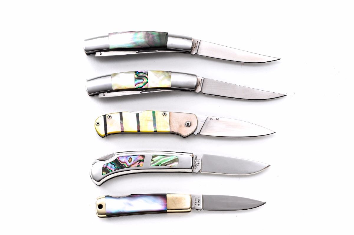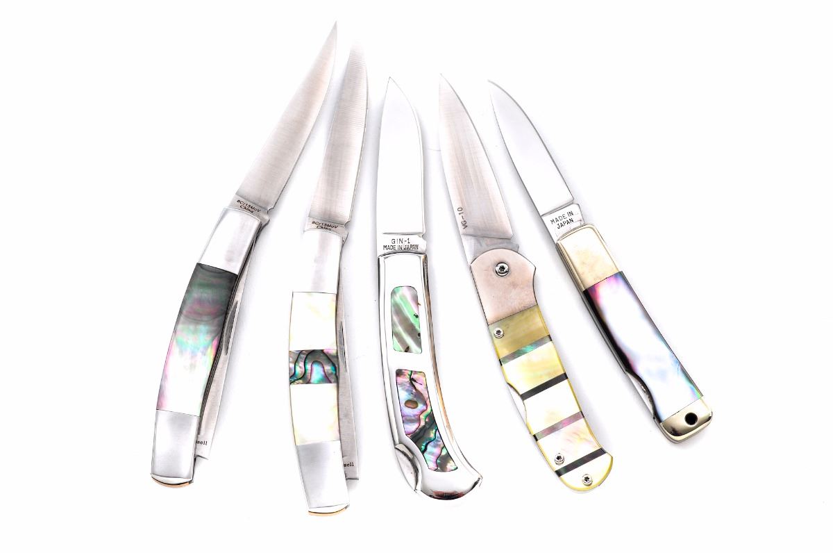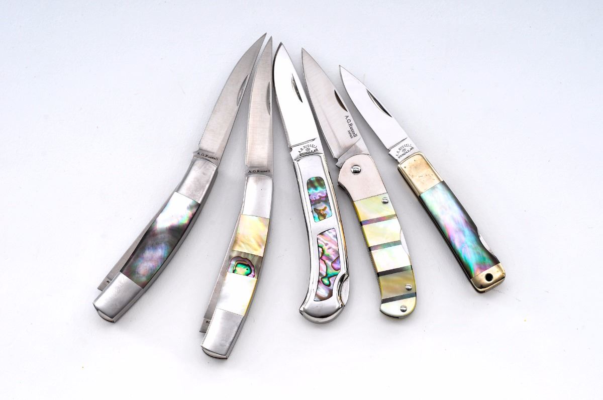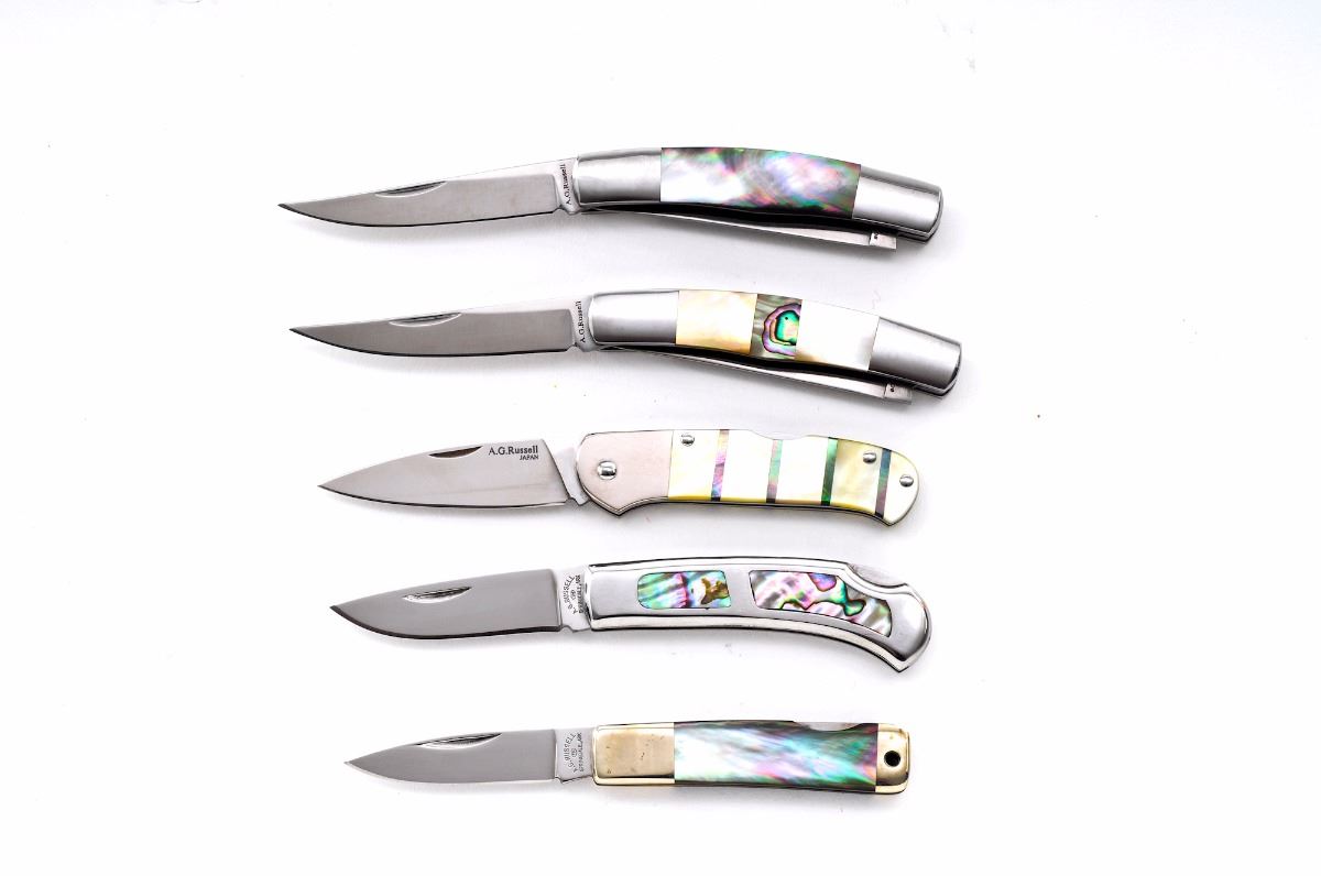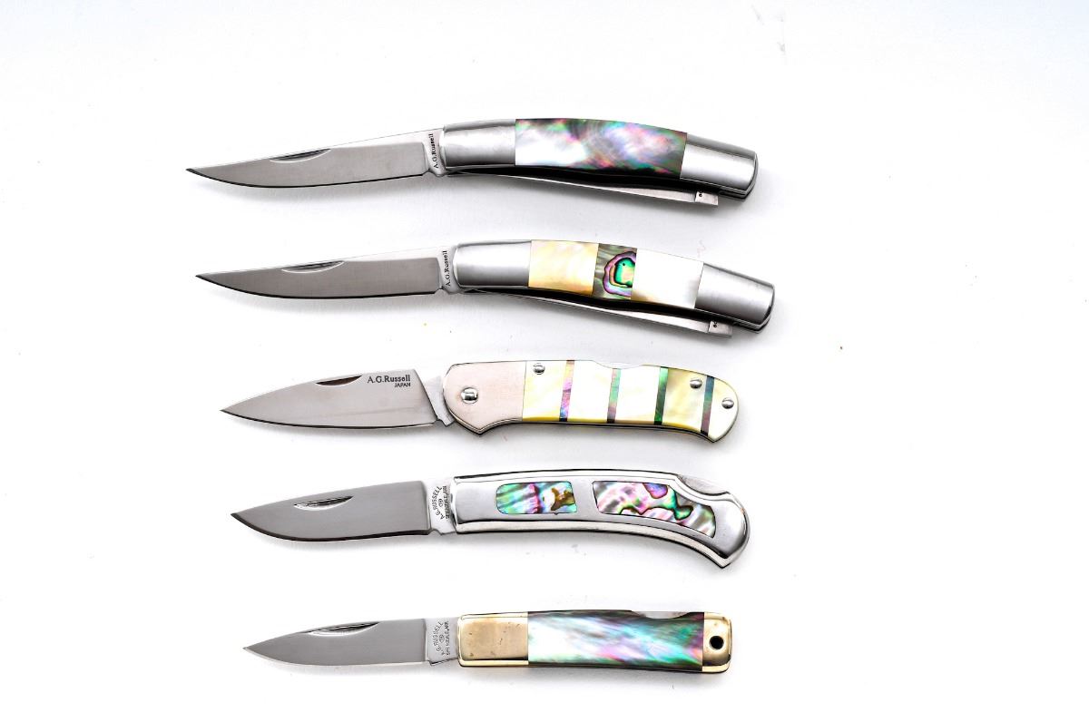 Lot of Five (5) A.G. Russell Folding Knives, including three lock-back and two slip-joint. Handles consist of pearl and abalone, satin and mirror polished bolsters. The two slip-joint knives are mfg'd in China, and the three lock-back knives are mfg'd in Japan. Conditions are excellent, appearing as new, showing no signs of use. One of the pearl handled lock-back knives with moderate micro-scratching and even toning to the bolsters. Est.: $150-$300/lot.
