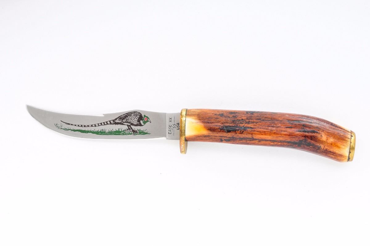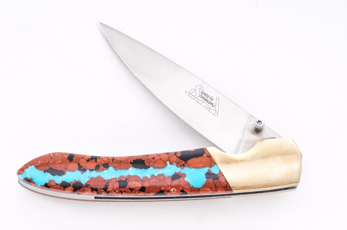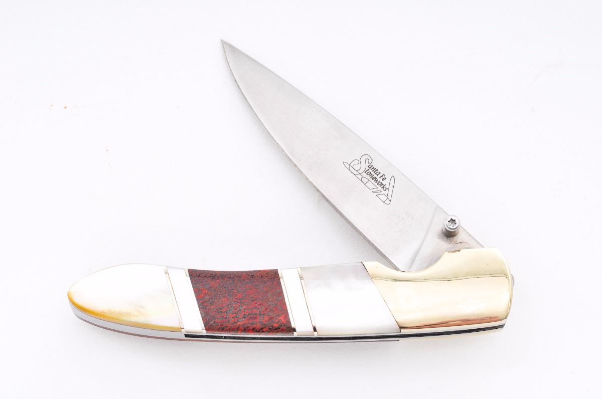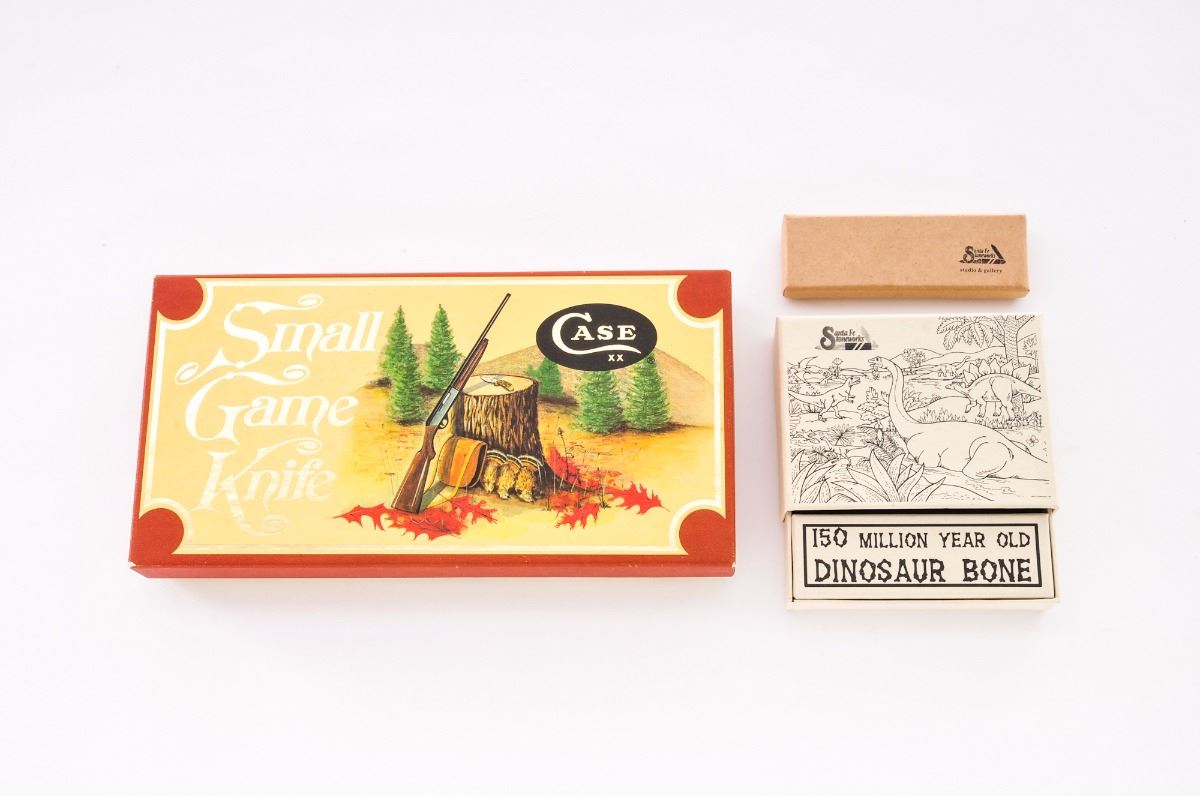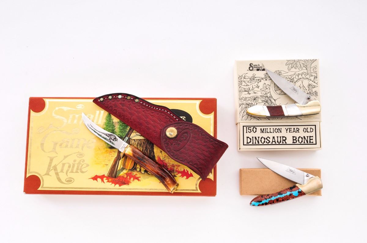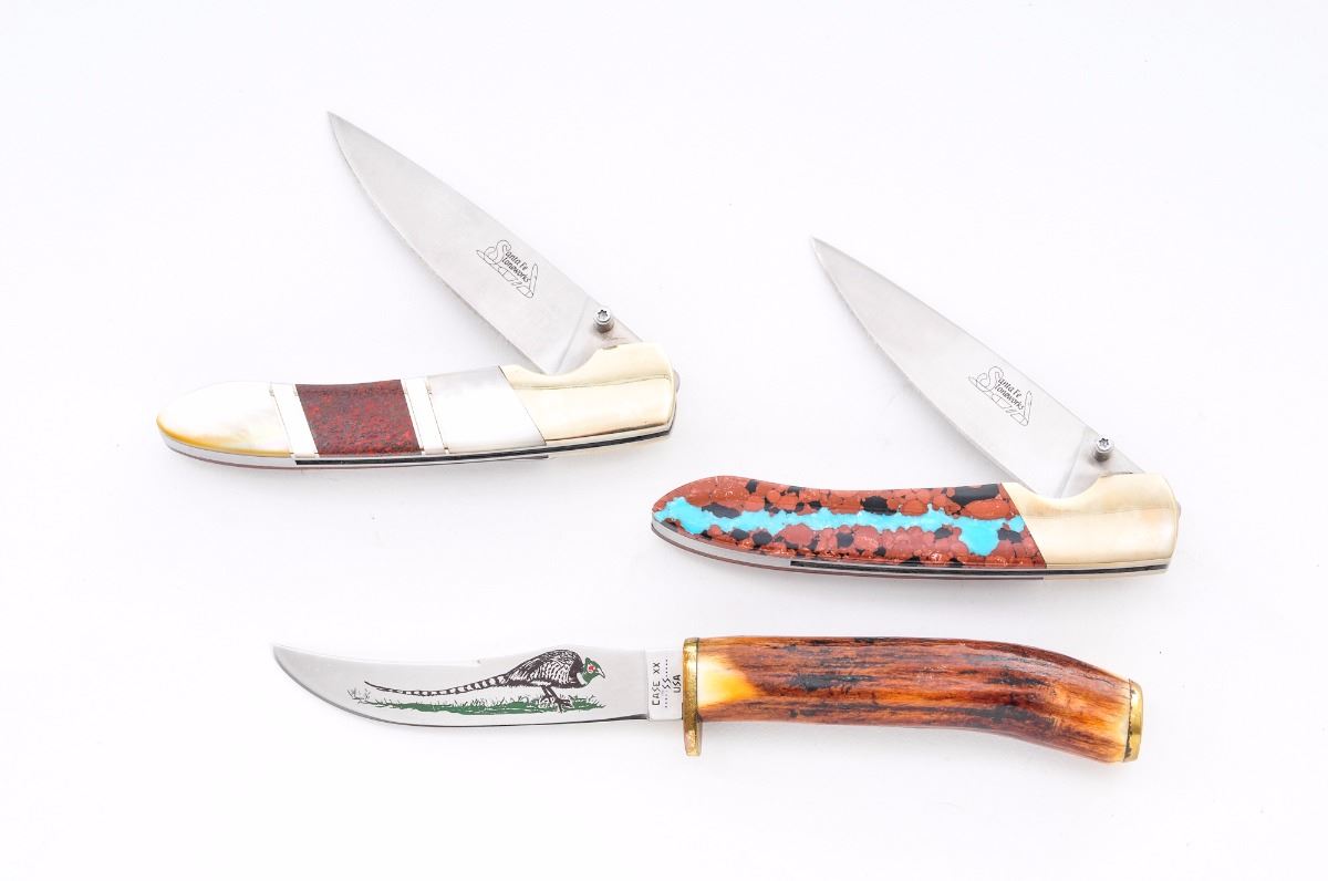 Lot of Three (3) Knives, by Santa Fe Stoneworks and Case: (1) Case Small Game Fixed Blade Knife, 3-1/4'' blade, one side with etched pheasant, 6-3/4'' overall, in original two-piece polychrome box, with leather sheath and owner's manual. (2) Santa Fe Stoneworks Liner-lock Folding Knife, 3'' blade, 4'' overall closed length, with dual thumb studs, nickel silver bolsters, and one grip made of smooth wood, and the other made of a combination of red and blue turquoise. In original box, with belt clip. (3) Santa Fe Stoneworks Liner-lock Folding Knife, 3'' blade, 4-1/8'' overall, nickel silver bolsters, dual thumb stud, one grip of smooth wood and the other grip of pearl and dinosaur bone. In original box with paperwork and belt clip. Condition to all is excellent, appearing as new. Bolsters on the folding knives with mild toning. Slipcover for the Case knife with some yellowing. Est.: $150-$250/lot.