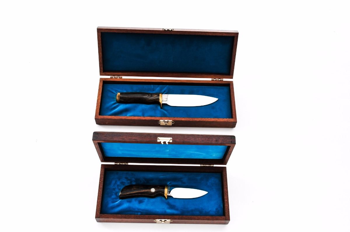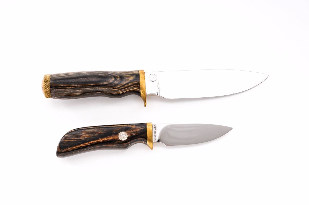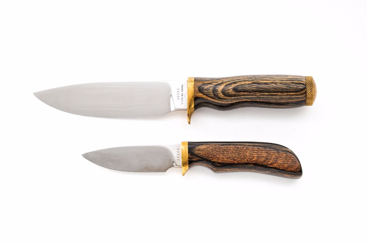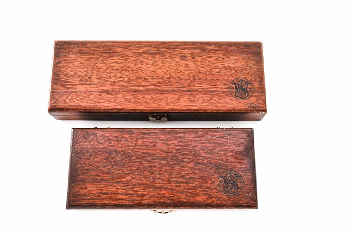 Lot of Two (2) Early Production Smith & Wesson Fixed Blade Knives: (1) #12547, 3-5/8'' mirror polished drop-point blade, 8'' overall length, laminate wood handle with inlaid S&W medallion, in fitted wood case with S&W logo. Condition is fine. Blade appears unused but does have a few scattered scuffs and scratches. Brass parts with moderate toning. Wood case shows some wear. (2) #15469, 5-3/4'' mirror polished drop-point blade, 10-1/2'' overall length, laminate wood handle with threaded brass pommel for access to storage cavity, in fitted wood case with S&W logo. Condition is very good. Blade appears unused but does have four small chips out of the cutting edge. Brass parts with moderate toning. Wood case shows some wear. Est.: $150-$300/lot.