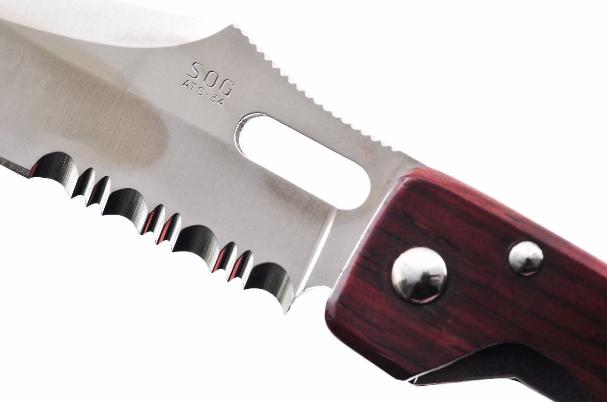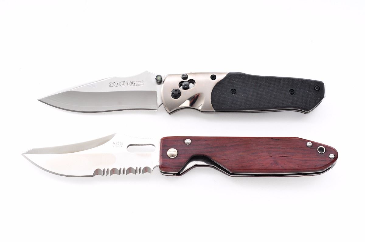 Lot of Two (2) SOG Folding Knives, both mfg'd in Seki, Japan: (1) SOG Arc-Loc, 3-3/8'' blade, 4-1/2'' overall closed length, single thumb stud, with black carbon fiber grips, belt clip, and in an unmarked black box. (2) SOG Jetedge Liner-lock Folding Knife, 3-5/8'' blade, 4-3/4'' overall closed length, smooth wood grips, with belt clip. Condition to both is excellent, appearing as new, showing only light marks from handling. Est.: $250-$400/lot.