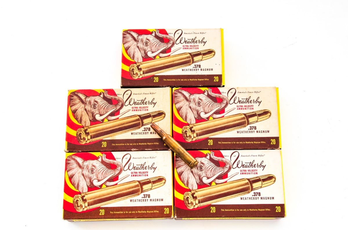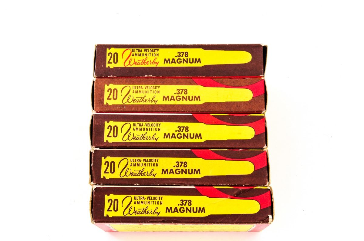 Lot of Four (4) Boxes of Weatherby .378 Wea. Mag. and one box of once-fired brass. In classic Weatherby boxes with elephant head graphic. Includes two full boxes of 270-grian soft-point Ultra-Velocity cartridges, 20 rds. per box, and two boxes of 300-grain soft-point Ultra-Velocity cartridges, 20 rds. per box (one round has been fired). Condition to all is excellent. Some brass with moderate toning. Boxes show some wear and discoloration. Est.: $300-$400/lot.