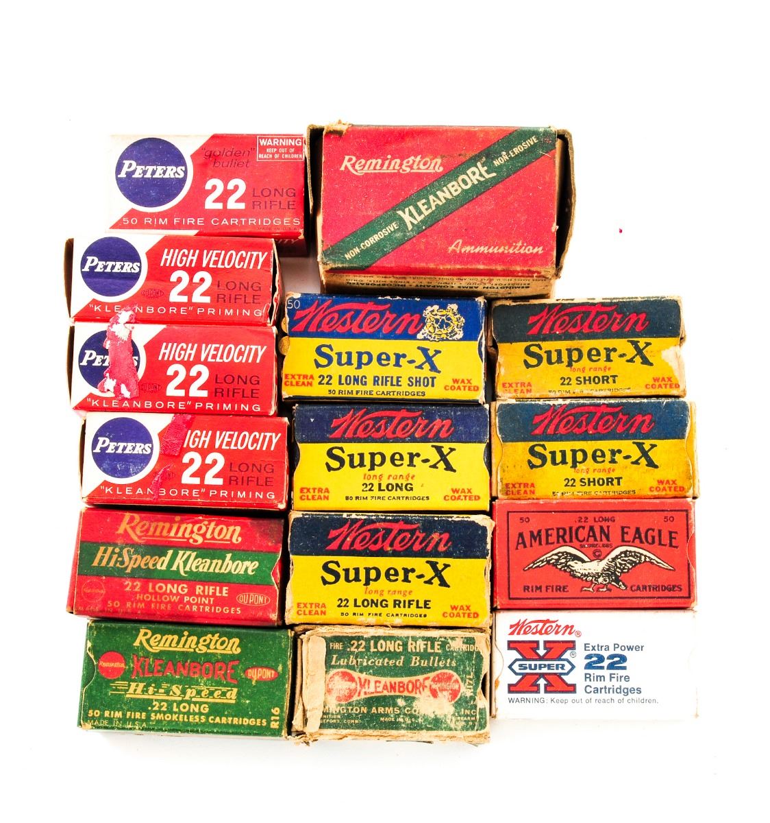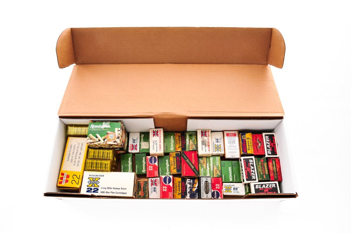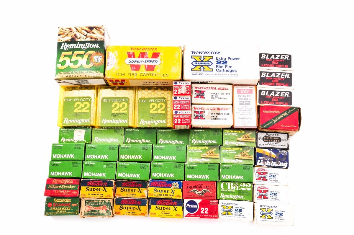 Approx. 4000 Rounds of .22 Cal. Ammunition, including roughly 3200 rounds of .22 LR, 400 rounds of .22 Short, 150 rounds of .22 Hornet, 100 rounds of .22 mag., and 150 rounds of .22 Hyper Velocity cartridges. Mfg'rs include Remington, Winchester, Peters, etc. Condition to all is excellent as unfired. Some boxes show moderate+ wear. A few of the vintage boxes with missing end flaps. The 550 round brick of Remington .22 LR has been opened and has mixed cartridges, appearing to be 3/4s of the way full. Spot check reveals all other boxes as full. Est.: $250-$400/lot.