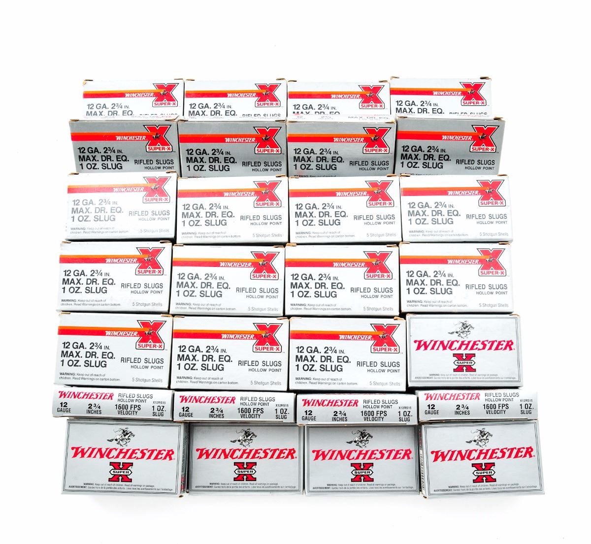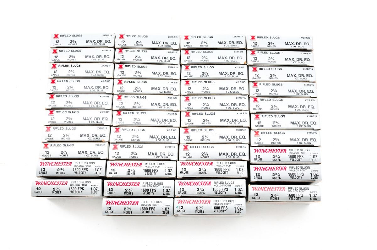 Ammo Lot: 42 Boxes of Winchester 12 ga. hollow-point Rifle Slugs, 2-3/4'' shells, 1 oz. slug, 5 rounds per box, with a total of 210 rounds. Condition to all is excellent, appearing as new. Some boxes show light wear. Est.: $125-$225/lot.