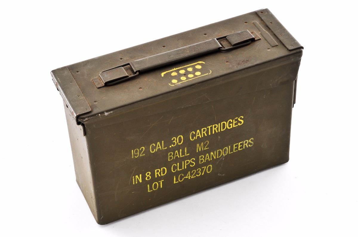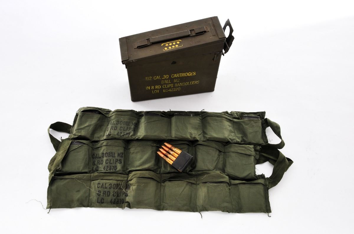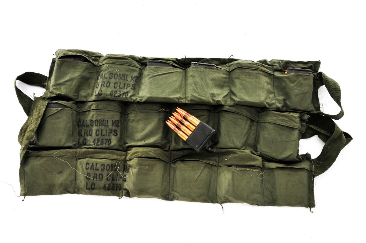 Ammo Lot: 120 Rounds of .30-06 Cartridges in En-Bloc Clips. Spot check reveals LC-67 headstamps. Includes three (3) bandoliers and ammo can. Condition is excellent; brass shows some toning. Est.: $75-$125/lot.