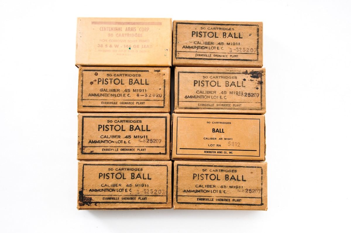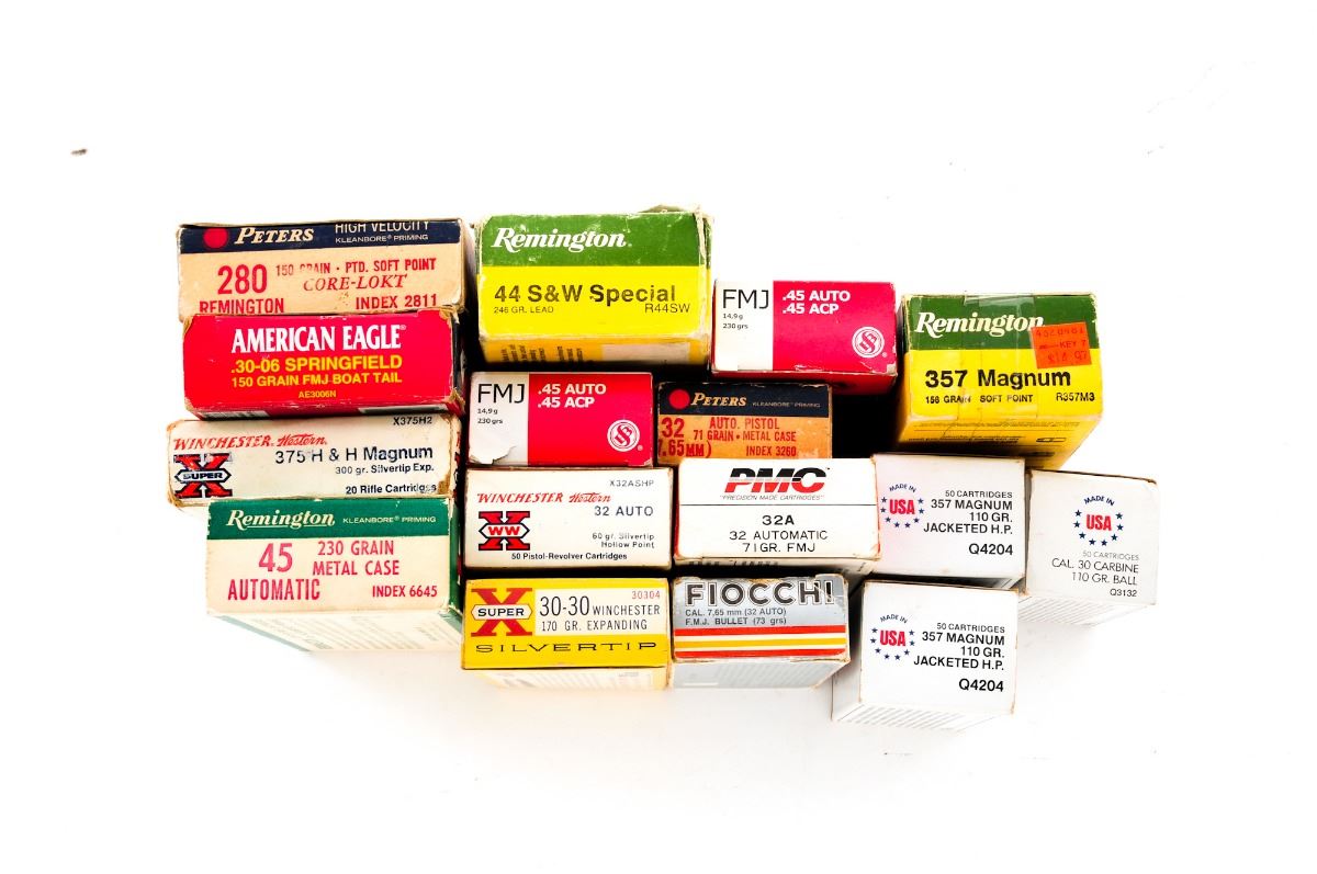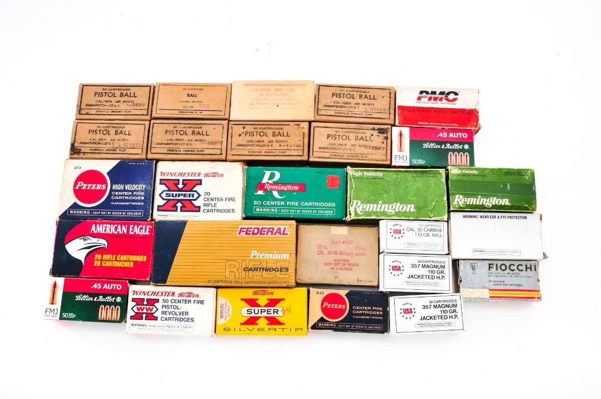Misc. Handgun and Rifle Ammo Lot: Handgun ammo consists of one box of .44 S&W Special; nine (9) boxes of .45 Auto, which includes six boxes from the Evansville Ordnance Plant; three (3) boxes of .357 mag.; two (2) boxes of .38 Auto; and one box of .38 Spec. All contain 50 rounds per box. Also, three (3) partial boxes of .32 Auto, and one partial box of .45 Auto. Mfg'rs include Remington, Winchester, Fiocchi, etc. Rifle ammo consists of one box of .30-30; one box of .30-06; one box of .30 Carbine; one box of .280 Rem.; one box of .375 H&H mag.; as well as a partial box of .375 H&H mag. and partial box of .30-06. Mfg'rs include Federal, Winchester, Peters, etc. All ammo appears to be factory; some boxes with mixed headstamps. Some brass with moderate toning. Boxes show some wear, tape residue, and a few are missing end flaps. Est.: $200-$350/lot.