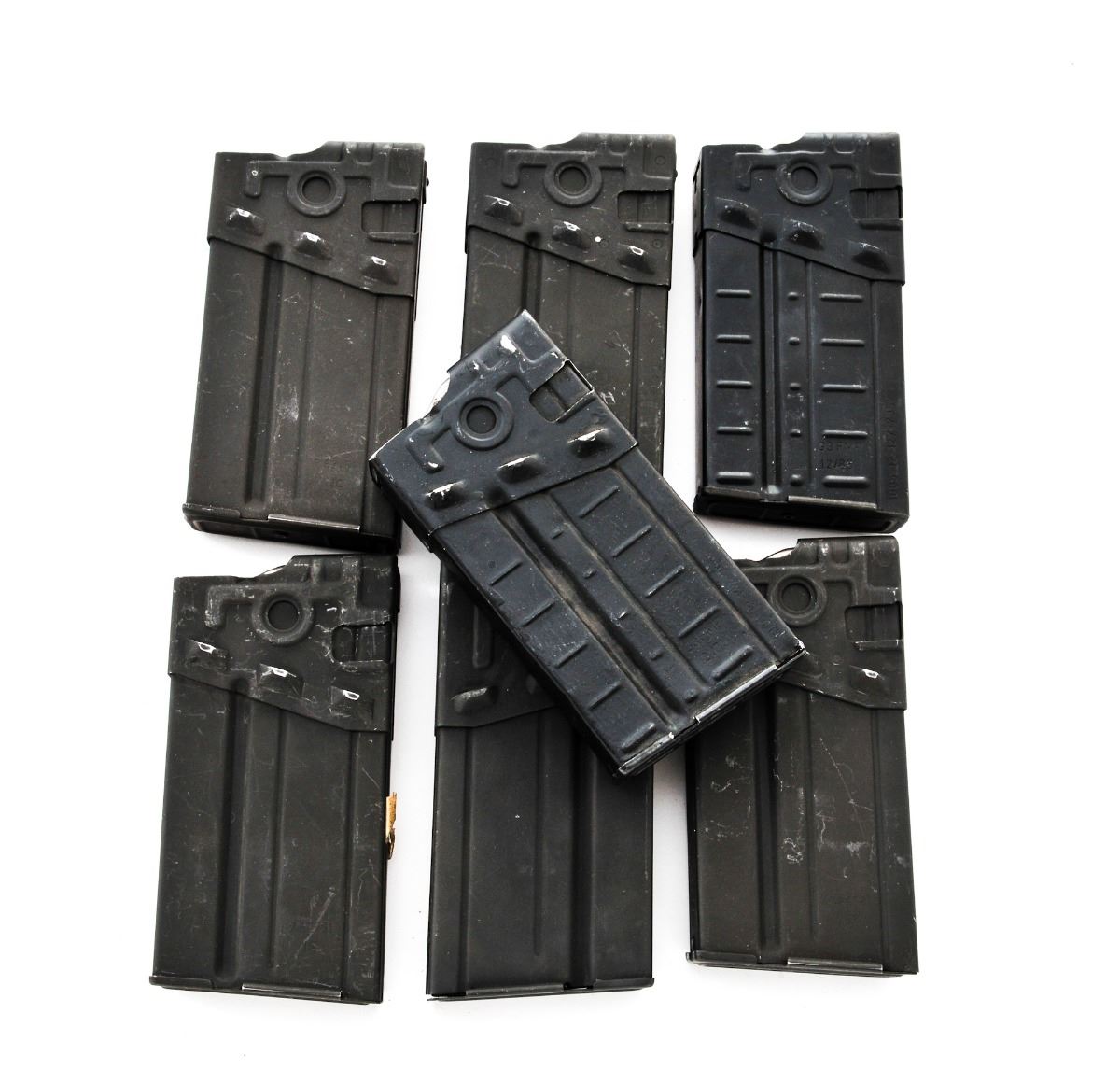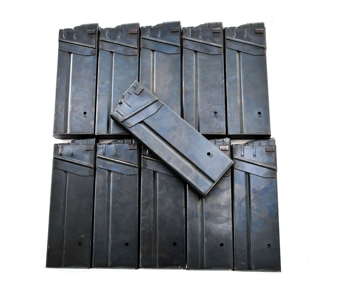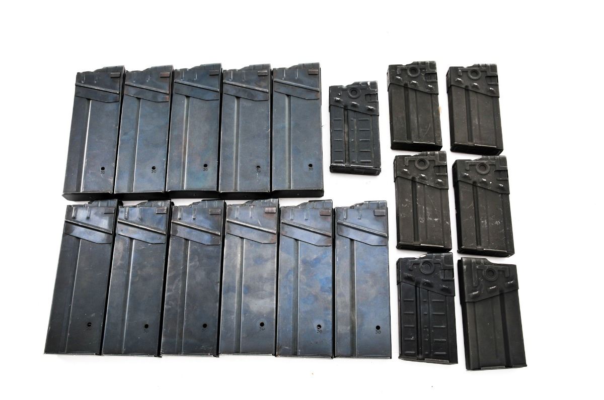 Lot of Eighteen (18) High-Capacity Magazines, .308 cal., includes eleven 30-round and seven 20-round. Appear to be for an HK91 but are unmarked. All are in good to fine used condition. Est.: $300-$500/lot. (High cap mags not available to Calif. residents.)