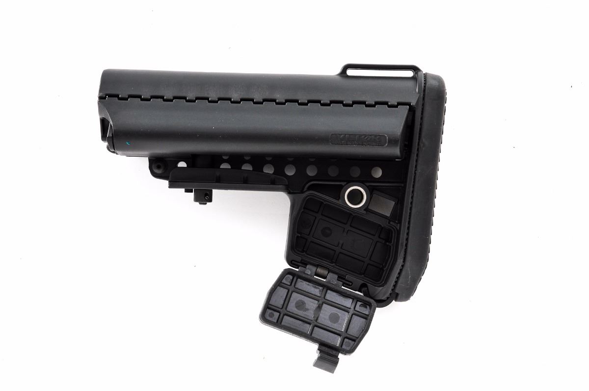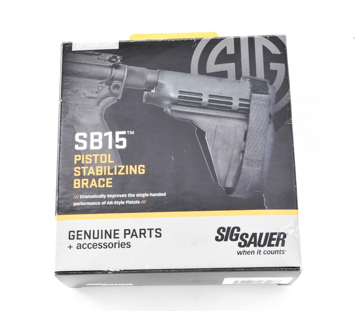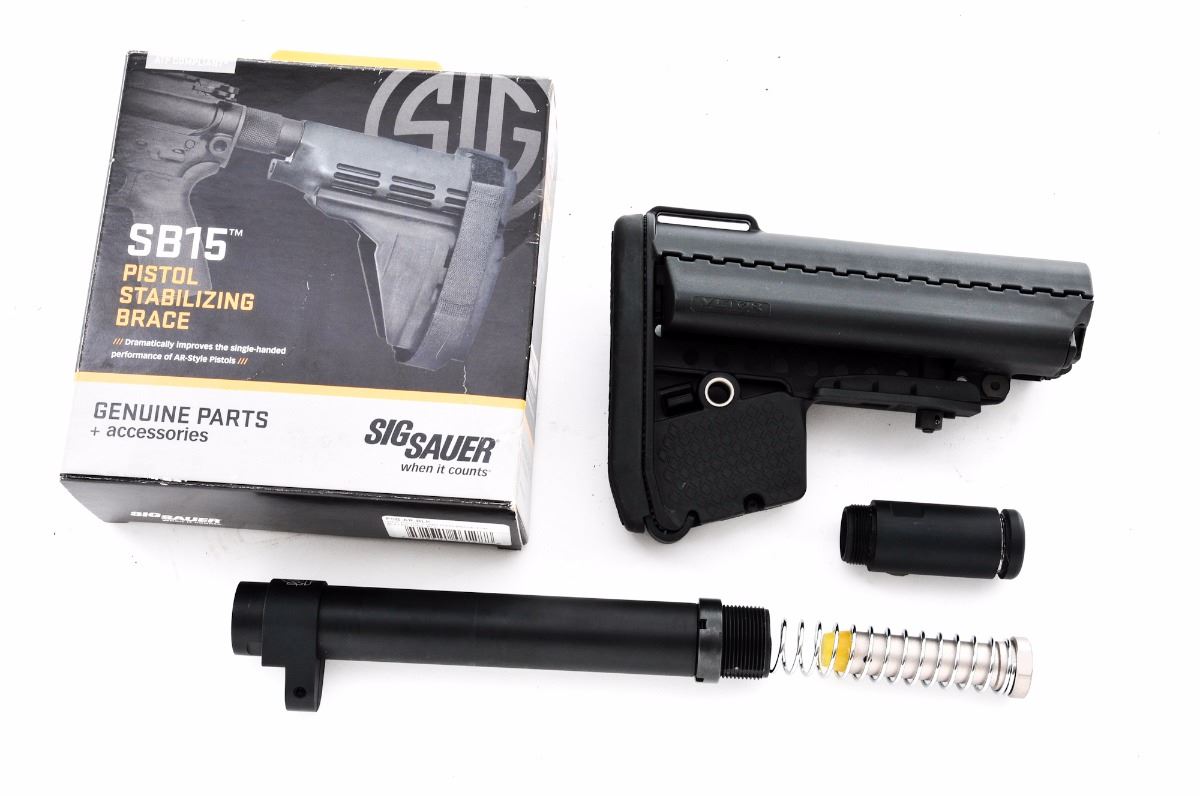 Lot of Three (3) AR Accessories: (1) Sig Sauer SB15 Pistol Stabilizing Brace, designed for AR style pistols, in original box with instructions, showing signs of moderate use with some white residue present. Original price was $115.95. (2) Vltor MOD AR stock, black, and appears unused with only light marks from handling. (3) Extended Buffer Tube Kit for an AR pistol, by TPM, black finish, in excellent condition. Est.: $150-$250/lot.