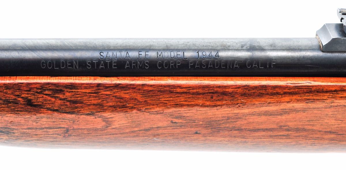 Golden State Arms, Santa Fe, Model 1944 Sporterized Enfield Rifle, #66240, .303 cal., 22'' barrel, blue finish, hardwood stock, with Santa Fe red rubber recoil pad, fixed front sight, folding notched rear sight, with one magazine. Condition is fair. Metal surfaces retain approx. 85%-90% thinning and lightly toning blue. Stock with thru-bolt repair, an additional crack at front of triggerguard, and a small repair at top back edge of buttstock. Due to the repairs, this rifle should be checked by a competent gunsmith before firing. Action is crisp; bore with light frosting in the grooves, but is in otherwise excellent condition with well-defined rifling. Est.: $150-$250. (C&R)