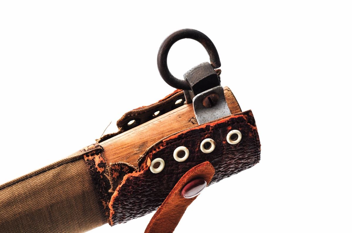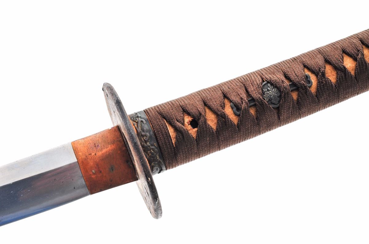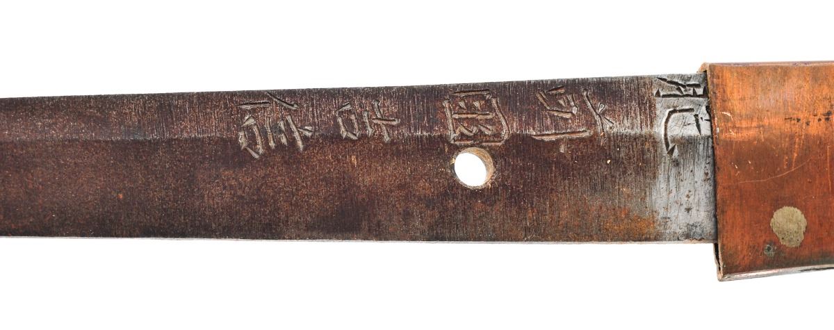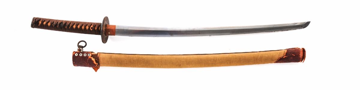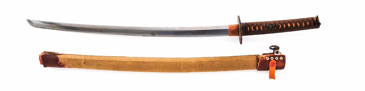 Late War Japanese Officer's Sword, 26'' blade length, copper collar, plain old iron tsuba with leather washer, brown handle wrap, cast iron Menuki, flat copper end cap. Contained in late-war canvas covered wooden scabbard with deteriorating leather fittings and iron suspension ring, which may be a later addition. Blade is signed with what appears to be a forged name. Condition is very good, appearing to have a machine made blade with no separations or chips in the edge. Blade shows light surface clouding and a few areas of corrosion. Est.: $250-$500.