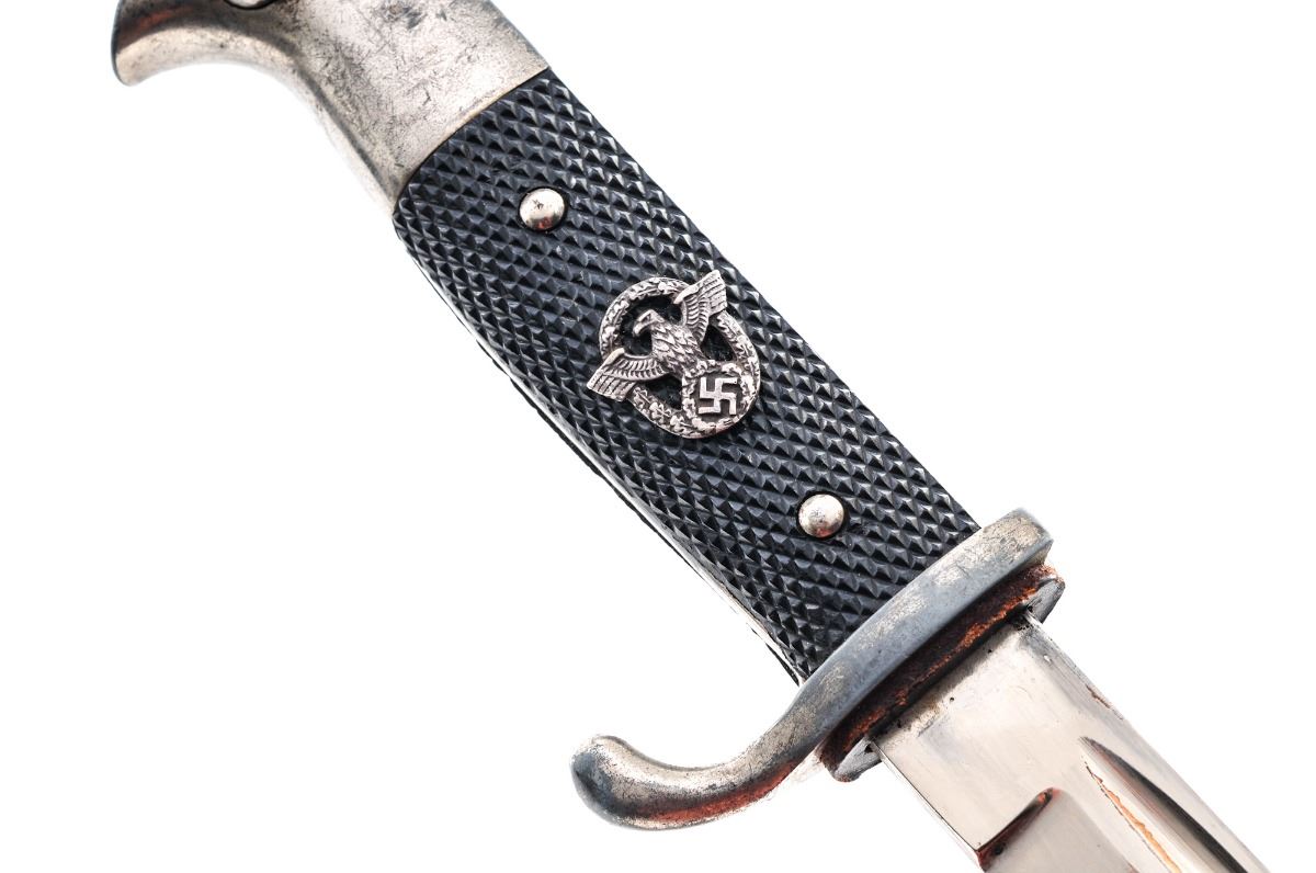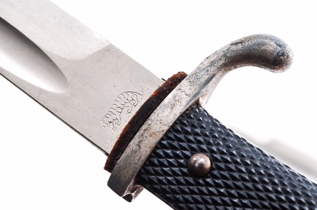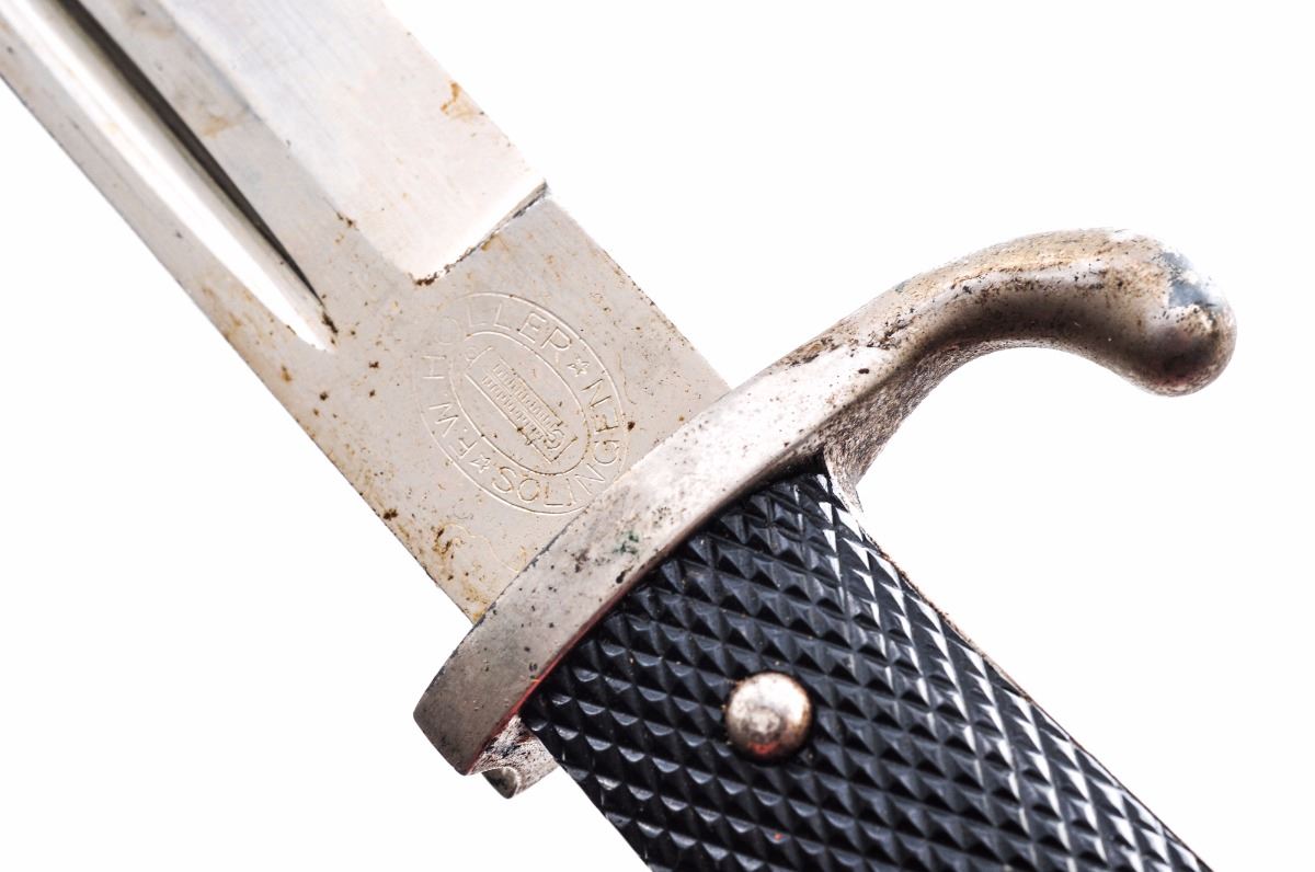 Lot of Three (3) WWII German Dress Bayonets: (1) Short military, by F. W. Holler, 12-1/2'' overall, 7-1/2'' plated blade showing slight loss to plating near tip with surface scuffs from drawing but no corrosion; original leather washer is missing. Plated handle shows surface dulling to the plating with slight loss to the crossguard and near the mortise. Riveted grip panels are intact. Mortise button functions, mortise has red felt insert. Scabbard is undented showing original lacquer paint with moderate surface corrosion, scratches and some losses. (2) Short Police, by Alcoso, 12-1/2'' overall, 7-1/2'' plated blade is in excellent condition with no losses, just some minor scratches from drawing the blade; original washer is intact. Plated handle shows dulling and losses overall with dents to the pommel on reverse side. Police eagle is original as it was pinned in place prior to assembly. Grip panels are excellent with no cracks or chips. Mortise button and lock function well. Scabbard is repainted and has one dent under the frog stud. (3) Long military, by Tiger/Solingen, 17-1/2'' overall, 9-1/2'' blade. Plated blade is in good condition showing light surface dulling with scattered age spots. Handle shows general dulling to the plating with light surface corrosion overall and slight losses to the crossguard. Mortise button functions well. Undented scabbard shows light corrosion overall and one sanded area on the reverse side. Est.: $250-$350/lot.