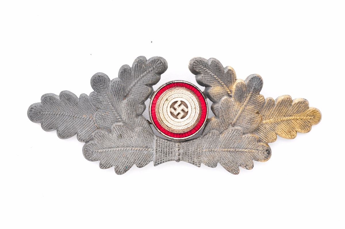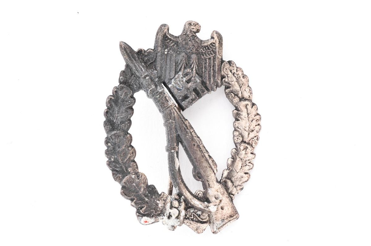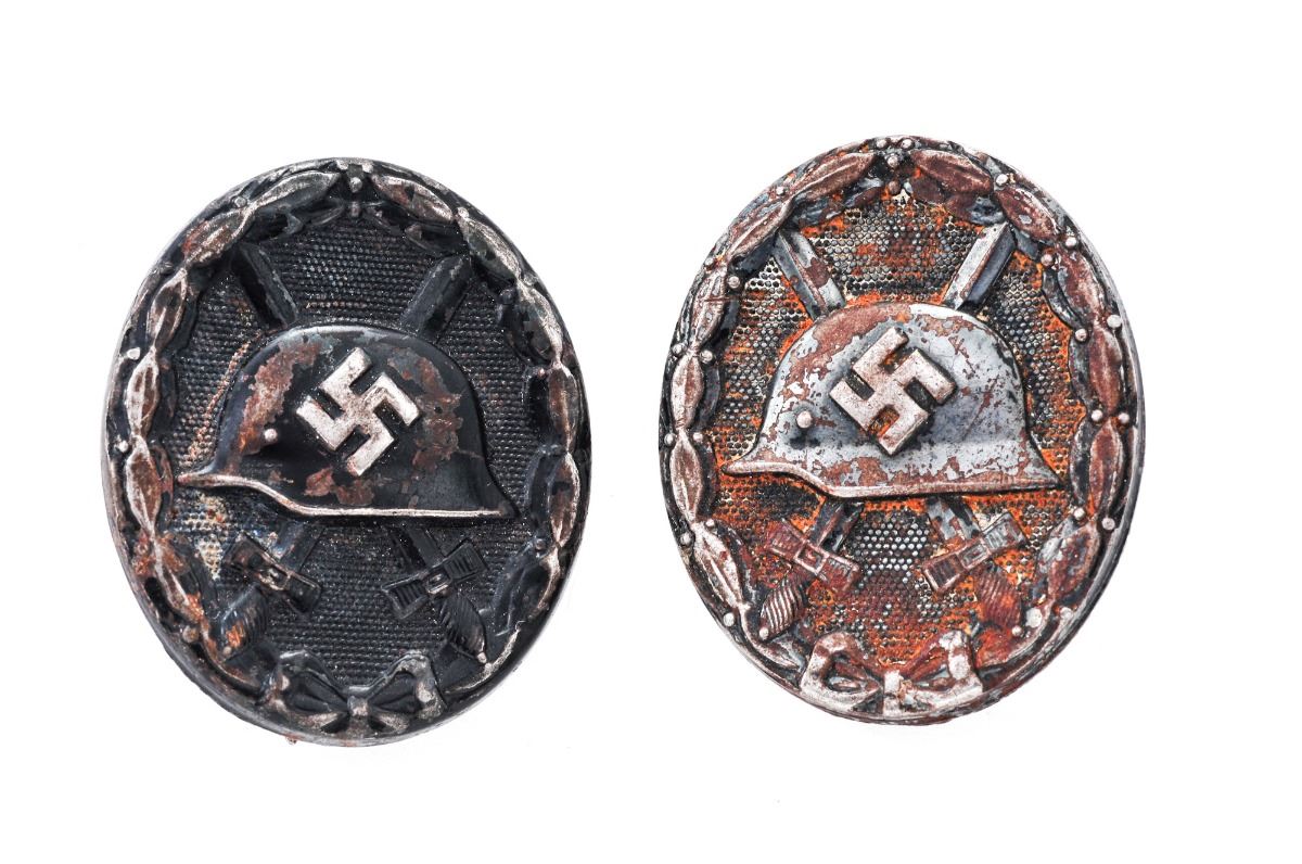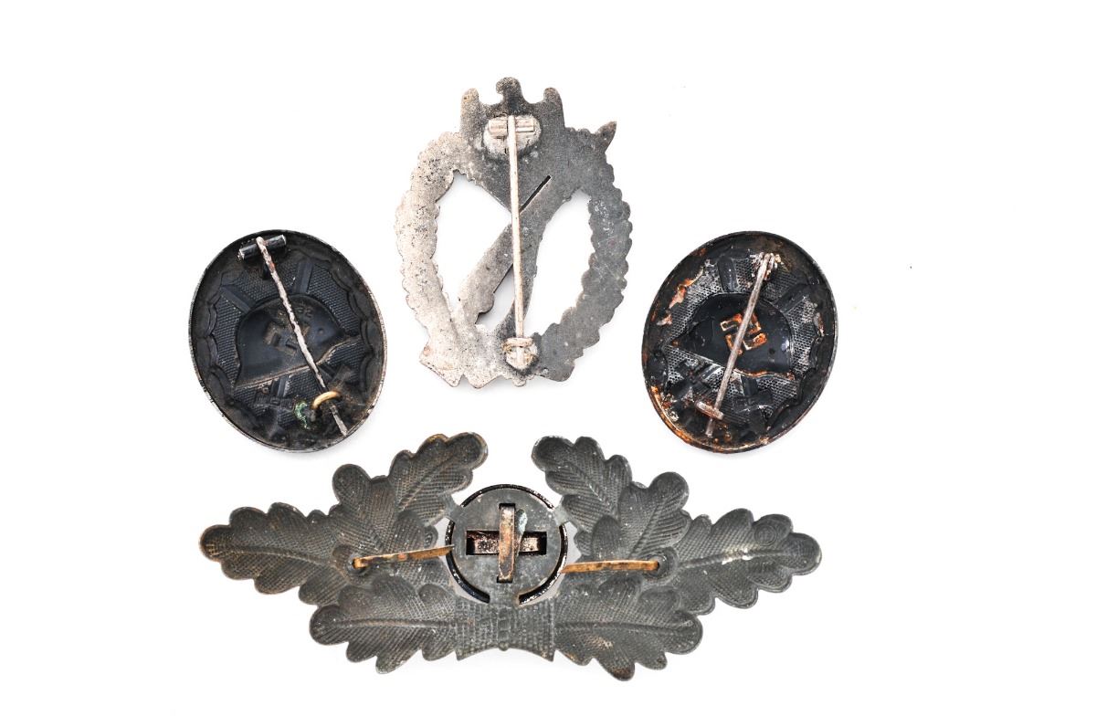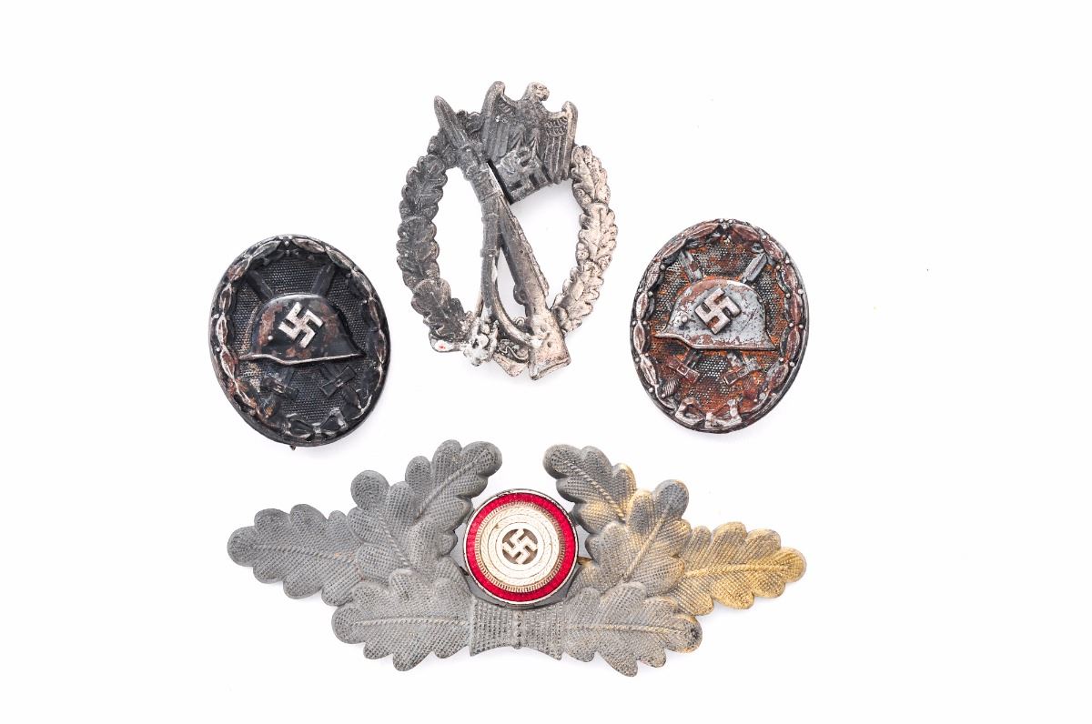Lot of Four (4) WWII German Items: (1) Unmarked stamped steel black wound badge, with some surface oxidation on front, pin is intact. (2) Stamped steel black wound badge, marked ''32'' on rear, pin intact with approx. 75% finish remaining, no oxidation. (3) Reproduction Infantry Assault Badge. (4) NSDAP Political Leader's cap piece, with some gold wash remaining on oak leaves, and nice enamel and silver on insignia. RZM M1/111 marked. Est.: $75-$150/lot.