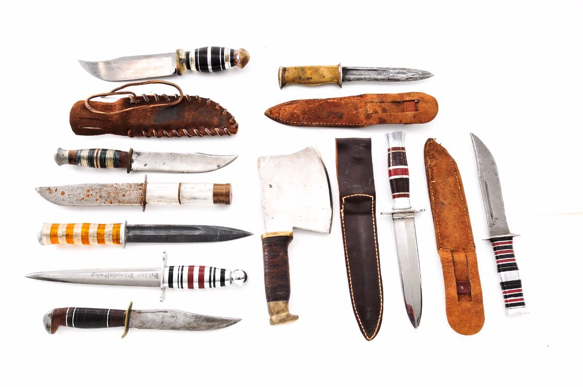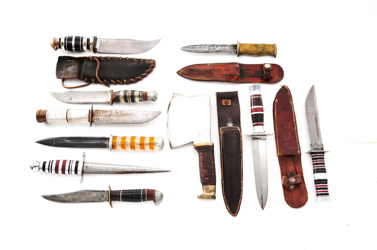 Lot of Nine (9) Theater Made Knives and a Cleaver, overall lengths vary from 9'' to 12''; handle materials include a combination of handle materials include a combination of Plexiglas, cast aluminum, Micarta, aluminum spacers, stacked leather, etc.; with curved, clip-point and double-edged blades; four with leather sheaths, one that appears to be of later mfg. One of the blades is marked ''Hetmann of Ukraine 1649-1657''; reverse reads ''Bohdan Khmelnitsky'', referring to former Head of State in what is now part of the Ukraine. Cleaver is approx. 9-1/4'' in overall length with 4'' wide head, heavy steel with brass bolster and pommel, and stacked leather washer handle. Conditions range from fair to very good. One with a considerable amount of spotting and surface rust to blade; the remainder show additional sharpening and re-shaping that is expected with theater made knives. Est.: $200-$400/lot.