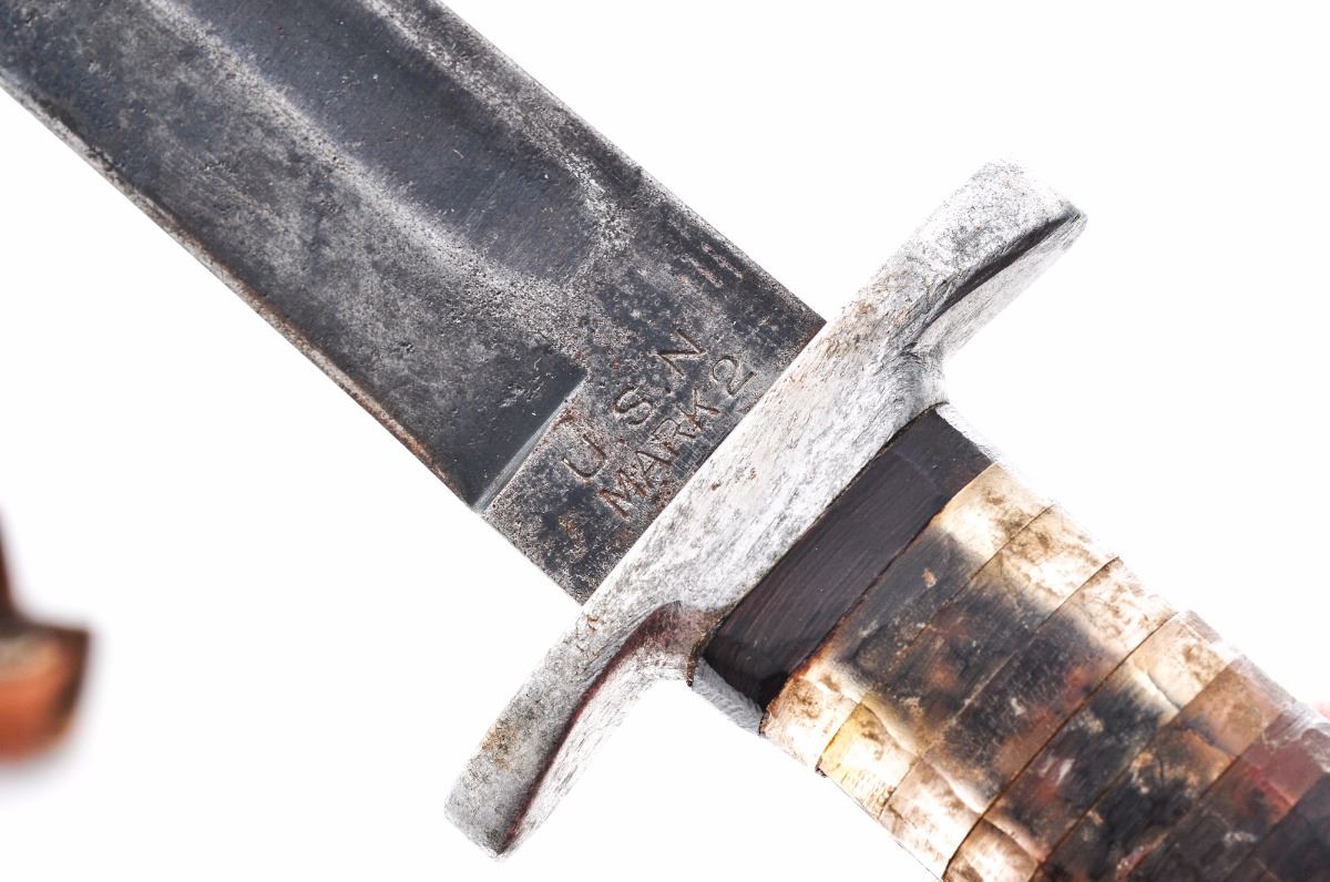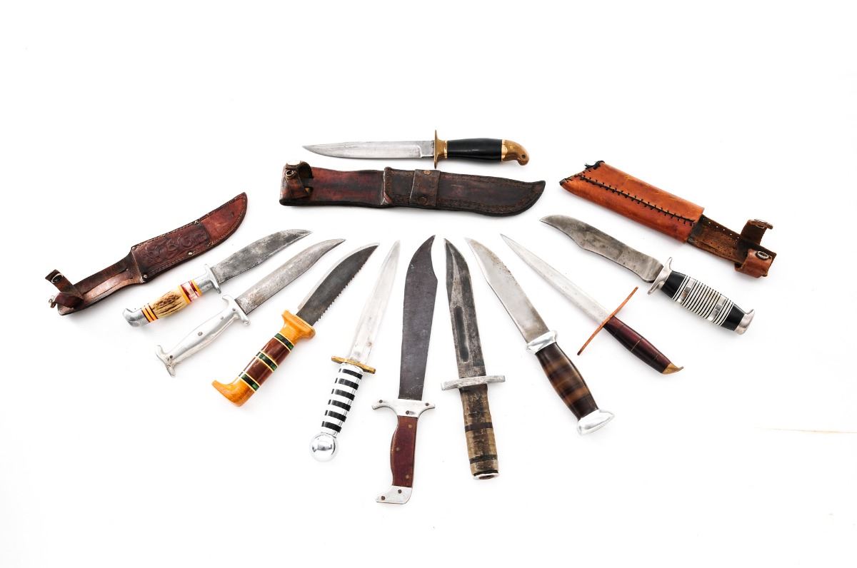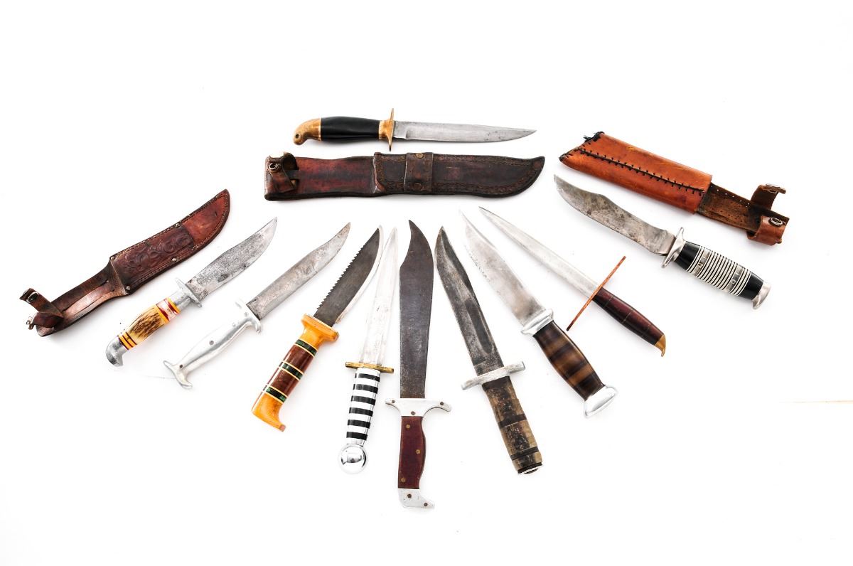 Lot of Ten (10) Theater Made Knives, overall lengths vary from 10'' to 12-1/2''; handle materials include a combination of Plexiglas, cast aluminum, Micarta, stacked leather, etc.; with curved, clip-point and double-edged blades, three with period leather sheaths. One is named to ''Trueman L. Brice'' and is legible thru a fiberglass spacer on the handle; another is stamped on the aluminum pommel ''F.C. Haroldson, Breckinridge, Minn.'' One of the knives is a re-handled USN MK II fighting knife by Camillus. Conditions range from fair to very good. USN MK II knife with general fine corrosion. One with overall dark patina to blade; the remainder show additional sharpening and re-shaping that is expected with theater made knives. Est.: $200-$400/lot.