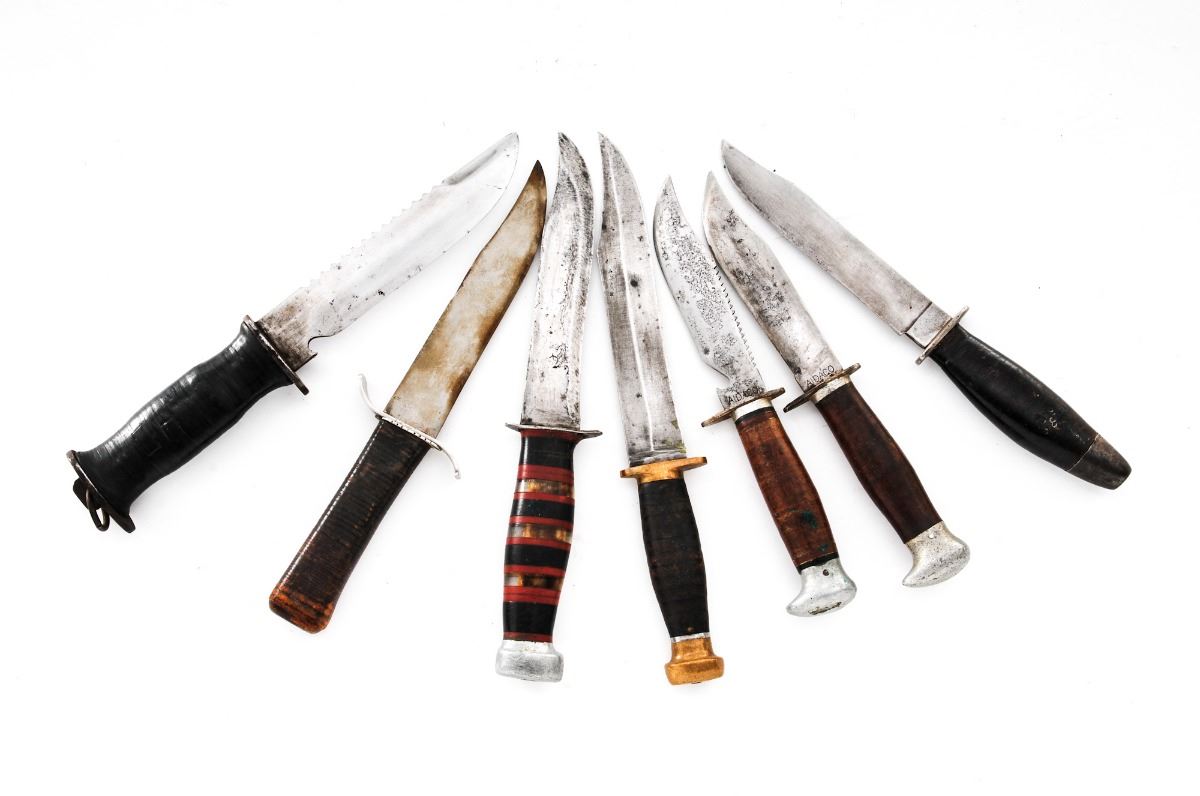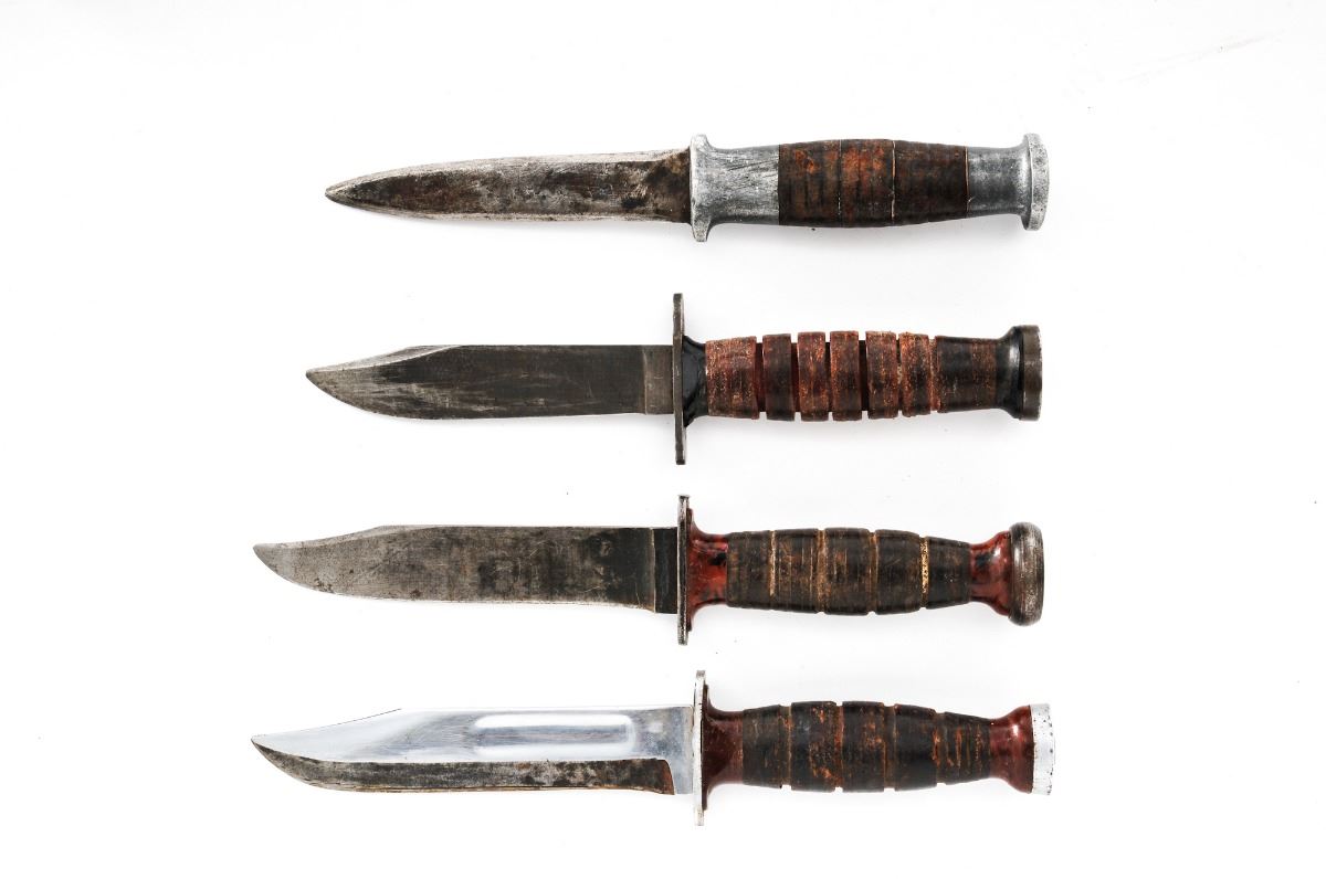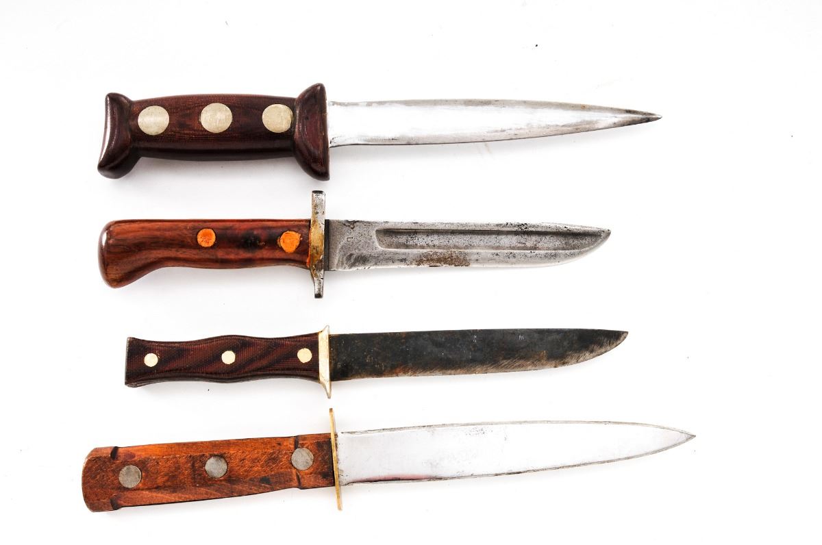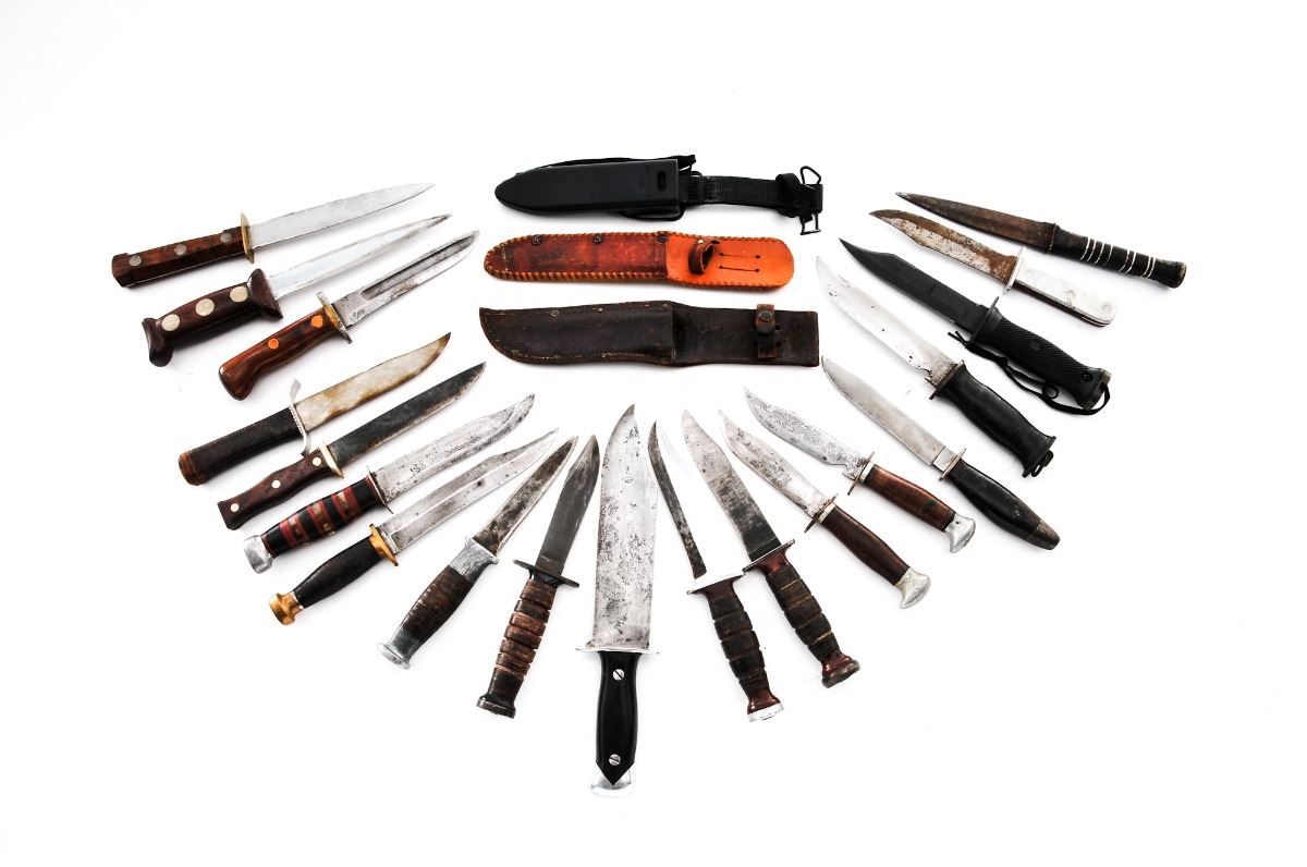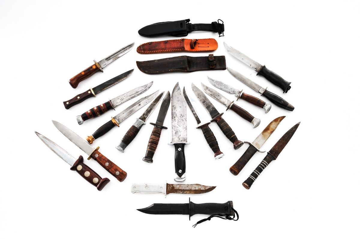 Lot of Nineteen (19) Total: Four (4) military and fifteen (15) theater made knives. Military knives include an EGW fixed blade knife with sheath, two Ka-Bar commando knives with Bakelite and stacked leather washer handles, and a U.S. Navy MK III Model 0, with sheath. Fifteen (15) theater made type knives of various construction and age. Some appear to have been made from commercial hunting knives. Handles are made from stacked leather washers, aluminum spacers, Micarta, aluminum, and smooth wood. Condition of the theater made knives, two Ka-Bar commando knives and EGW knives range from poor to good showing varying signs of age, sharpening/re-shaping to the blades, and wear to the handles. The MK III Model 0 is as new, with blade showing light sheath wear. Est.: $250-$400/lot.