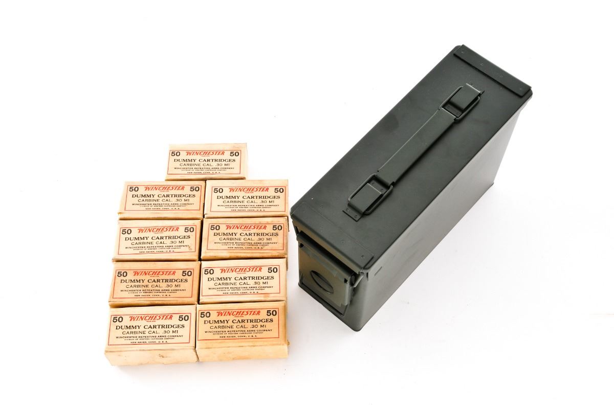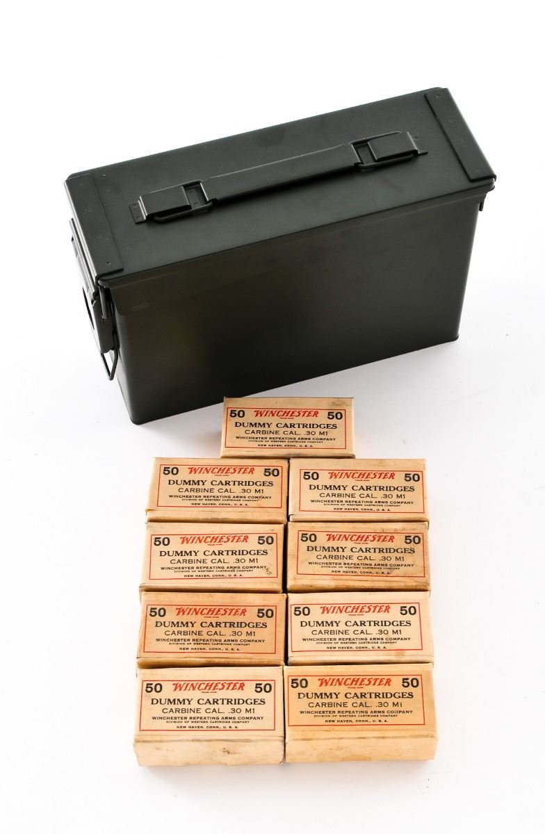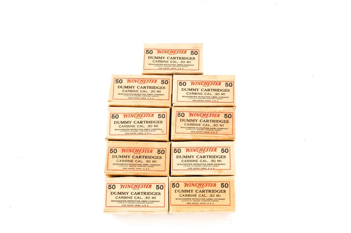 Lot of Nine (9) Boxes of Collectible Winchester M1 Carbine Dummy Cartridges, 50 rounds per box, in plain two-piece boxes stamped on backside ''42 / Made in USA'', with Winchester label showing red and black writing. Five of the boxes are still sealed on both edges; four have been opened; one box appears to be missing a few cartridges. Condition to all is fine to near excellent. Boxes show some yellowing and wear. Labels remain clear. Exposed cartridges in opened boxes show some toning. A nice collectors lot, in ammo can. Est.: $175-$275/lot.