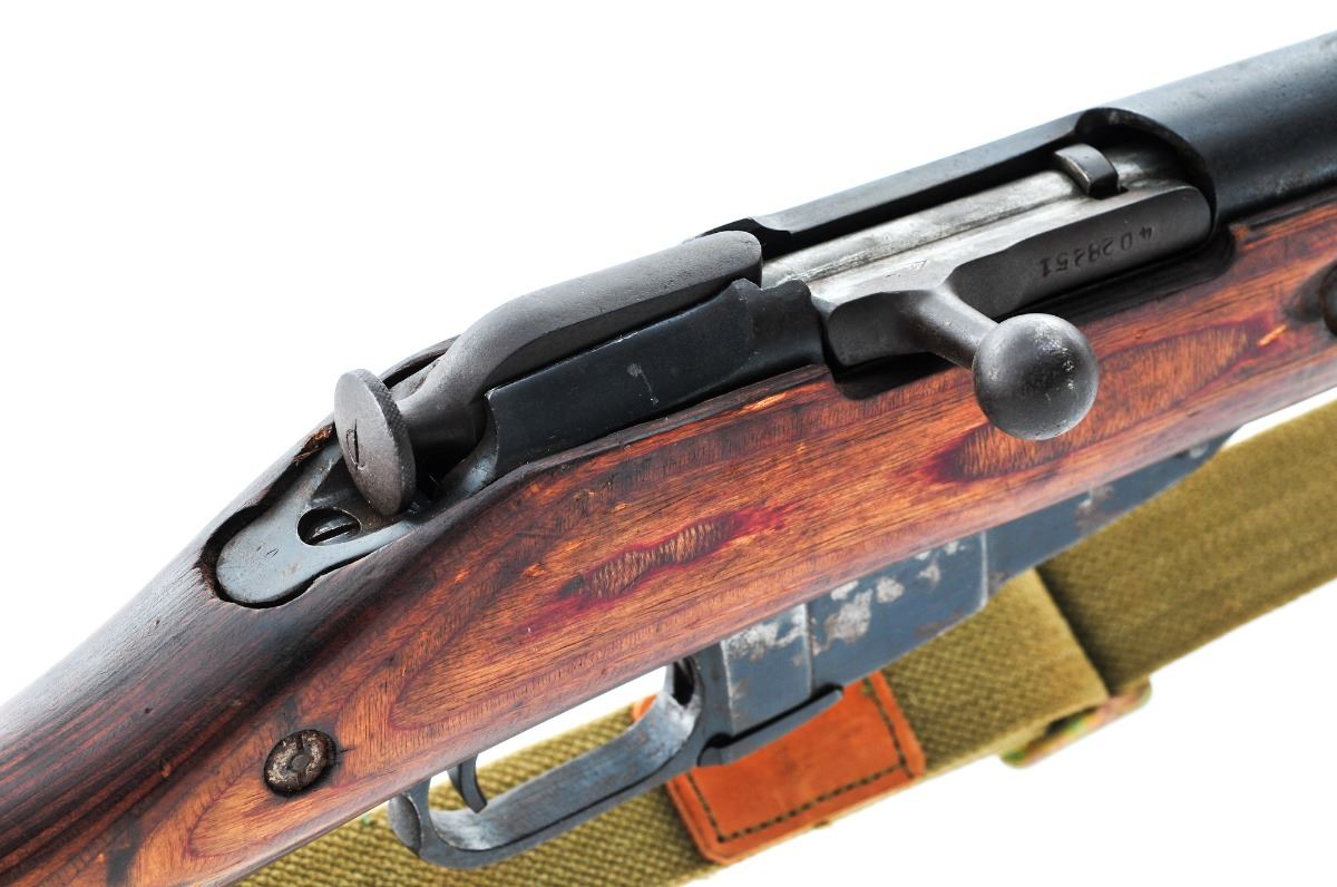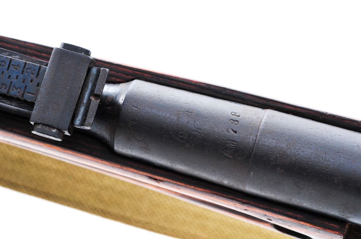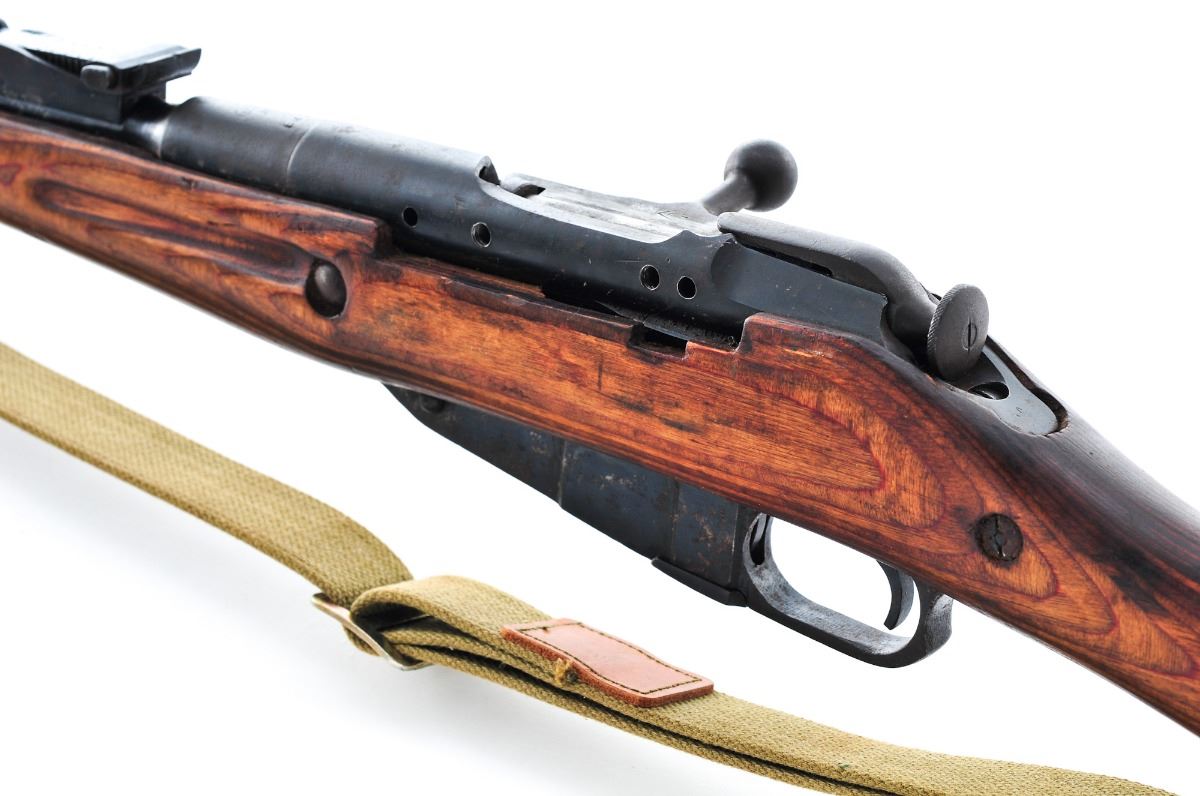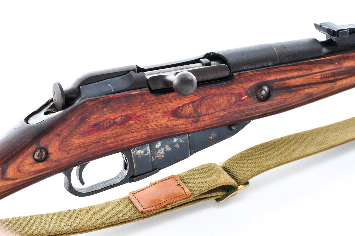 Russian Mosin-Nagant M91/30 Bolt Action Rifle, #BM788, 7.62x39Rmm, 30'' barrel, blue finish, laminated fingergroove wood stock, post in circle front sight and ladder adjustable rear sight, marked 1944 on receiver ring. Includes Field Sport long eye relief 2-7x 32 scope. Condition is good retaining approx 10% original blue in protected places, the balance turning an even brown patina with light surface corrosion overall. Stock is oil darkened in many places but sound, with repaired crack at the toe. Action is tight, bore is dark. Receiver and stock are cut/drilled and tapped for side mount scope. Est.: $150-$300. (C&R)