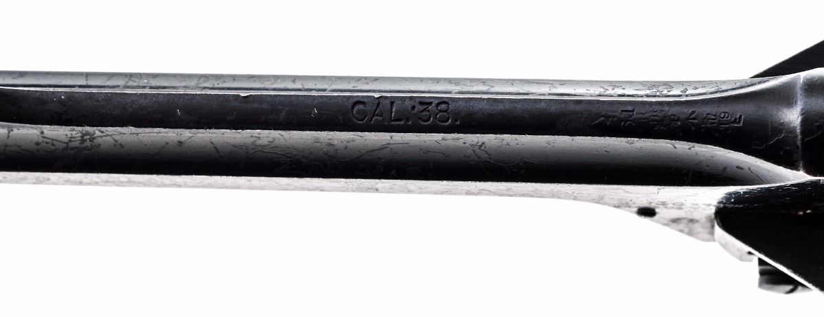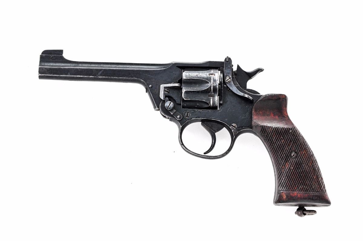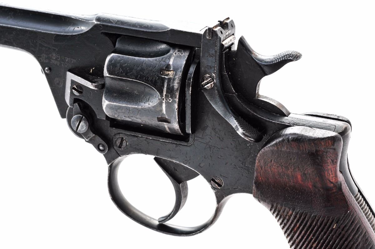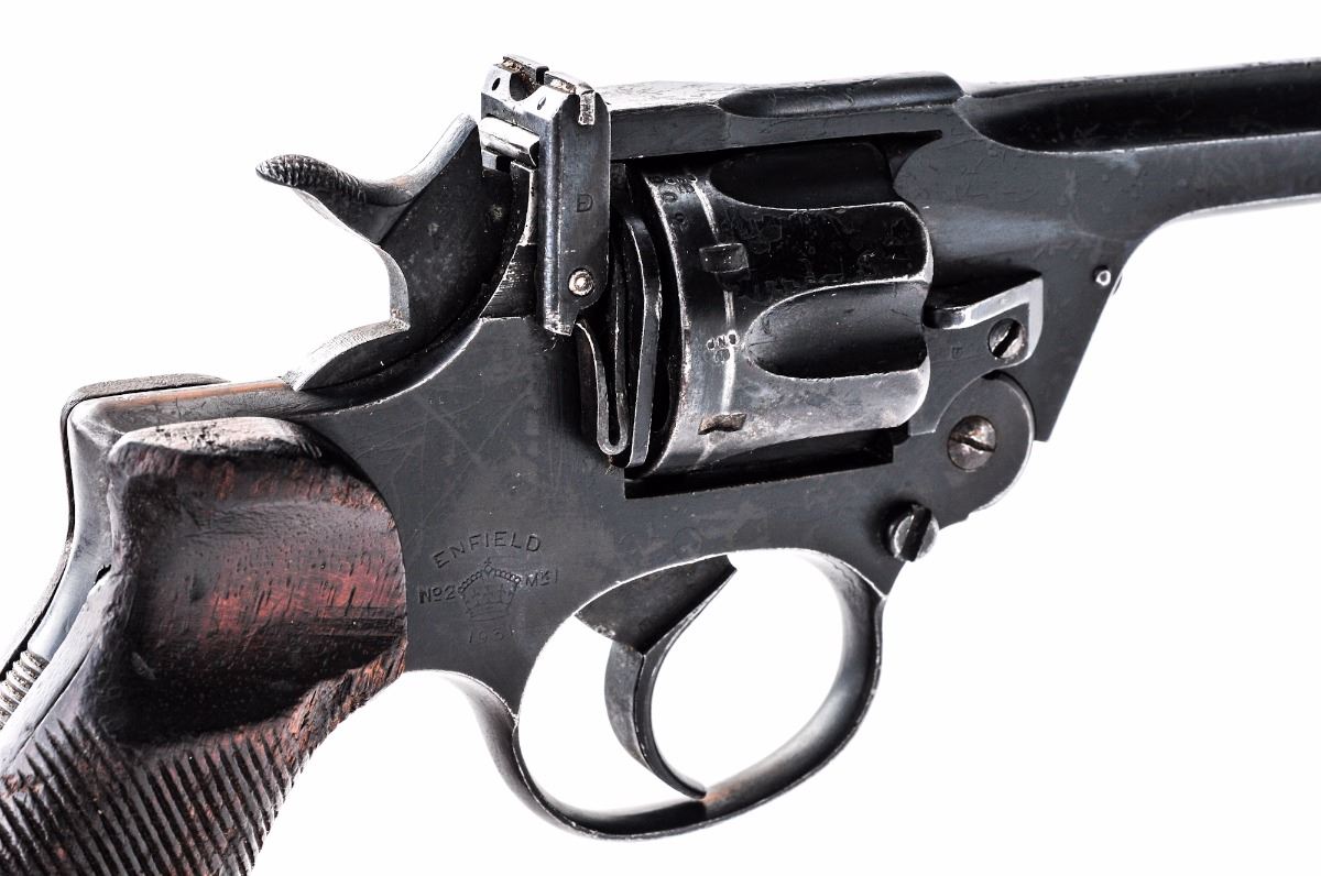 Enfield No. 2 MK I Double Action Revolver, #5902, .38-200 (.38 S&W) cal., 5'' barrel, black painted finish over blue, striated wood thumbrest grips, blade front sight and square notch rear sight. Right side of frame marked ''Enfield/No2/(crown)/Mk1/1931'', with several British proofs. Condition is fair. While the action can be manipulated to function, it needs the attention of a qualified gunsmith. Grips show flattening to the striations and small losses near front of butt. Bore is bright. Est.: $150-$300. (C&R)