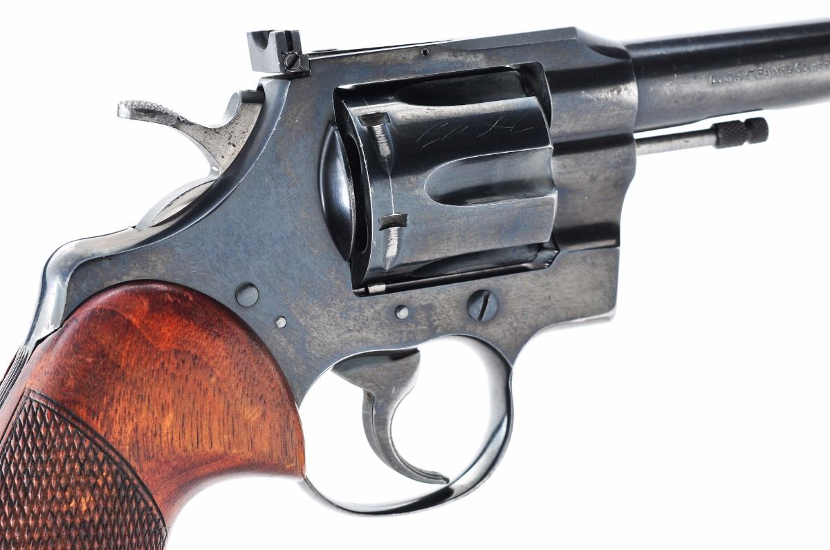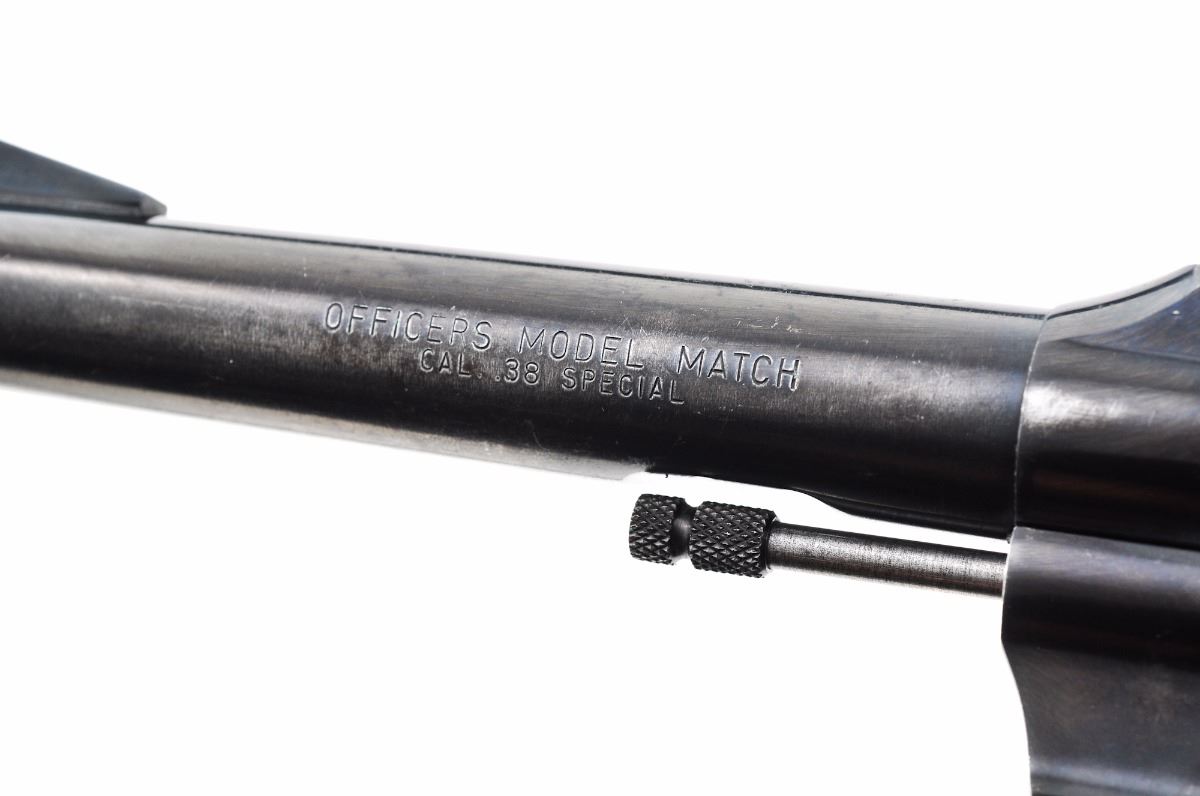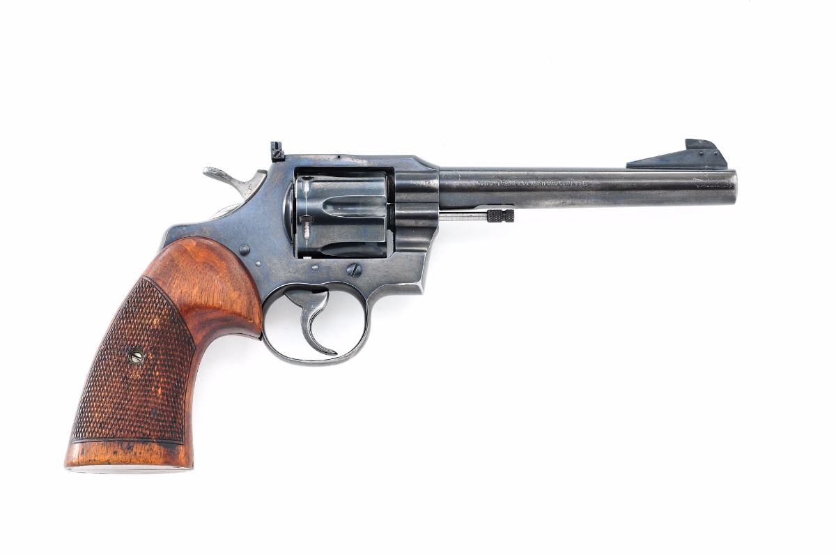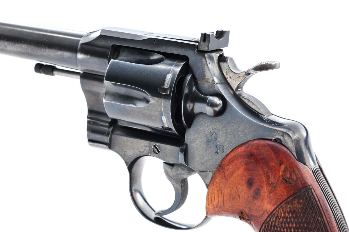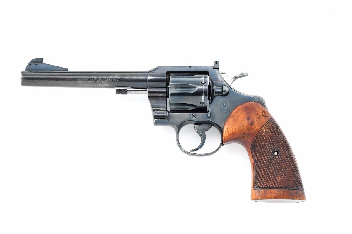 Colt Officer's Model Match Double Action Revolver, #911891, .38 Spec. cal., 6'' barrel, blue finish, aftermarket checkered walnut grips. Condition is fine retaining approx. 90% blue showing highpoint edgewear. Action is tight, bore is excellent with bright lands and grooves. Est.: $1,200-$1,800. (C&R/PPT)