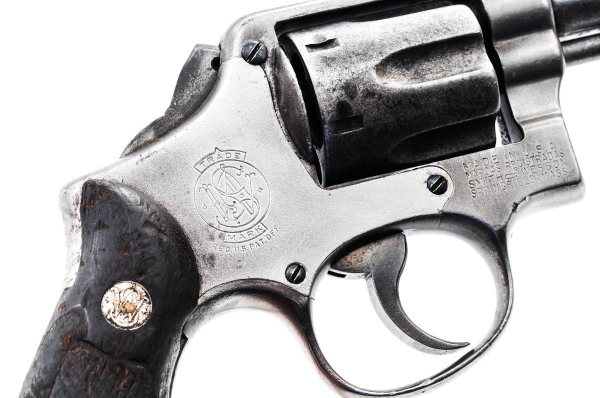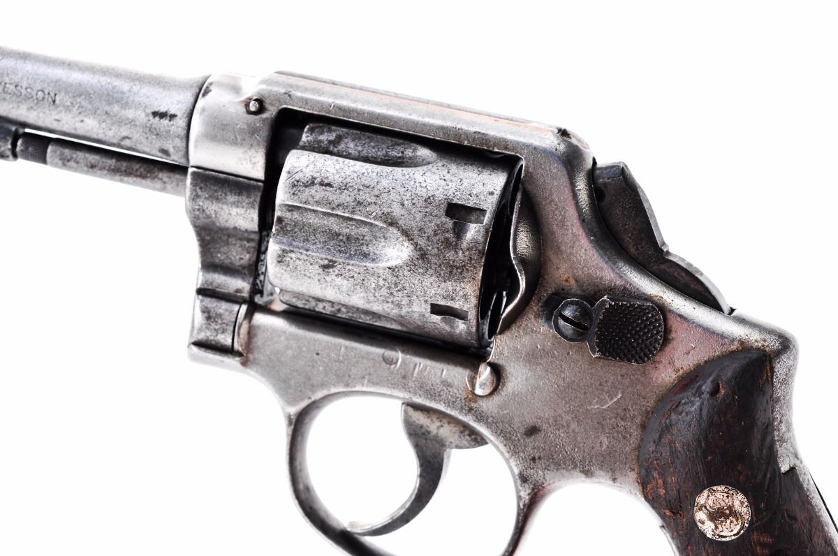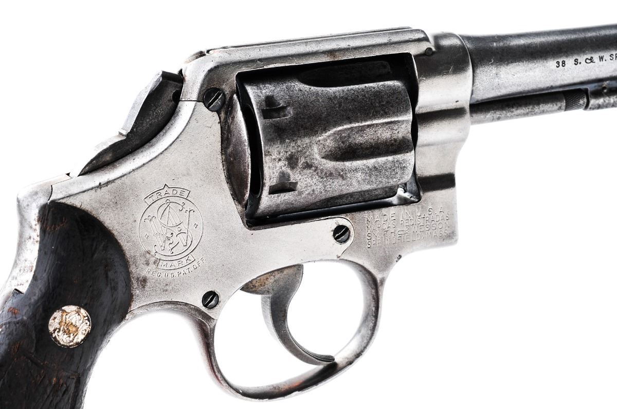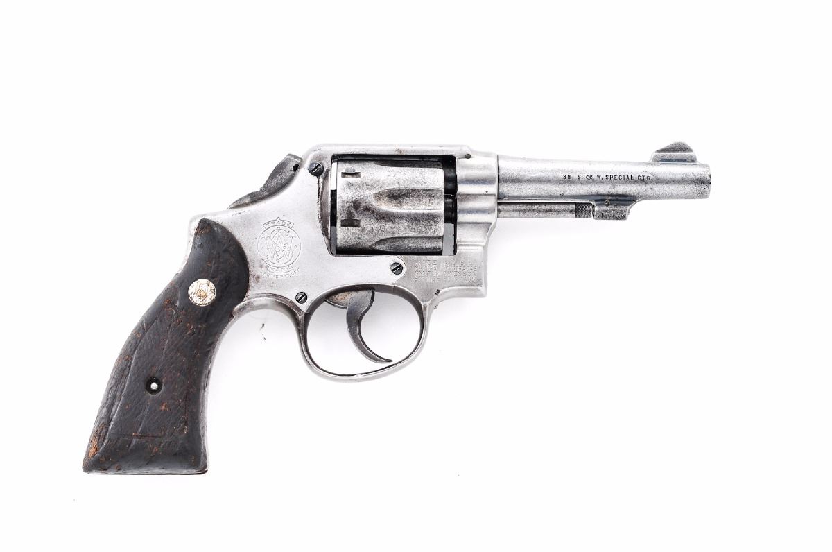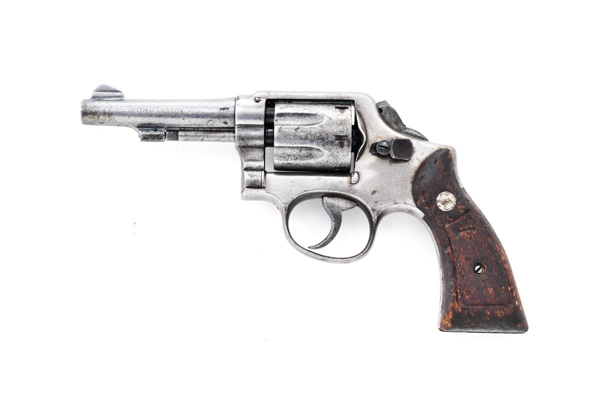 Smith & Wesson M&P Double Action Revolver, #179564, .38 Spec. cal., 4'' barrel, blue finish, checkered walnut grips, ramped blade front sight and frame channel rear sight. Import marked under barrel. Condition is fair with almost no original finish remaining. All metal surfaces are uniformly lightly pitted overall. Grips are poor. Action is locked up, bore is rough. Gunsmith examination before firing is highly advised. Est.: $150-$250. (C&R)