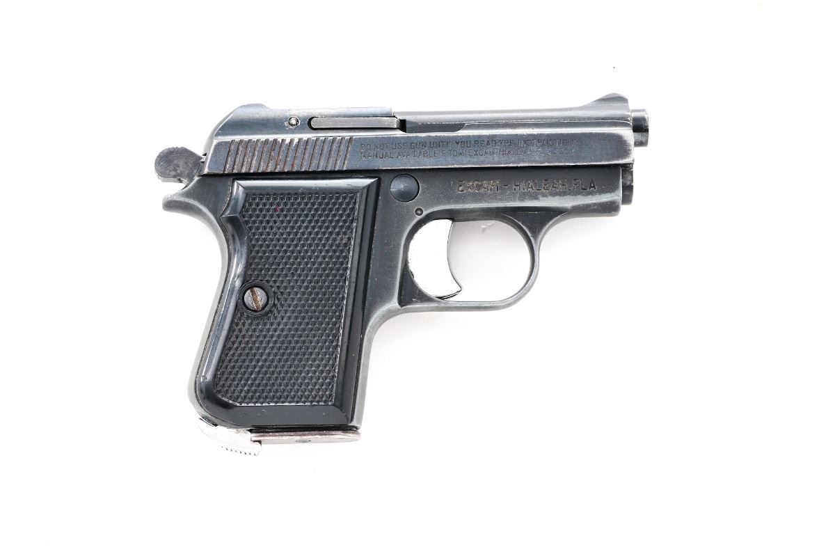 Armi Tanfoglio Model GT 27 Semi-Automatic Pistol, #M94034, .25 ACP cal., 2.5'' barrel, blue finish, checkered black plastic grips, blade front sight and square notch rear sight, with one magazine. Import marked ''Excam-Hialeah, Fla.'' Condition is very good retaining approx. 85% original finish with slight loss at muzzle. Action is tight, bore is bright with slight frosting. Est.: $100-$250. (Modern) (Not available to Calif. residents.)