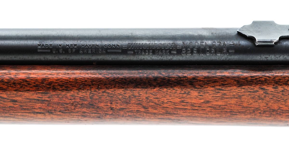 Winchester Model 67A Single Shot Bolt Action Rifle, .22 S-L-LR cal., 20'' barrel, blue finish, smooth walnut stock, brass bead/blade front sight and elevator leaf rear sight. Condition is near new retaining approx. 99% original finish with slight high edge loss at the muzzle and triggerguard. Stock is excellent retaining about 98% of its original varnish with a few light pressure dents and micro-scratches. Action is tight, bore is bright. Est.: $250-$400. (C&R)