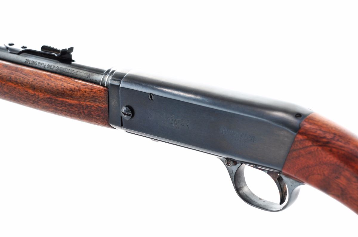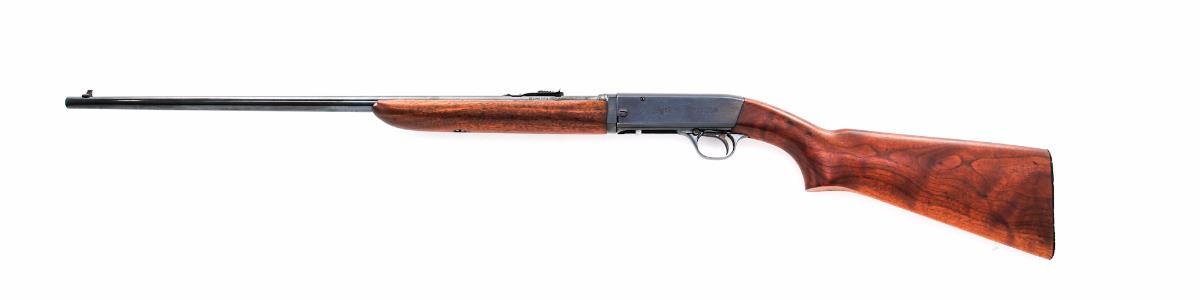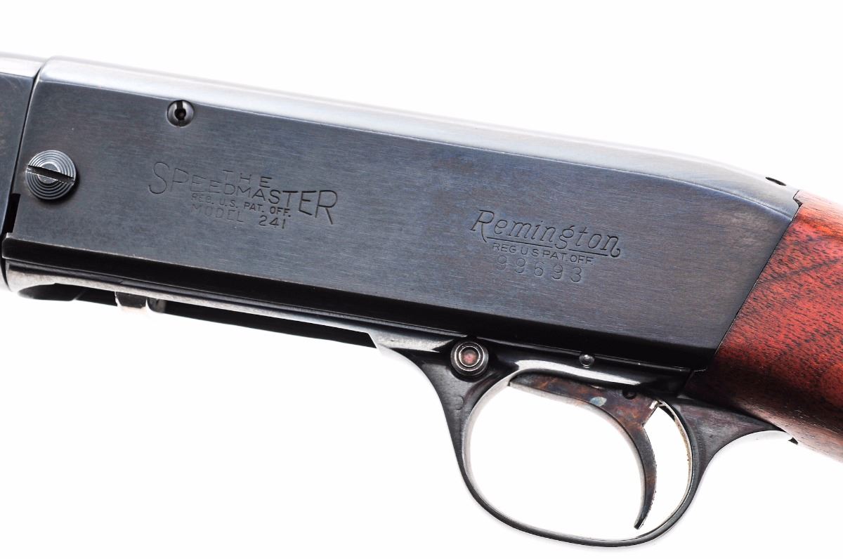 Remington Speedmaster 241 Takedown Semi-Automatic Rifle, #99693, .22 LR cal., 24'' barrel, blue finish, smooth two-piece walnut stock, blade/bead front sigh and elevator leaf rear sight. Condition is excellent retaining nearly all of its original finish, with one spot of oxidation on barrel near breech. Stock is excellent with randomly scattered small pressure dents. Aluminum buttplate is excellent with bright spots around the edges. Action is tight, bore is bright. Est.: $400-$600. (C&R)