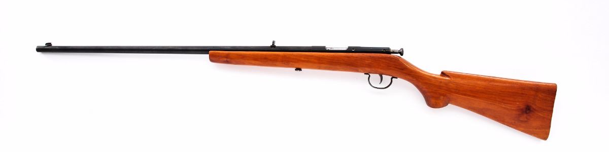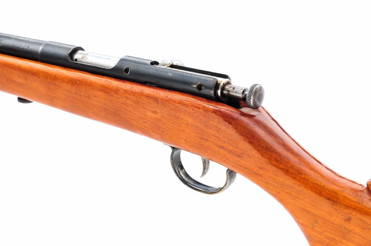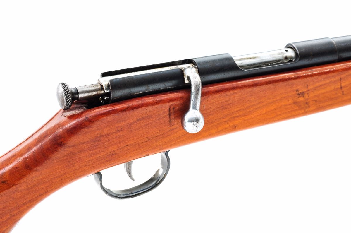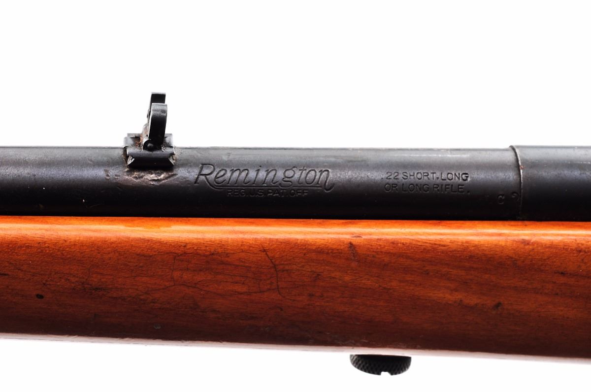 Remington Model 33 Bolt Action Rifle, NVSN, .22 S-L-LR cal., 24'' barrel, blue finish, pistol-grip hardwood stock, missing buttplate, bright bolt, dovetailed blade front sight and notched folding rear sight. Condition is good retaining approx. 90% toning blue with scattered pinprick pitting. Front sight with impressions to both edges. Stock with dings and mars, and has been sanded with an additional coat of varnish. Left side of receiver is tapped for sight. Action and bore are excellent. Est.: $150-$250. (C&R)