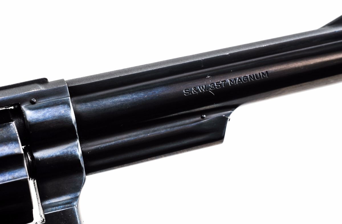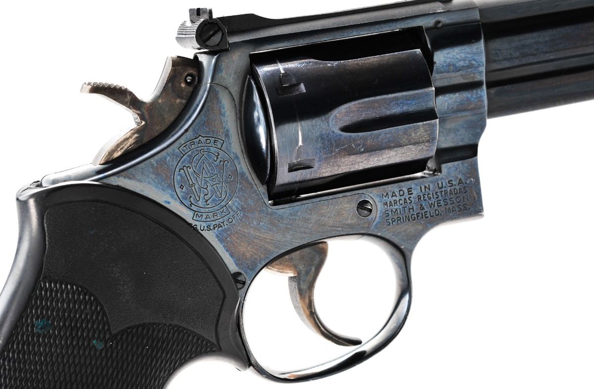 Smith & Wesson Model 19-4 Double Action Revolver, #56K1264, .357 mag. cal., 6'' barrel, blue finish, blue and case hardened hammer and trigger, Pachmayr gripper grips, with standard trigger and hammer, Patridge front sight, pre-81 pinned barrel, with rebated cylinder. Condition is excellent with moderate index light to cylinder and minor scratches. Grips and action are crisp, bore is bright. Est.: $350-$500. (Modern/PPT)