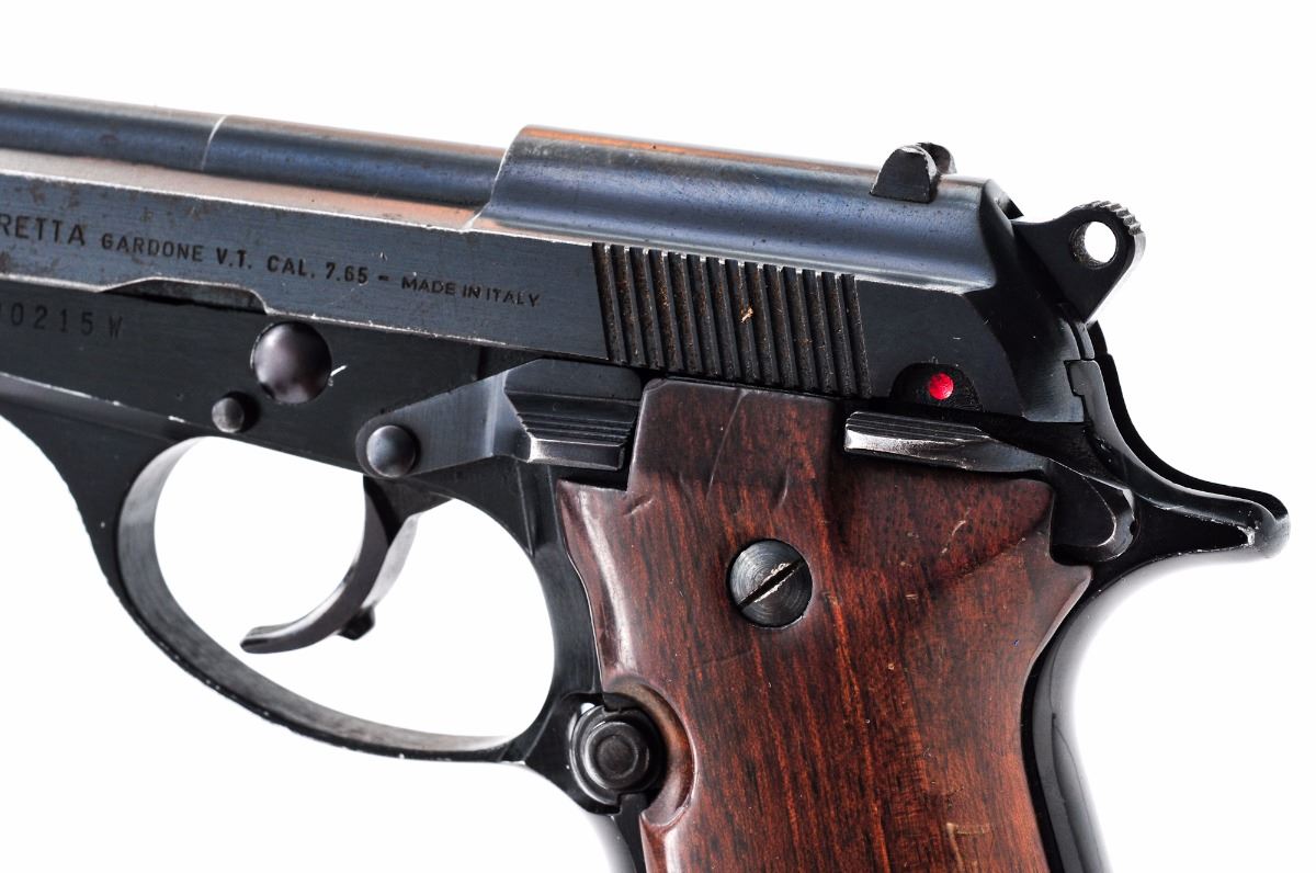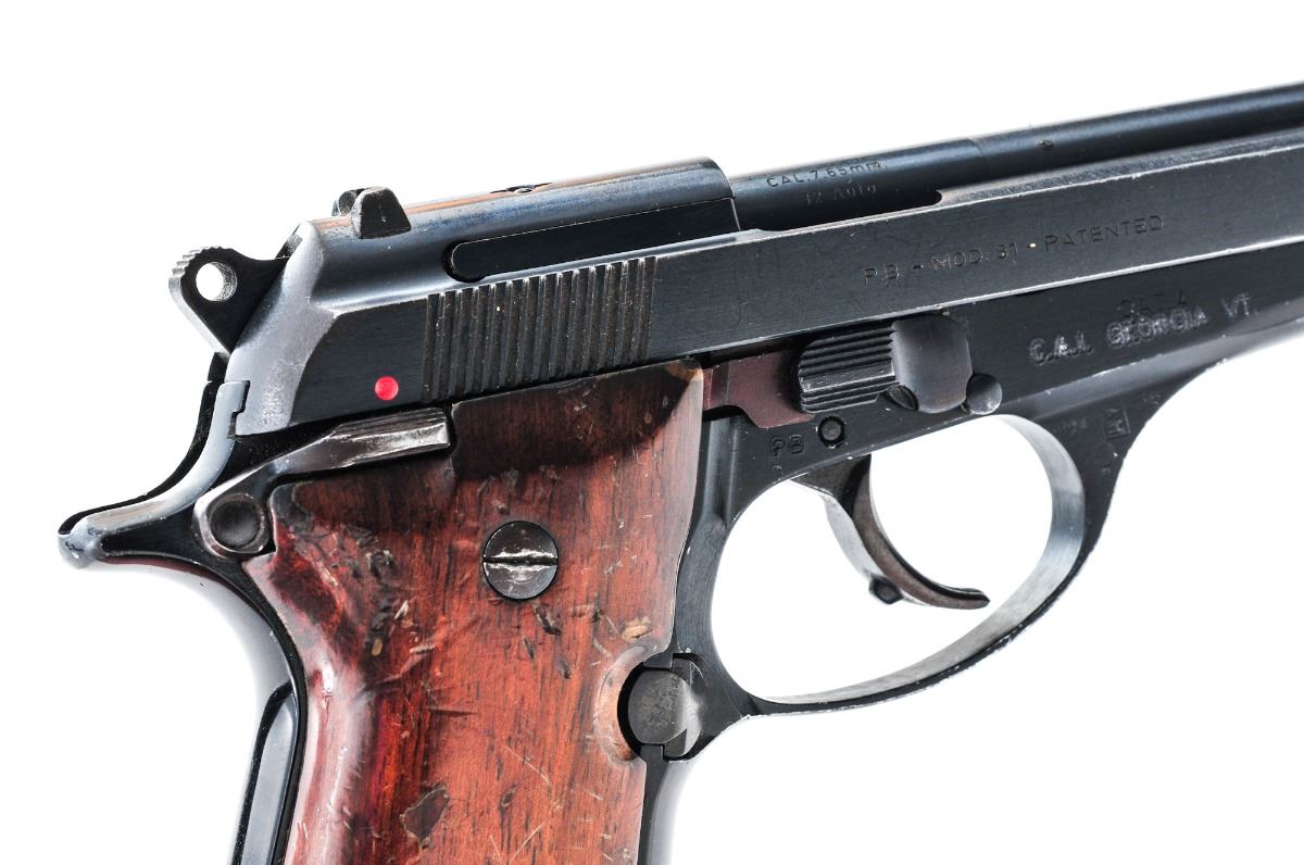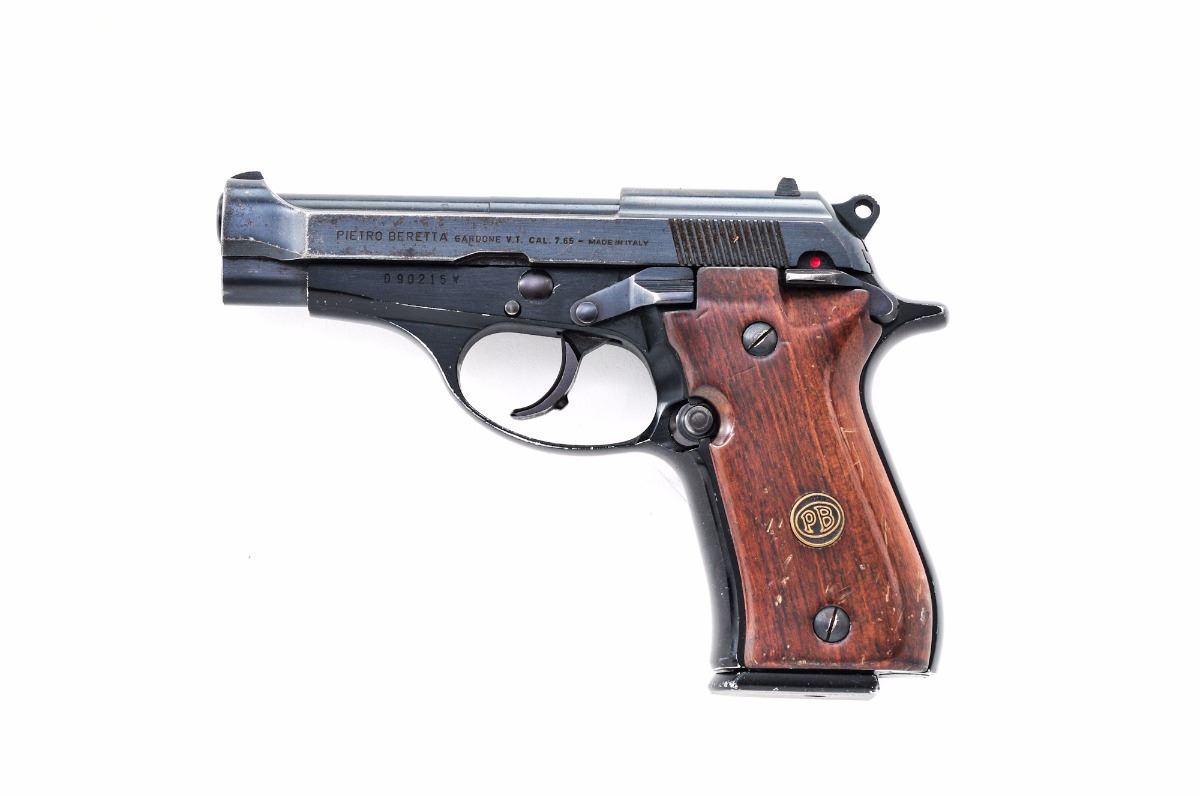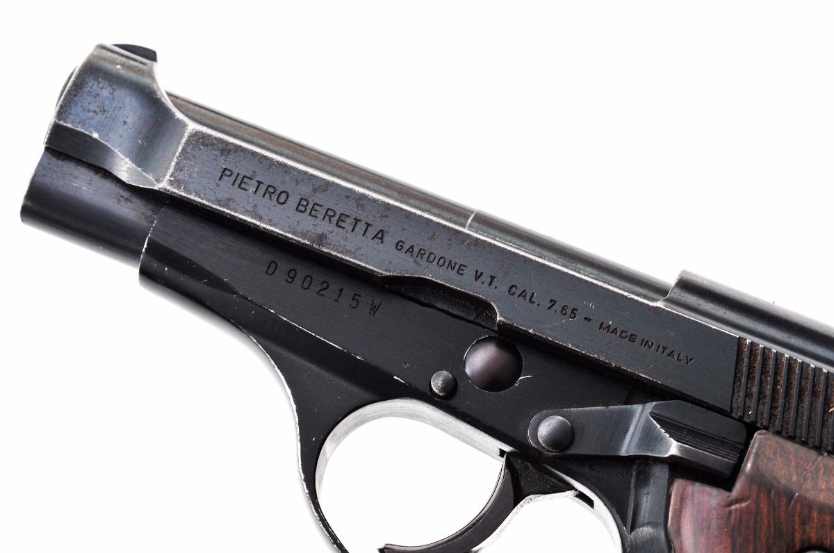 Beretta Model 81W Cougar Semi-Automatic Pistol, #D90215W, .32 ACP cal., 3.8'' barrel, blue finish, smooth brown wooden grips, blade front sight and dovetailed square notch rear sight, with one magazine. Import marked on right side of frame. Condition is very good retaining approx. 95% original finish with oxidation marks along both sides of slide and in grasping grooves. Frame shows minor losses to the anodizing on high edges of triggerguard. Grips are heavily dented on the right panel with minor varnish losses, and minor dents on the left panel with light scratches. Action is tight, bore is bright. Est.: $175-$225. (Modern) (Not available to Calif. residents.)